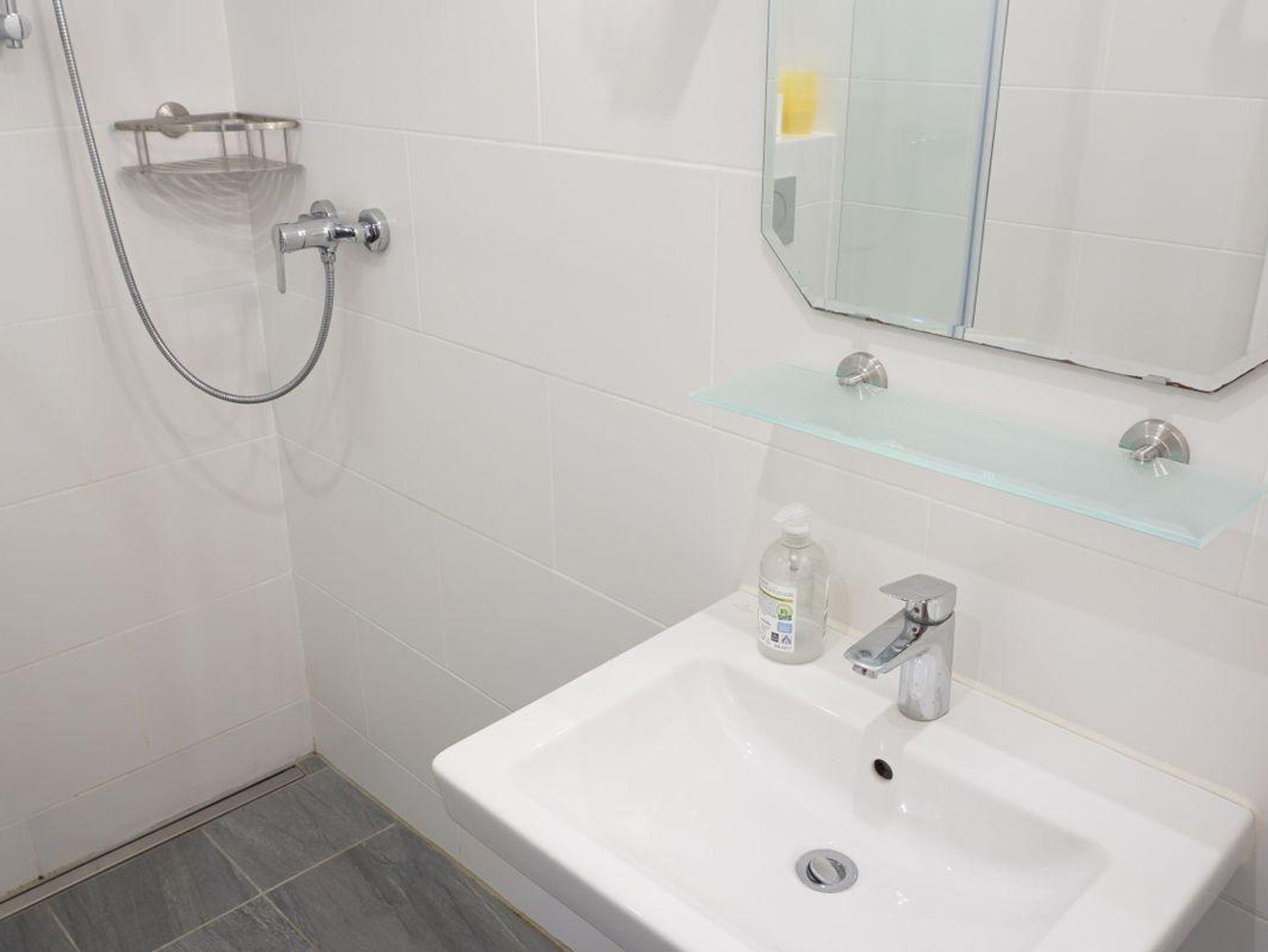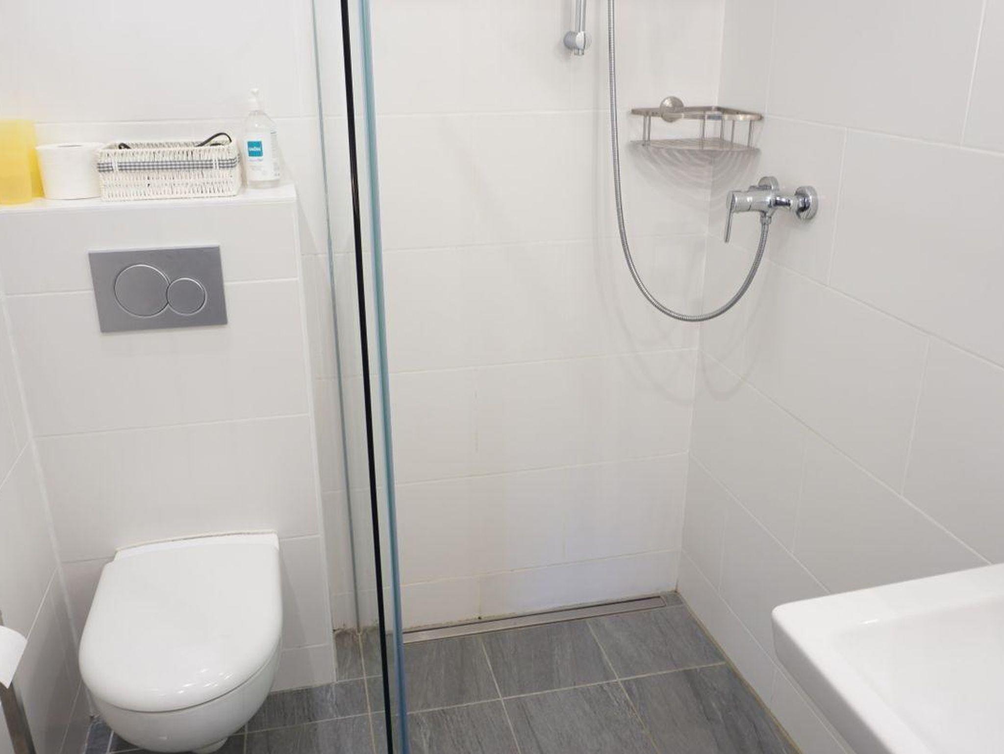 Das Badezimmer verfügt über eine bodengleiche Dusche, Waschbecken, Spiegel, WC und Haartrockner.. Ein Gemeinschaftswaschraum mit Waschmaschine ergänzt das Angebot. Zur weiteren Ausstattung zählen ein Bügeleisen, Bügelbrett, Wäscheständer, Staubsauger und eine Garderobe.