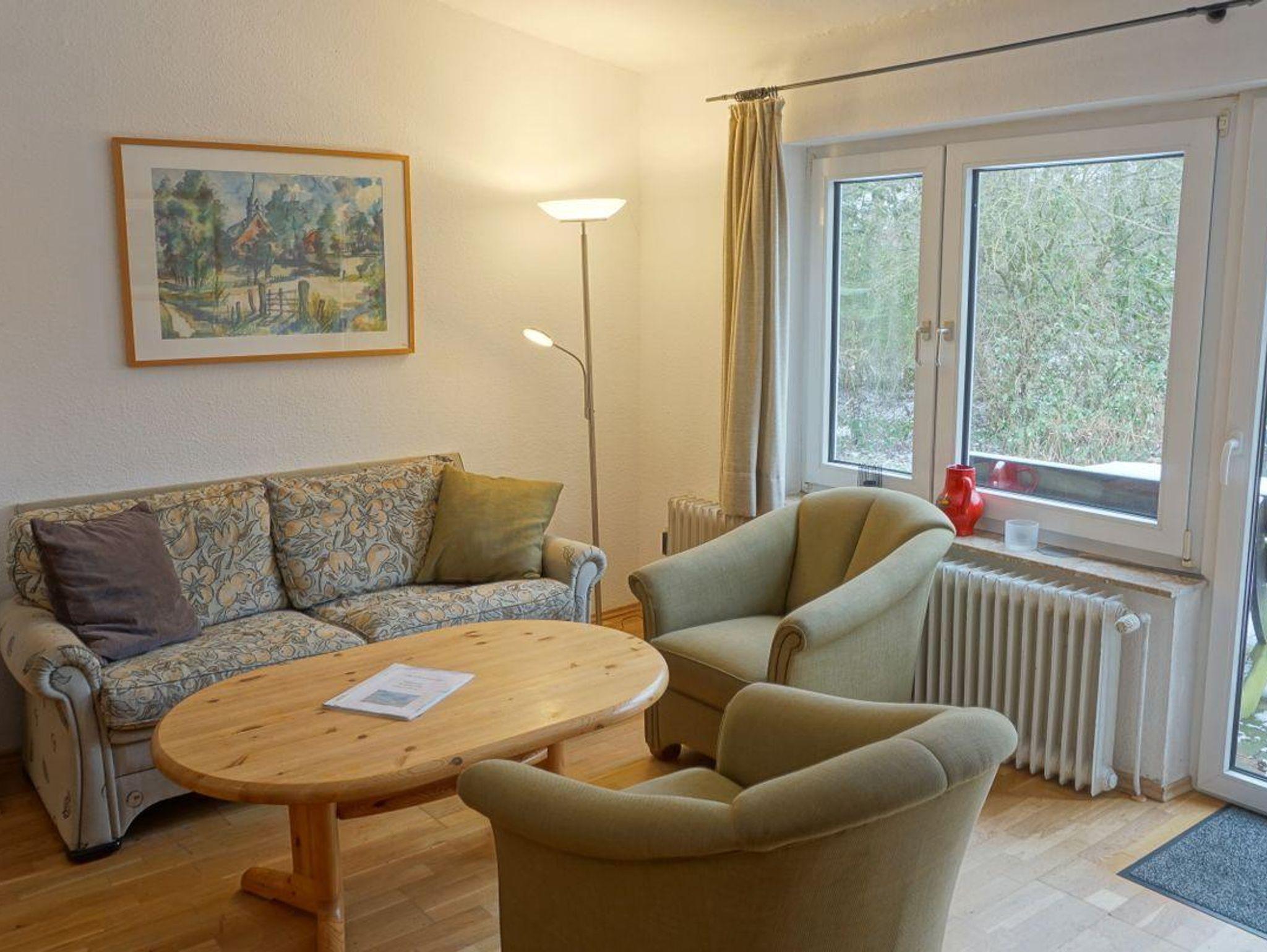 Das helle Wohnzimmer verfügt über Parkettboden und ist mit einem gemütlichen Sofa und einem Sessel eingerichtet. Die Sofaecke lädt nach einem erlebnisreichen Tag zum Entspannen ein. Ein TV mit digitalem Satellitenanschluss sowie ein Blu-ray-Spieler sorgen für Unterhaltung, und dank vorhandenem WLAN bleiben Sie auch während Ihres Aufenthalts stets online. Gesellschaftsspiele stehen Ihnen zur Freizeitgestaltung ebenso zur Verfügung.