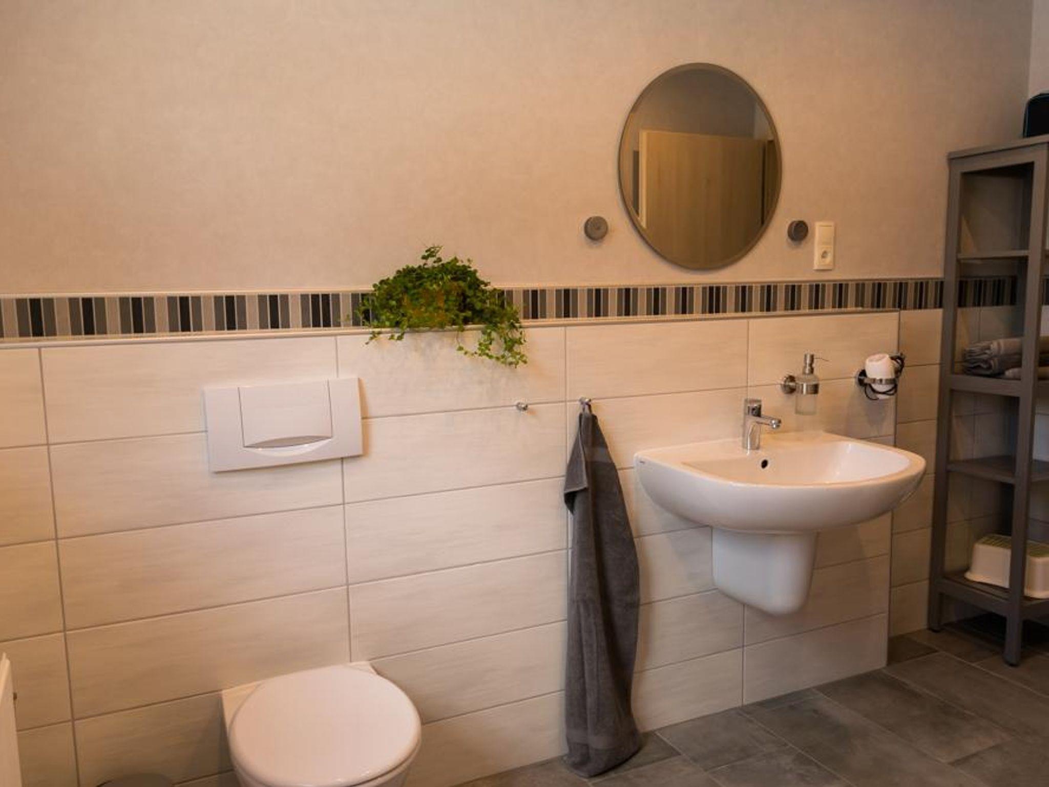 Ein großes Badezimmer vollendet die Wohnung. Der Eingang erfolgt über eine Außentreppe.