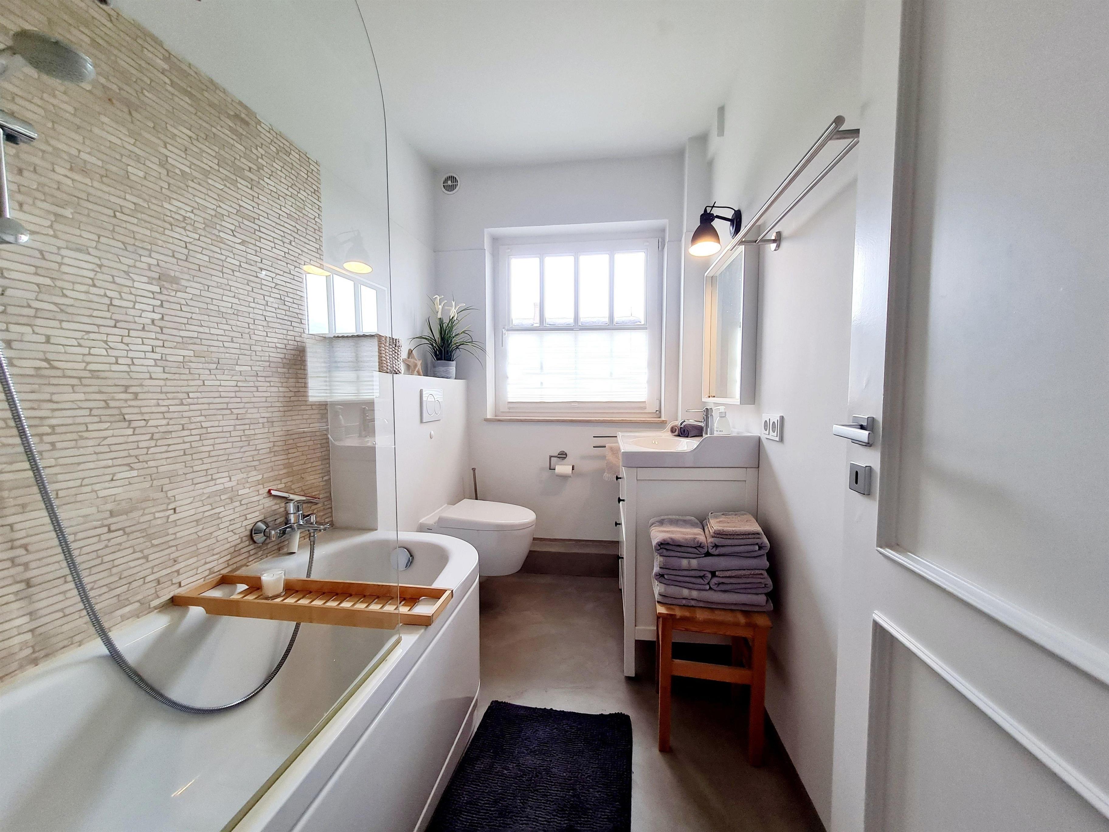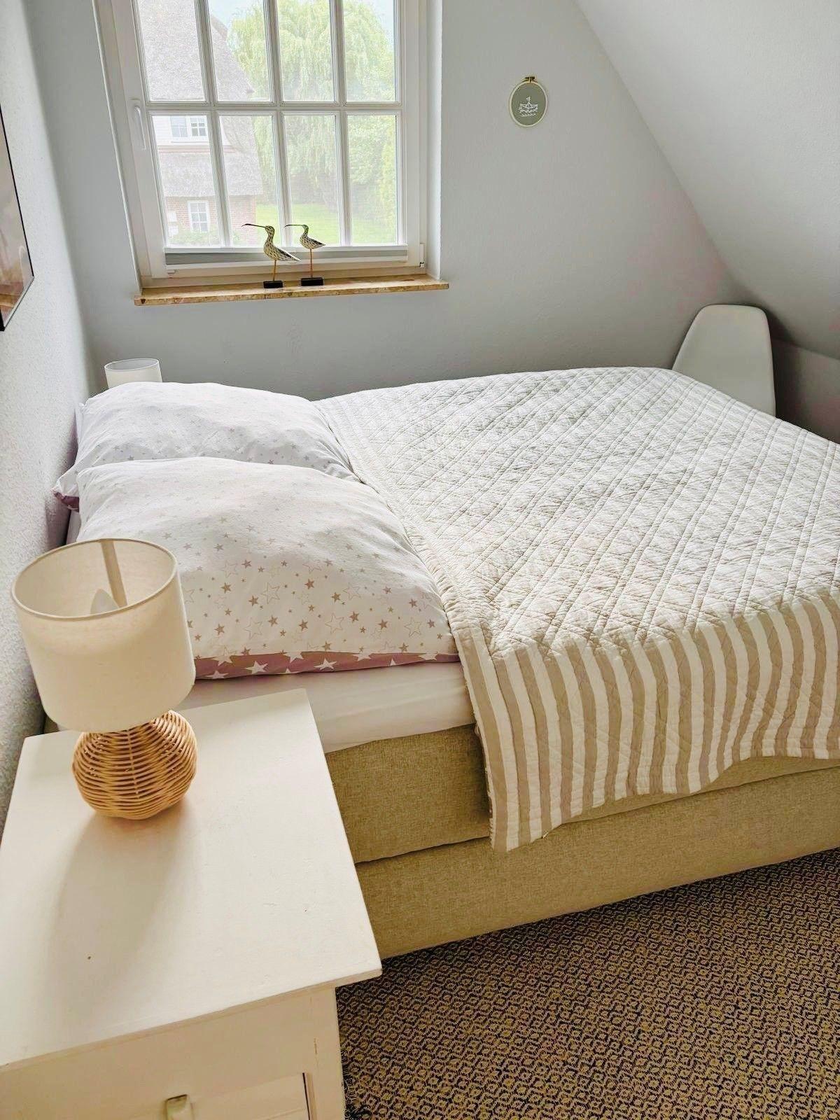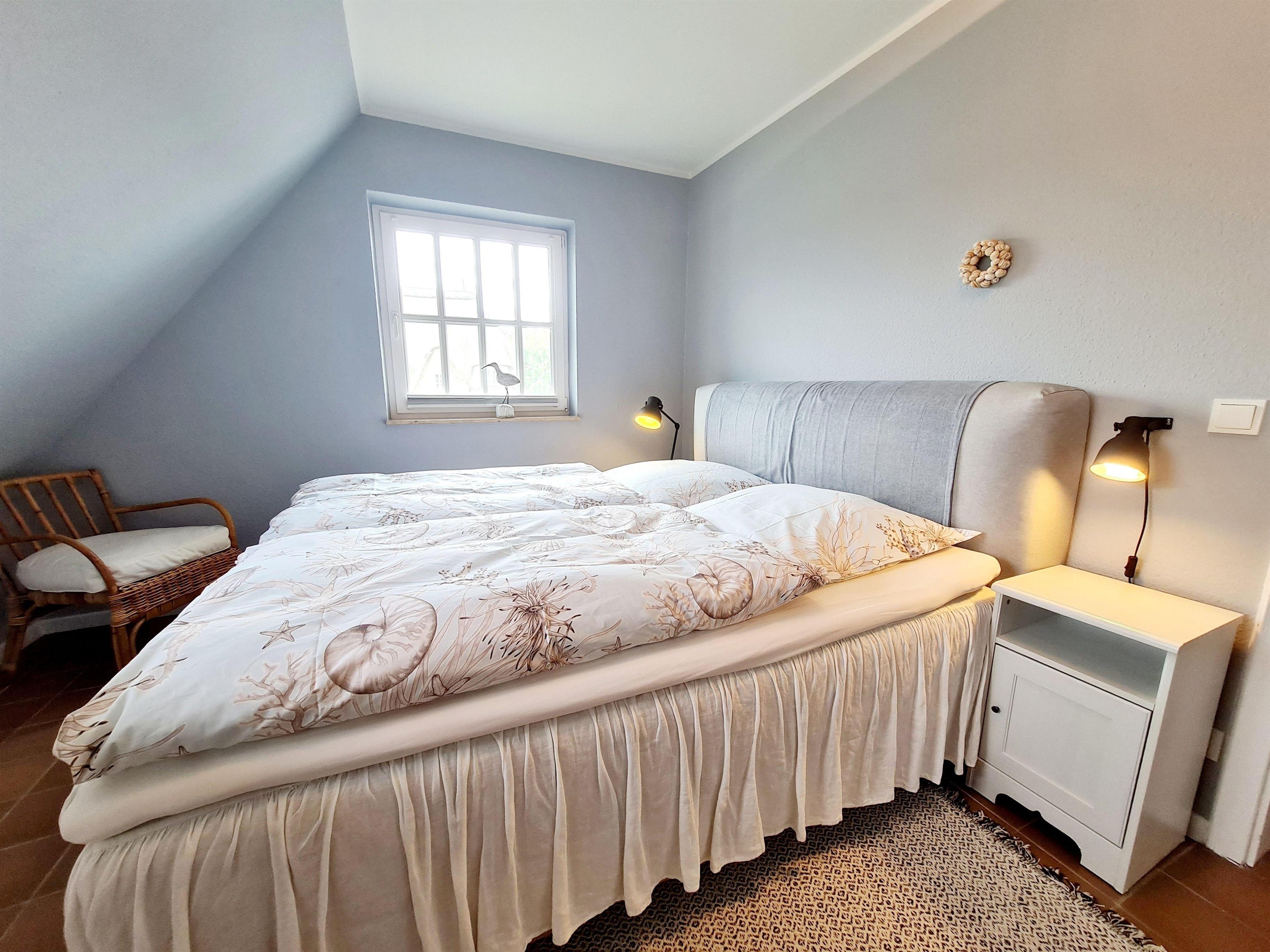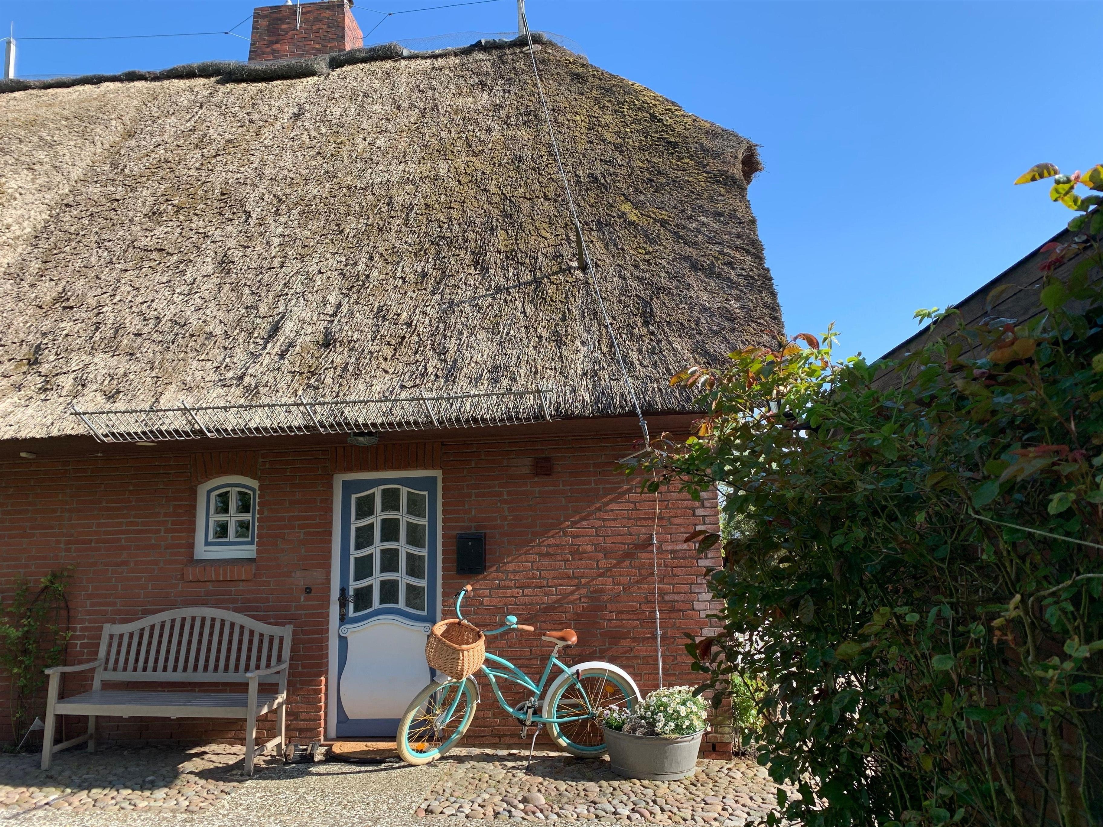 Im Erdgeschoß befindet sich außerdem das Gäste WC mit Waschmaschine und Trockner. Im Obergeschoß (gemütlich unter Reet ) befinden sich 2 separate Schlafräume (1 Boxspringbett 1.80x2.00 und 1 Doppelbett 1.40x2.00) mit genügend Schrankraum sowie das komfortable Bad mit Badewanne.