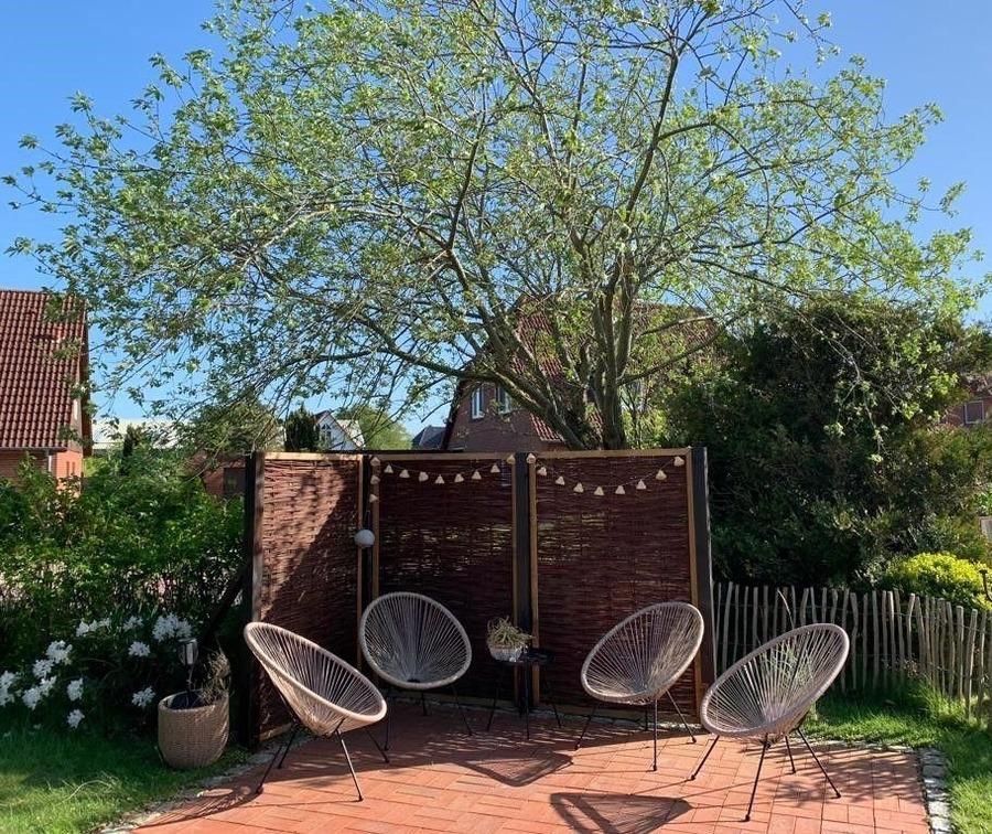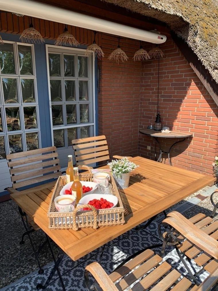 Zum Ferienhaus gehören eine wunderschöne Terrasse mit Sitzmöbeln und zum Entspannen ist ein Strandkorb vorhanden. Selbstverständlich gehört ein KFZ-Stellplatz sowie eine gemeinschaftliche Garage für Fahrräder, Kinderwagen etc. dazu.