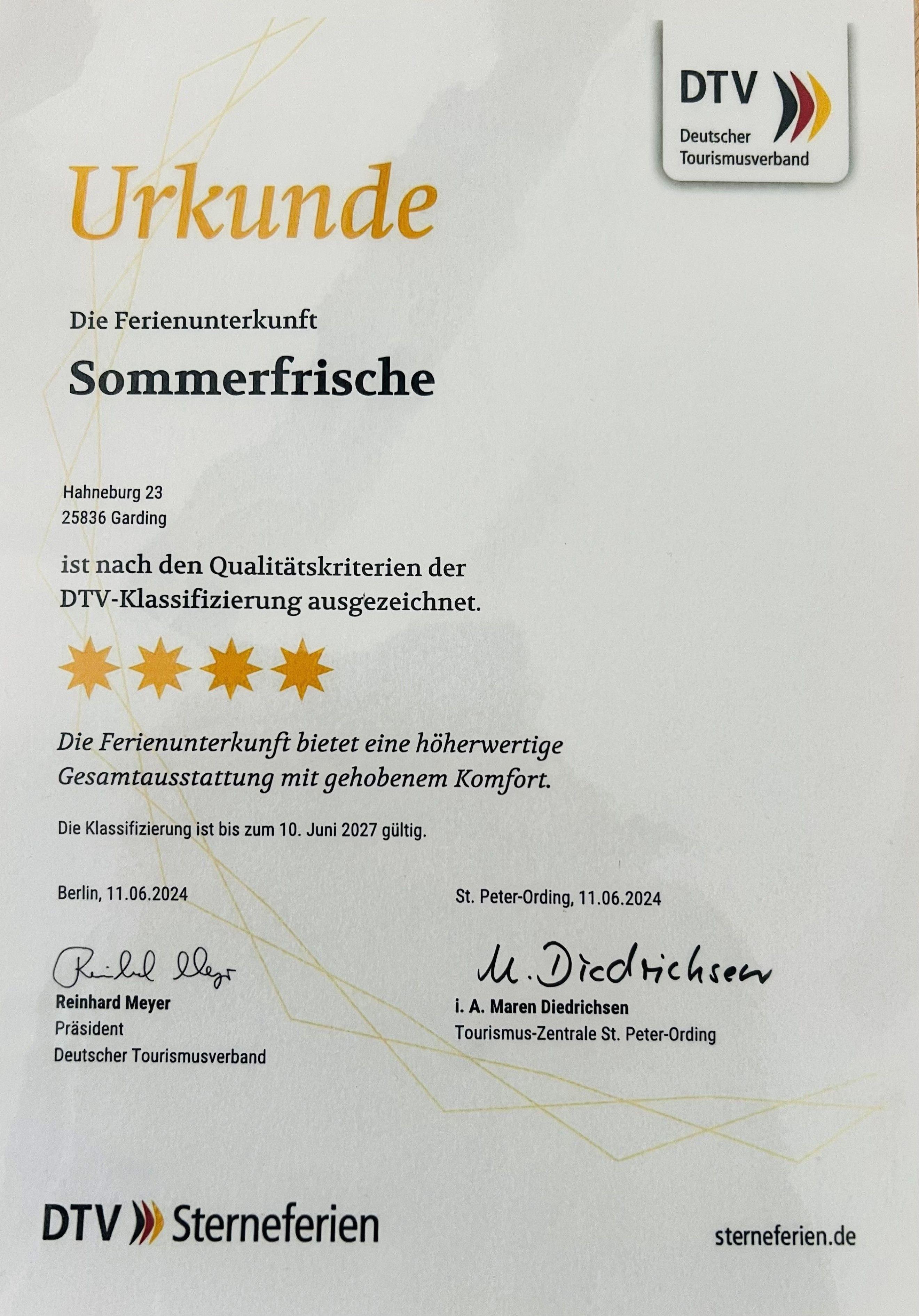 Das Haus Sommerfrische ist mit 4 Sternen vom DTV unter ID 261703 klassifiziert. (Laufzeit 06/2027)