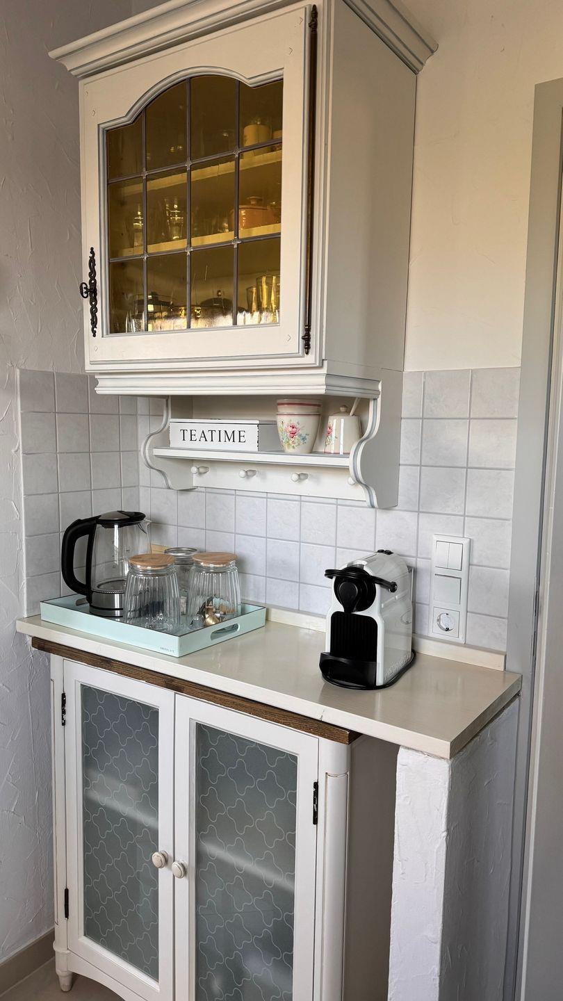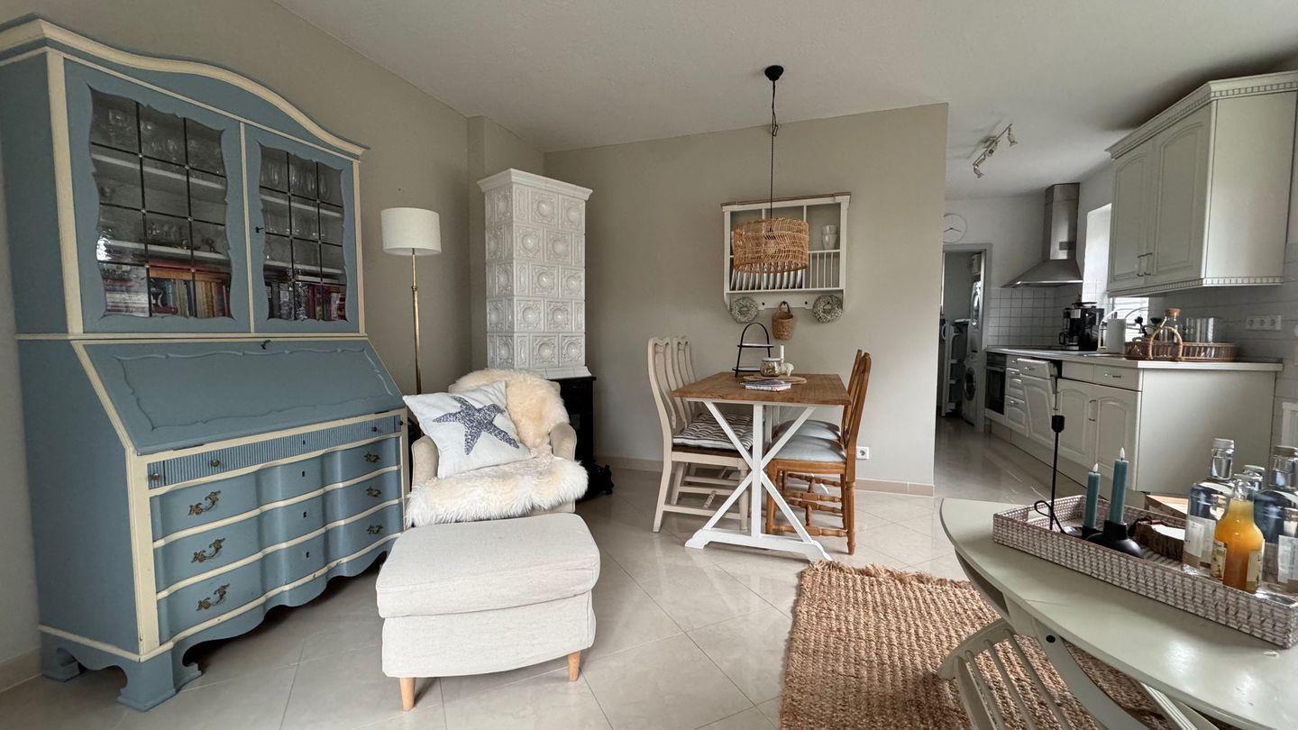 Wohn-Essbereich mit offener Küche, ausgestattet mit Cerankochfeld, Geschirrspülmaschine, Backofen, Wasserkocher, Toaster, Kaffeemaschine und Mixer. Einen großen Kühlschrank mit Gefrierfach, Mikrowelle, Waschmaschine und Trockner, Bügelbrett und Bügeleisen finden Sie zusätzlich im daneben liegenden Hauswirtschaftsraum.