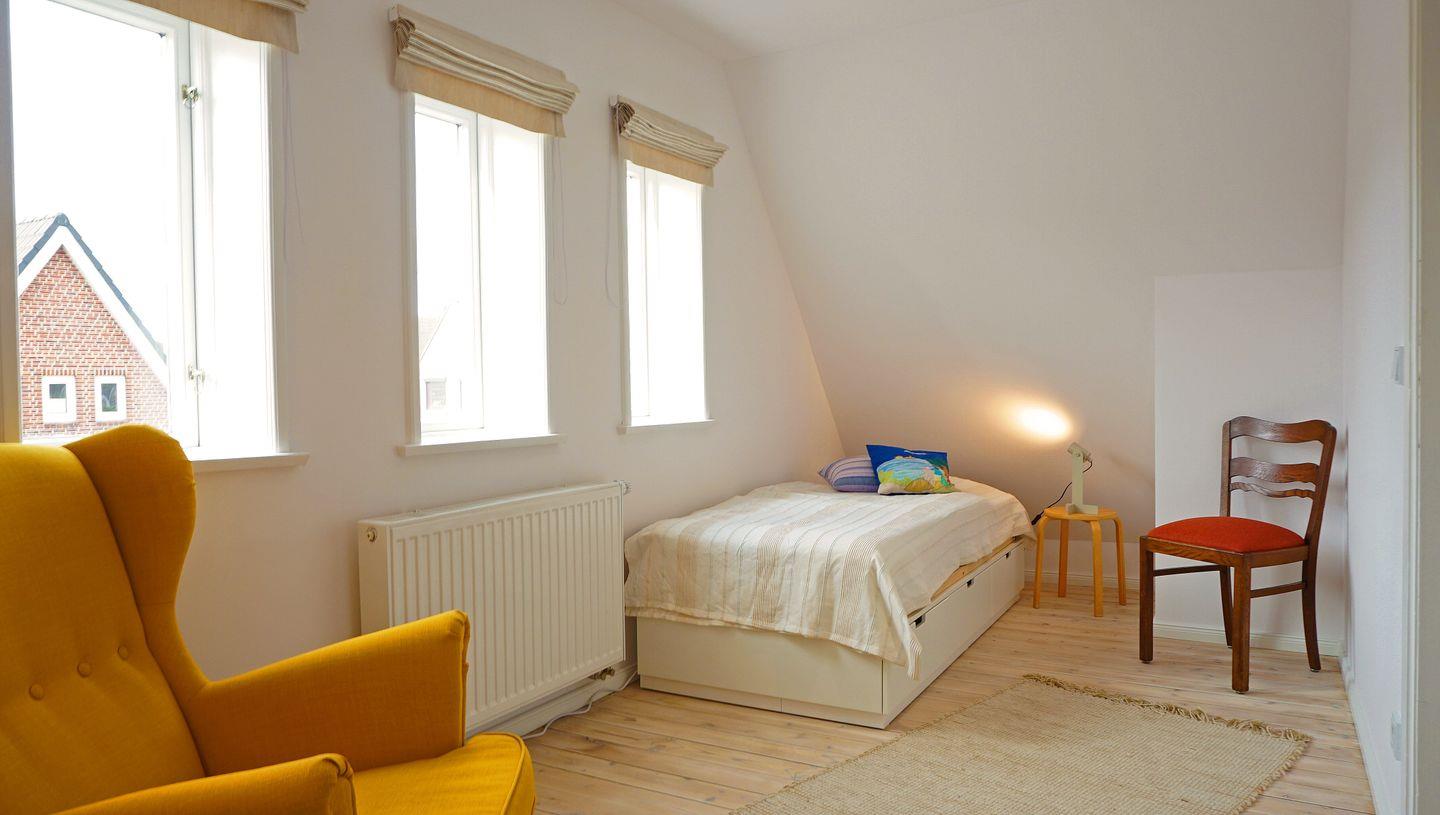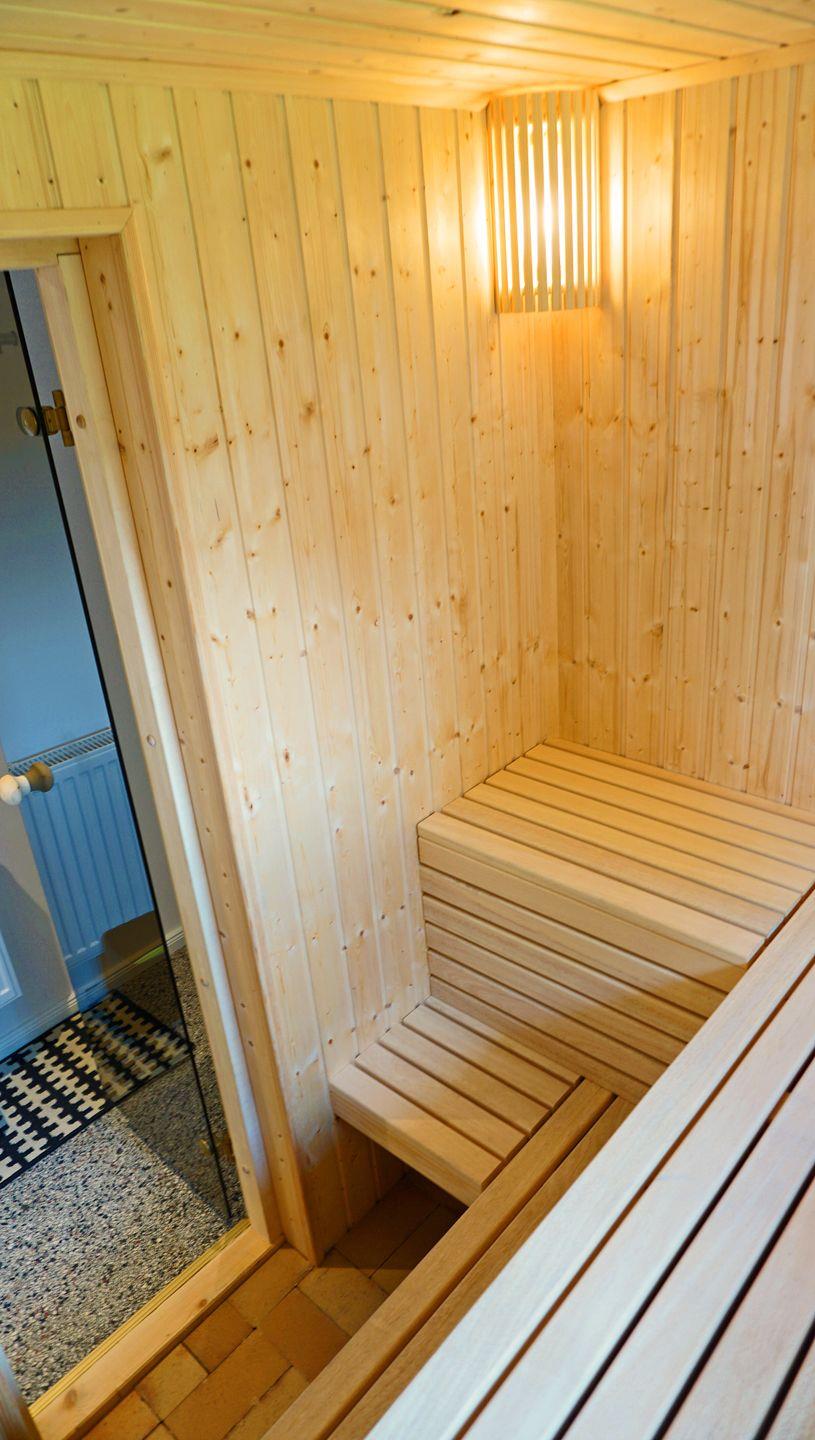 Im Erdgeschoss befinden sich außerdem ein Schlafzimmer mit Doppelbett (160 x 200 cm) ,Duschbad und eine Sauna mit Außenbereich und Strandkorb. Im Obergeschoss erwarten Sie ein großes Studio mit Doppellbett (200x200cm) mit anschließendem Bad (En Suite), sowie das Westzimmer mit zwei Einzelbetten, das in den Abendstunden von der Sonne geflutet wird.