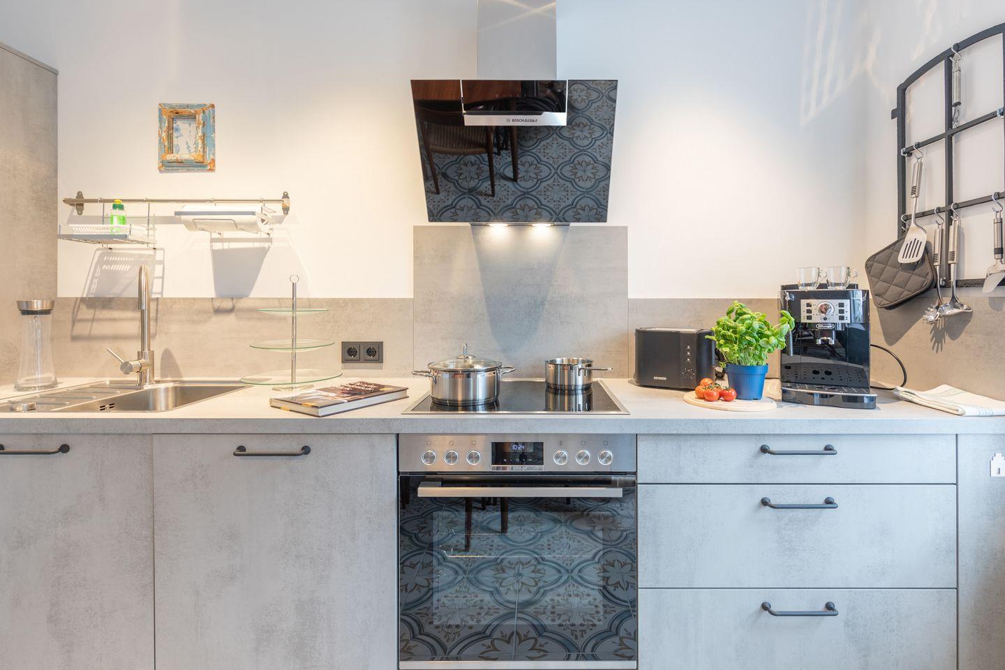 Das Wohnzimmer ist gemütlich eingerichtet mit einem großen Sofa, Sesseln, großem Flachbild-TV und einem Schrankbett (geeignet für max. 1 Erwachsenen + 1 Kind, 140 x 200). In der Wohnküche kommen Hobbyköche auf ihre Kosten: Kühl-Gefrierkombination, Induktionsherd, Backofen, Geschirrspülmaschine, Kaffeemaschine (Vollautomat), Toaster, Wasserkocher und Ceranfeld. Genießen Sie am großen Esstisch ein köstliches Familiendinner, ein ausgiebiges Urlaubsfrühstück oder gesellige Spieleabende.