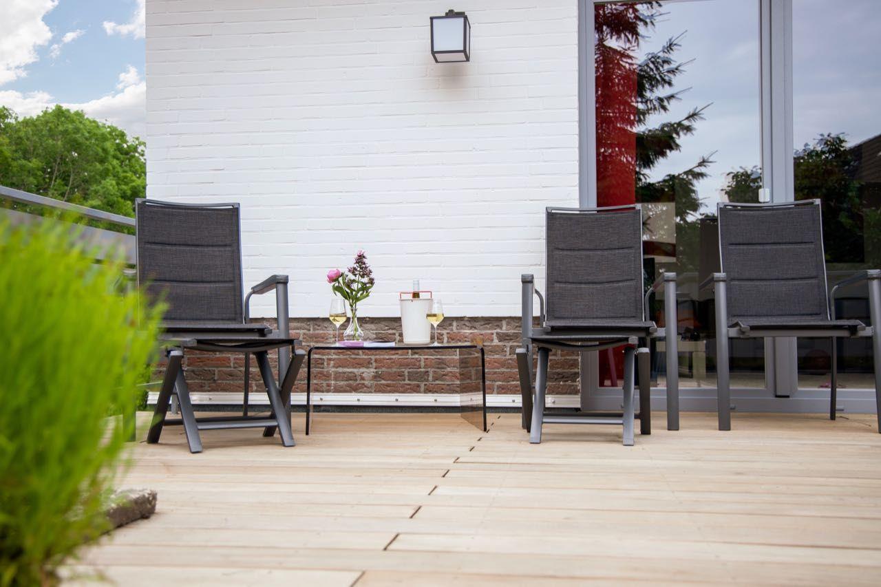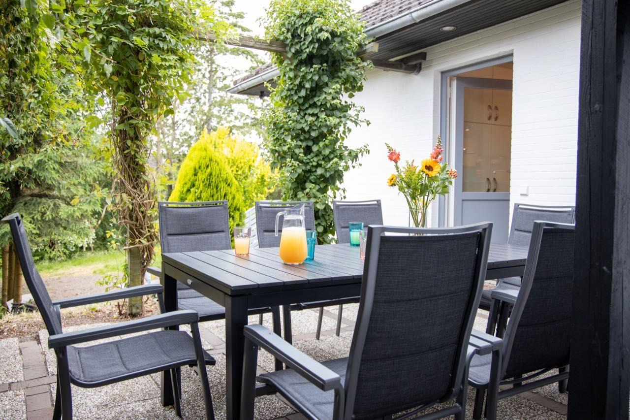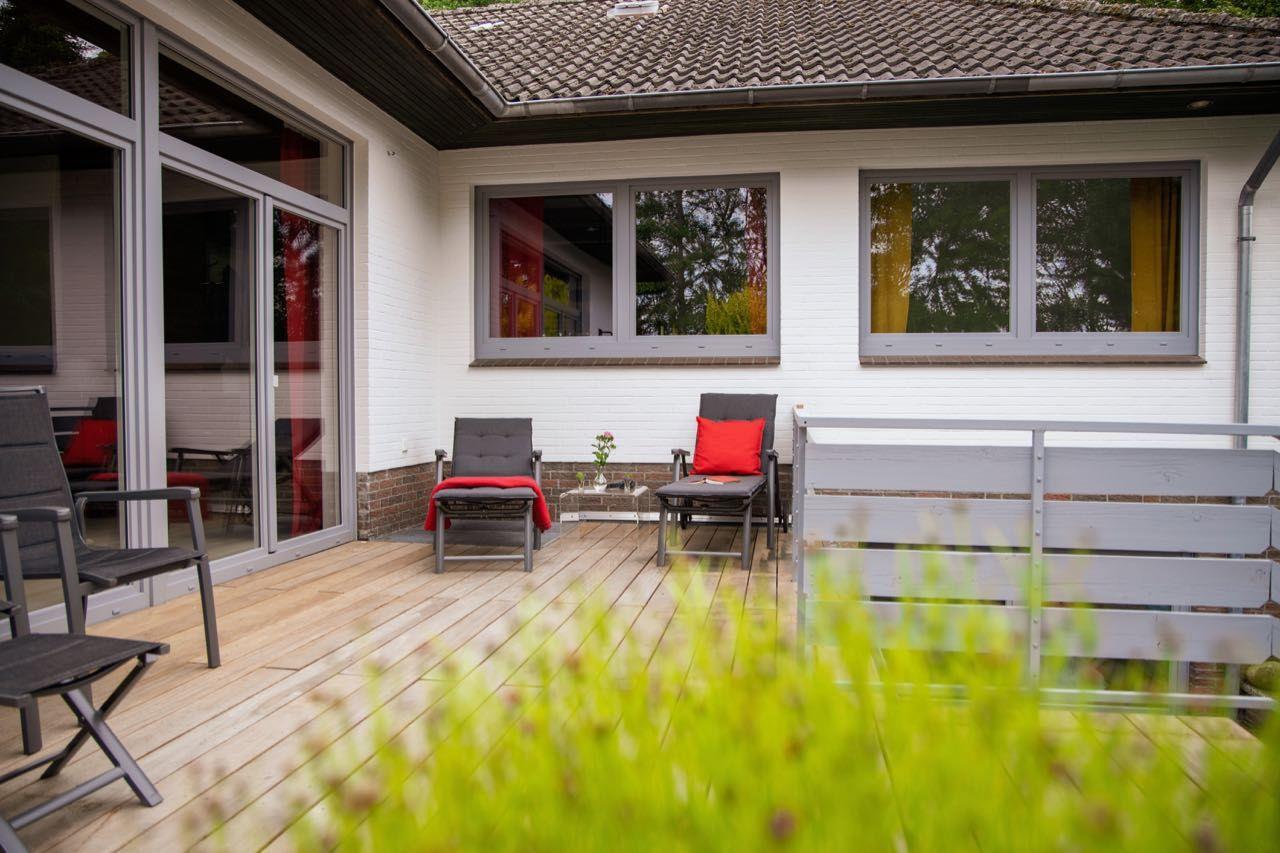 Groß ist nicht nur das Haus selbst sondern auch der Garten, der gleich an einen kleinen See angrenzt. Auf 4 Terrassen kann man sich entspannt die Nordseeluft um die Nase wehen lassen, während der Grill noch anheizt und die Getränke kühlen.