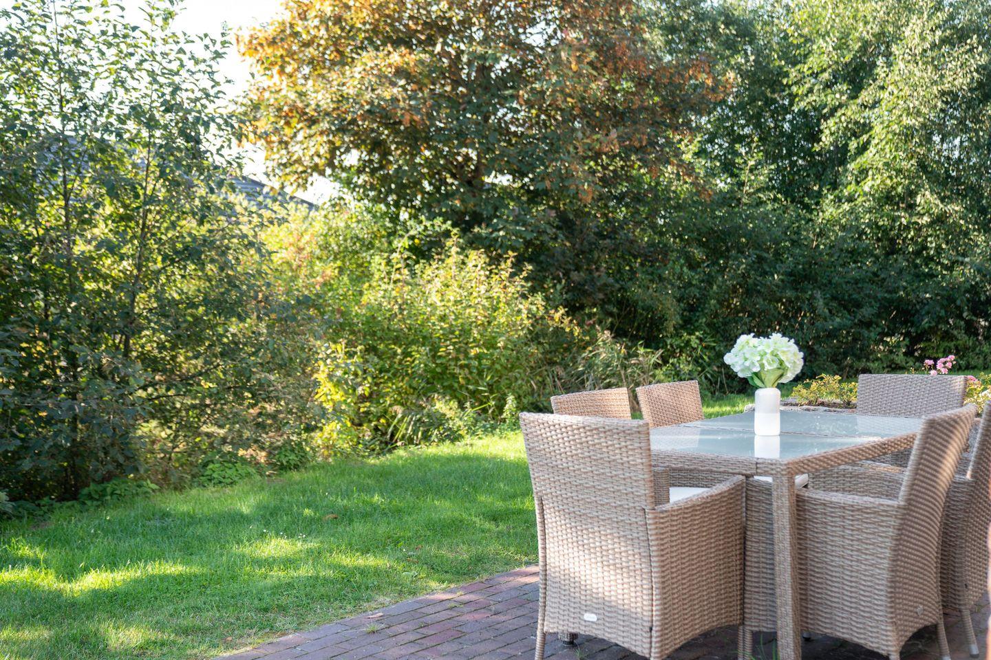 Das Erdgeschoss öffnet sich zur überdachten Terrasse mit Grill. Im weitläufigen Garten mit Liegewiese, Gartenmöbeln und eigenem Strandkorb genießen Sie entspannte Stunden an der frischen Nordseeluft. Auch ein Balkon mit Blick ins Grüne sorgt für erholsame Momente. Für Autos steht ein privater, kostenfreier Parkplatz direkt am Haus bereit.
