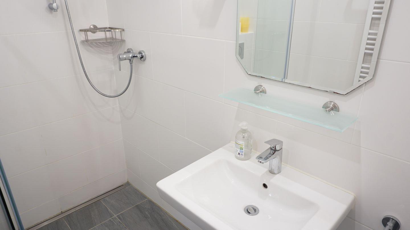 Das Badezimmer verfügt über eine bodengleiche Dusche, Waschbecken, Spiegel, WC und Haartrockner.. Ein Gemeinschaftswaschraum mit Waschmaschine ergänzt das Angebot. Zur weiteren Ausstattung zählen ein Bügeleisen, Bügelbrett, Wäscheständer, Staubsauger und eine Garderobe.
