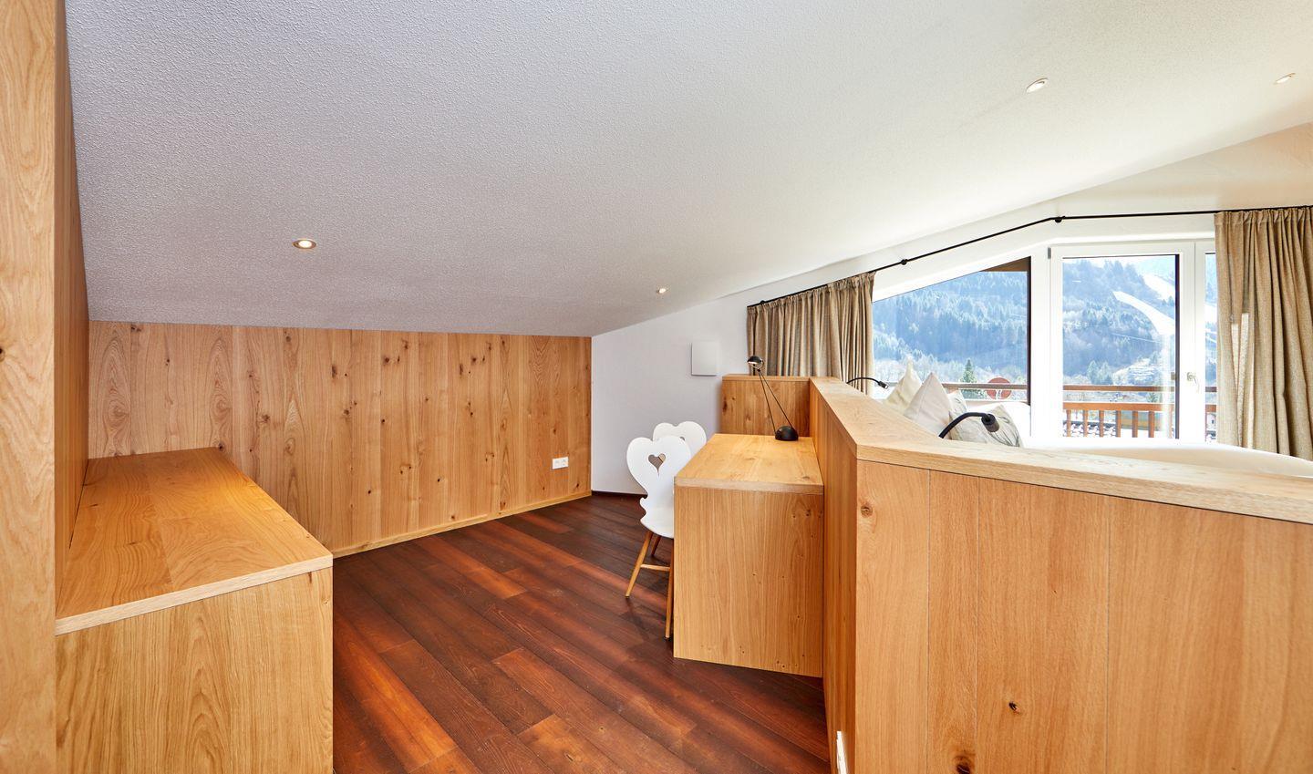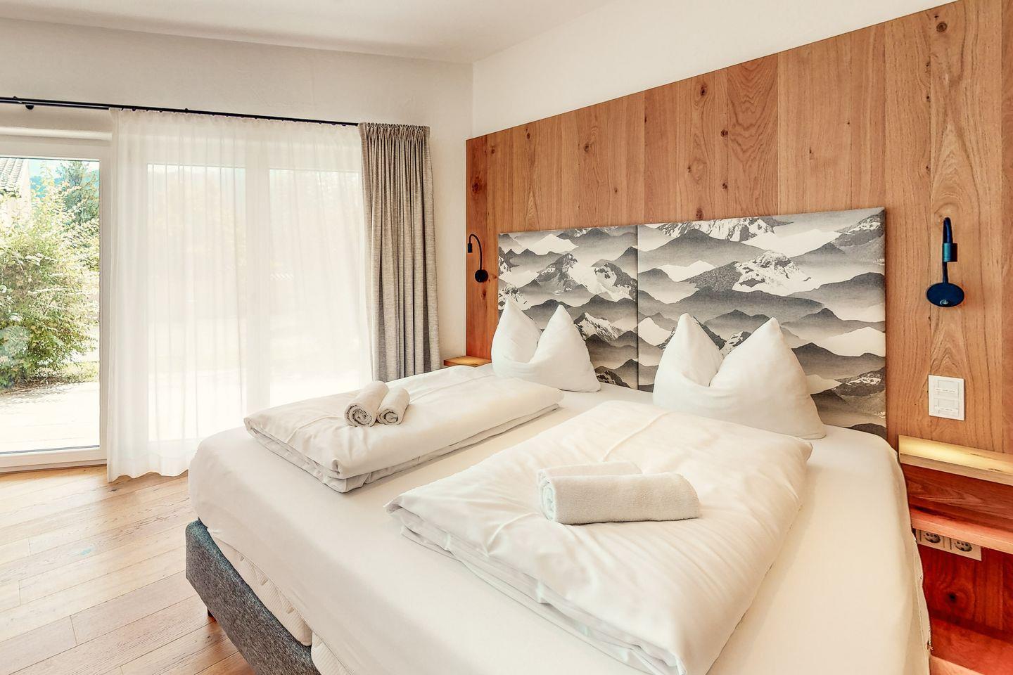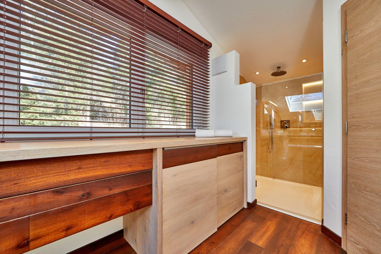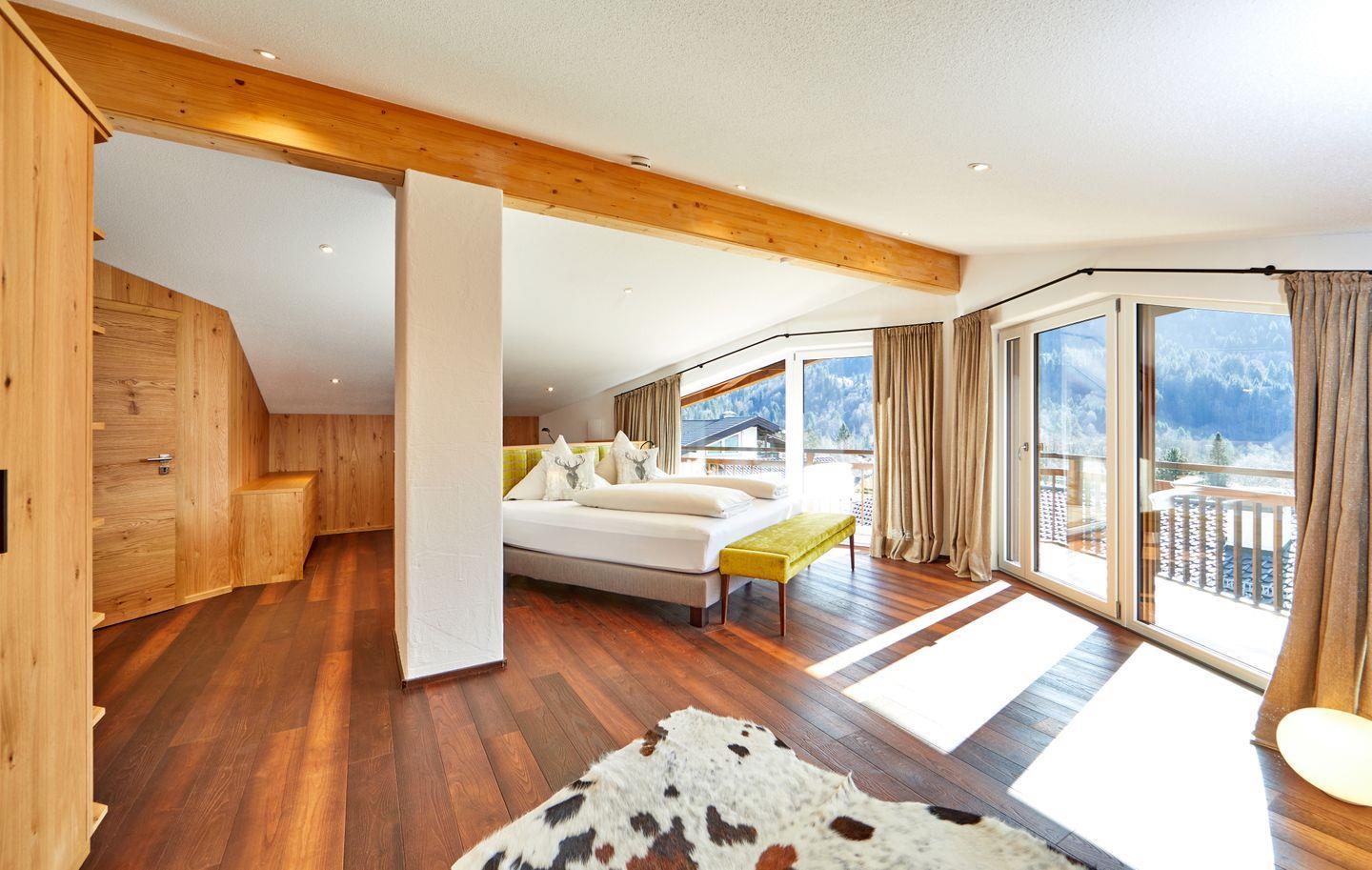 Im Dachgeschoss verfügen Sie über ein großes Schlafzimmer mit Boxspringbetten und angrenzendem Badezimmer. Hier erwartet Sie durch die Fensterfront oder vom Balkon ebenfalls ein grandioser Blick auf das Wettersteingebirge mit Alpspitze und Zugspitze.