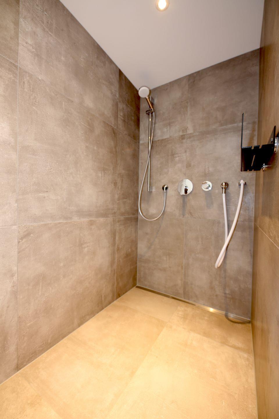 Das moderne, lichtdurchflutete Bad ist mit einer großen Badewanne und einer Regendusche ausgestattet.