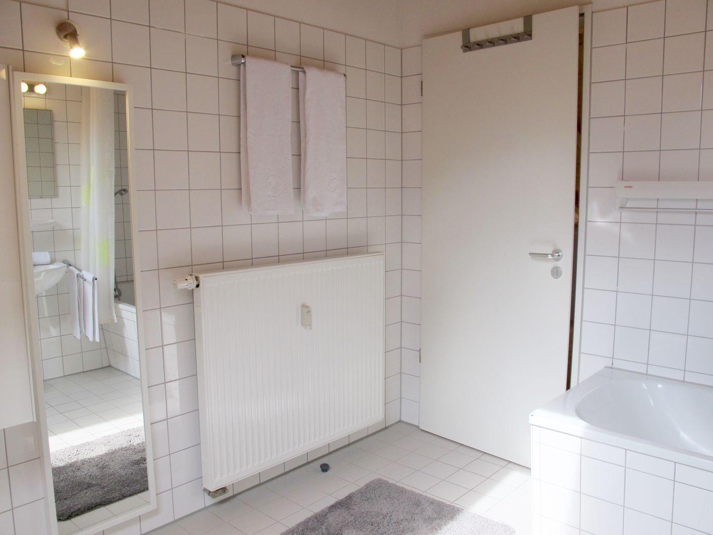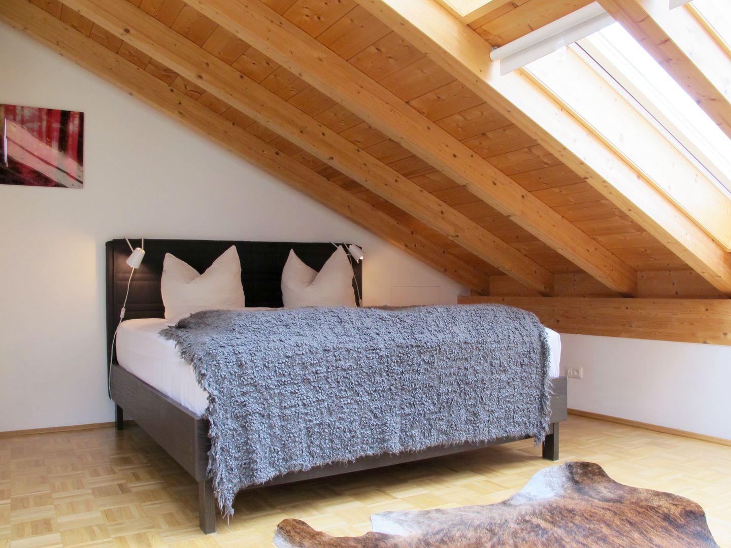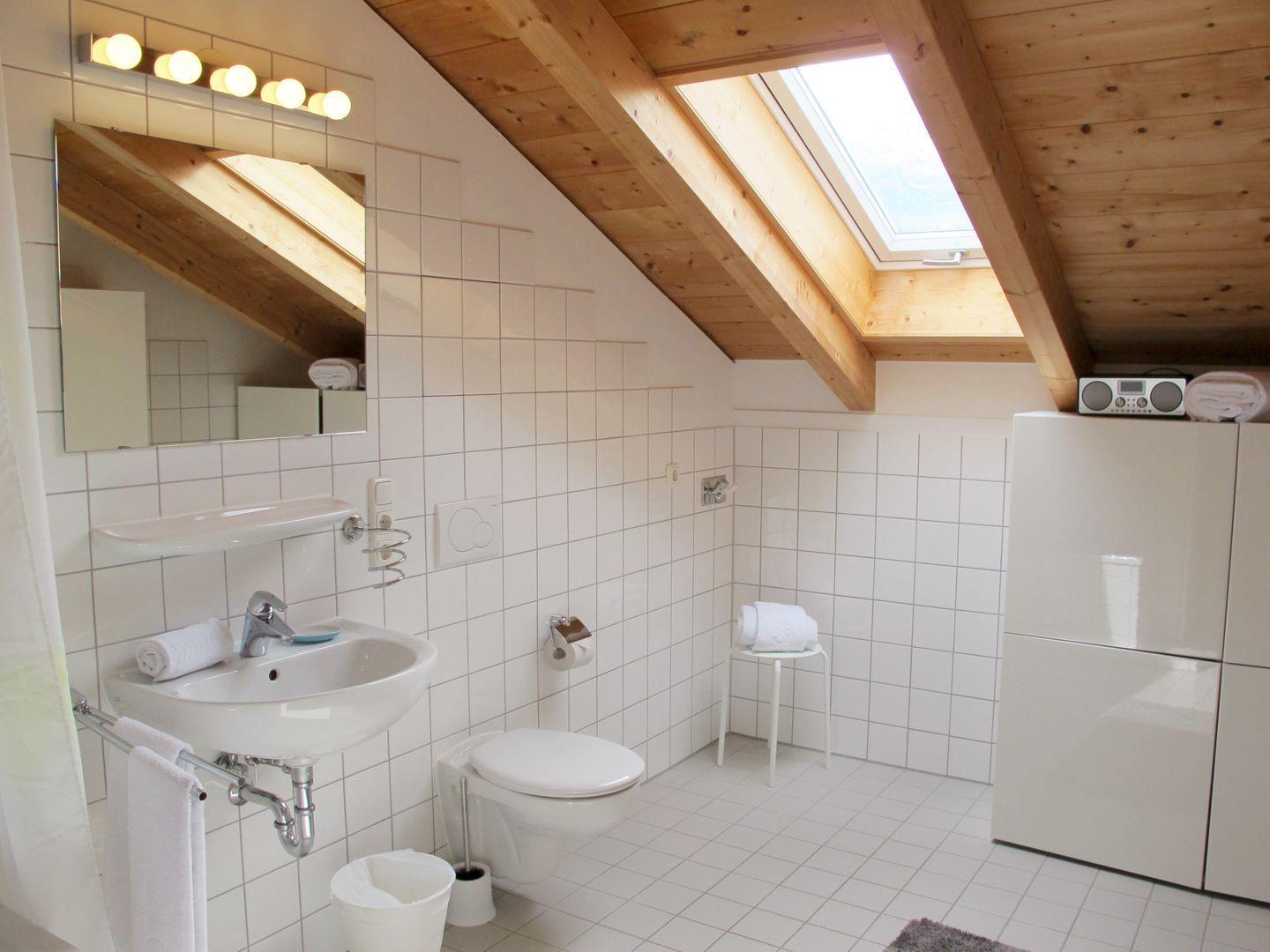 Das moderne Badezimmer ist mit einem Dachfenster versehen, sowie mit einer Badewanne inklusive Duschhalterung. Außerdem finden Sie hier einen Ganzkörperspiegel und moderne Schränke zum unterbringen Ihrer Kosmetika. Eine gute Nachricht noch: Ihr Föhn kann zu Hause bleiben, hier ist schon einer vorhanden!