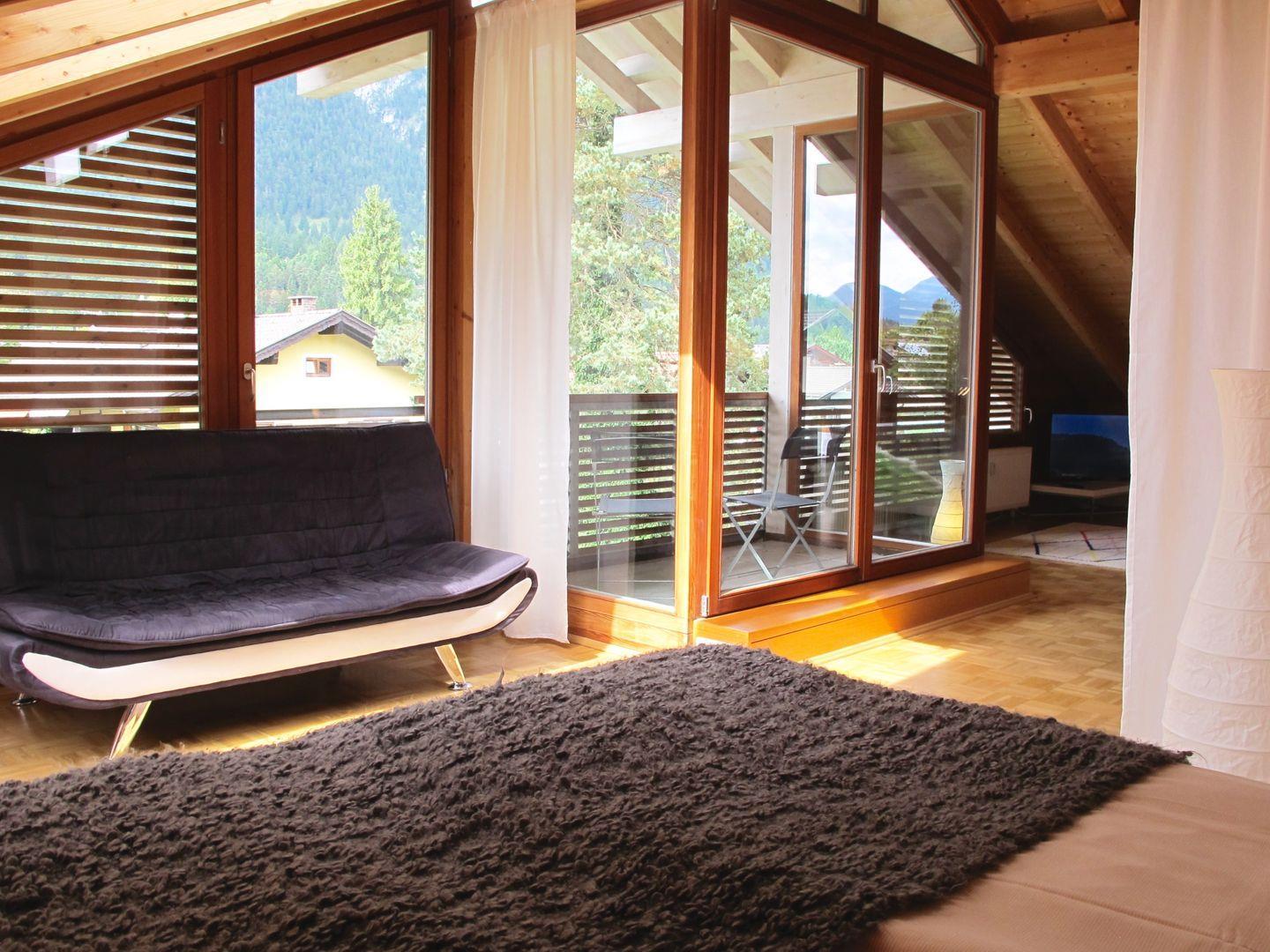 Vom Wohnbereich aus erreichen Sie den gemütlichen Balkon, wo zwei Gartenstühle für Sie bereit stehen.