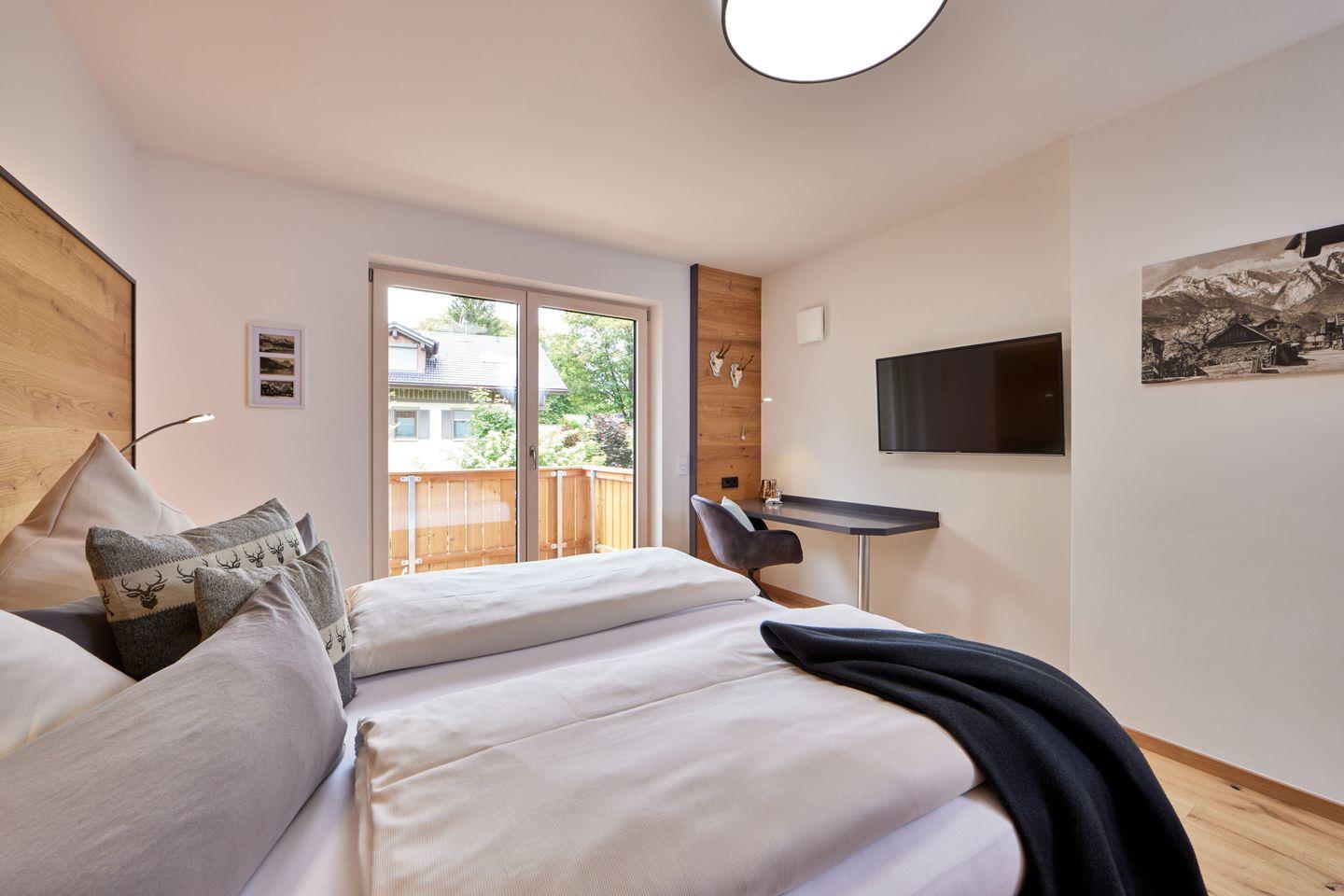 Alle Schlafzimmer sind jeweils mit bequemen Doppelbetten, großzügigen Kleiderschränken für Ihr Gepäck und eigenen Fernsehern ausgestattet. Zudem verfügen 3 der Schlafzimmer auch über praktische Schreibtische. 3 Schlafzimmer befinden sich im Obergeschoss, zusammen mit einem großen Badezimmer, in dem Sie neben einer ebenerdigen Dusche mit Regenbrause auch eine entspannende Badewanne finden. 2 der Schlafzimmer haben jeweils einen Zugang zum großen Balkon, auf dem sich bei schönem Bergblick herrlich die Abendsonne genießen lässt. Das andere Schlafzimmer verfügt über einen eigenen, kleineren Balkon.