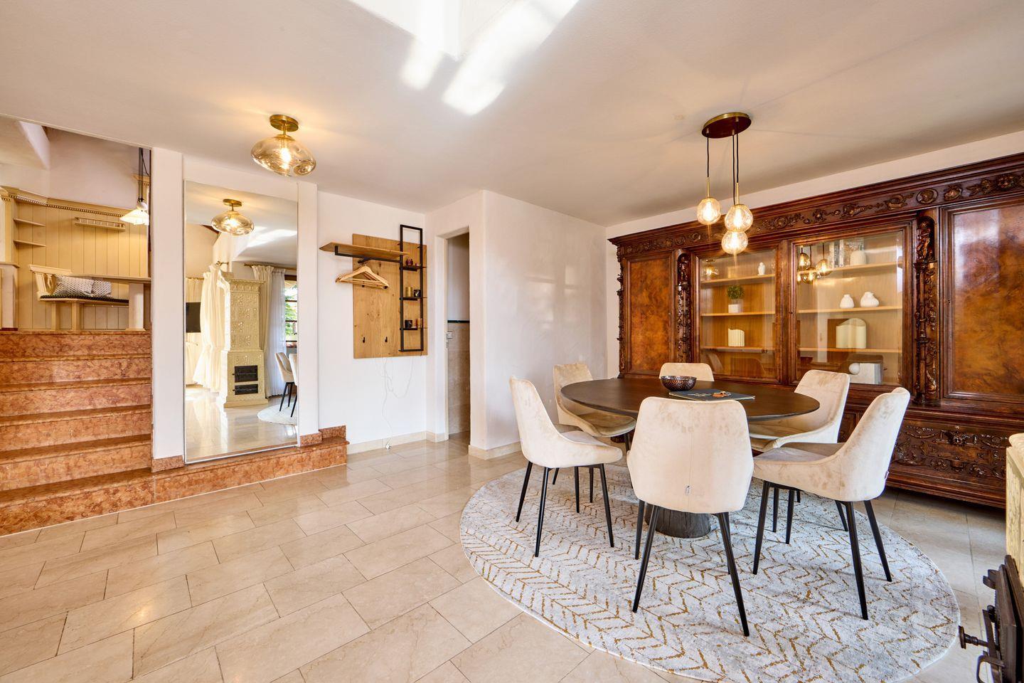 Der Essbereich verfügt über einen eleganten Holztisch, der mit einem beeindruckenden antiken Schrank kombiniert ist. Moderne Beleuchtung und dekorative Elemente verleihen der traditionellen Einrichtung einen zeitgemäßen Touch. Angrenzend finden Sie eine kleine Garderobe und ein praktisches Gäste-WC.