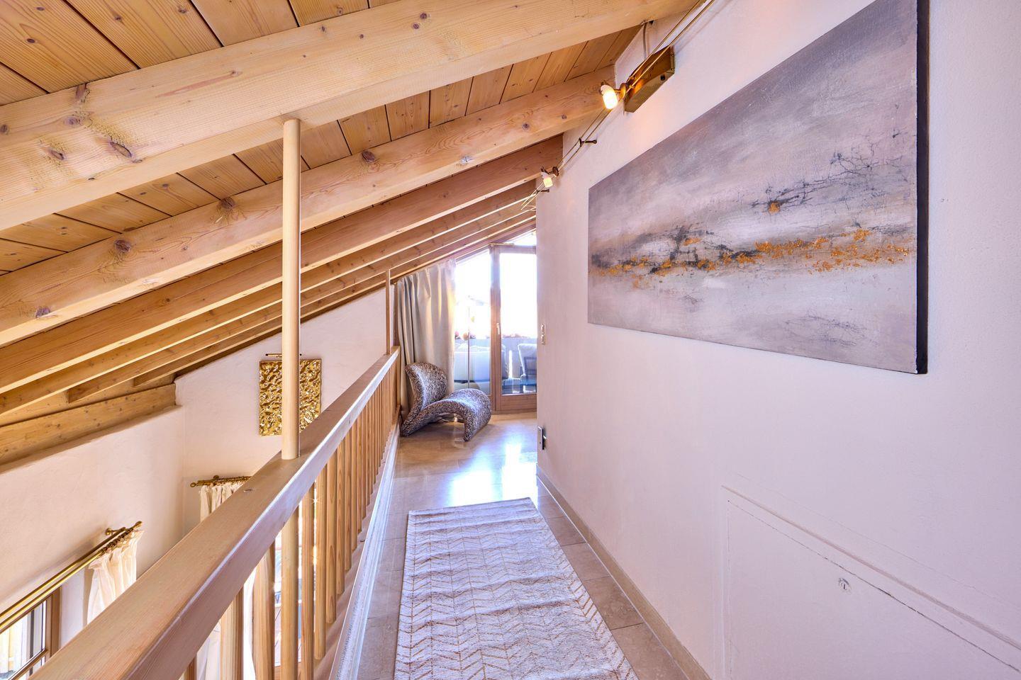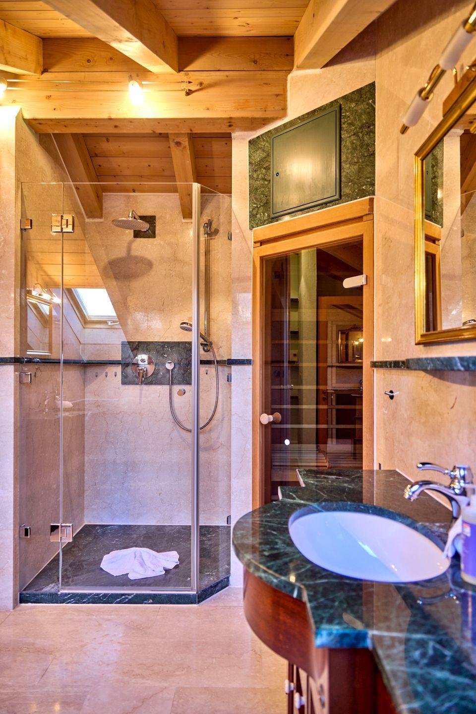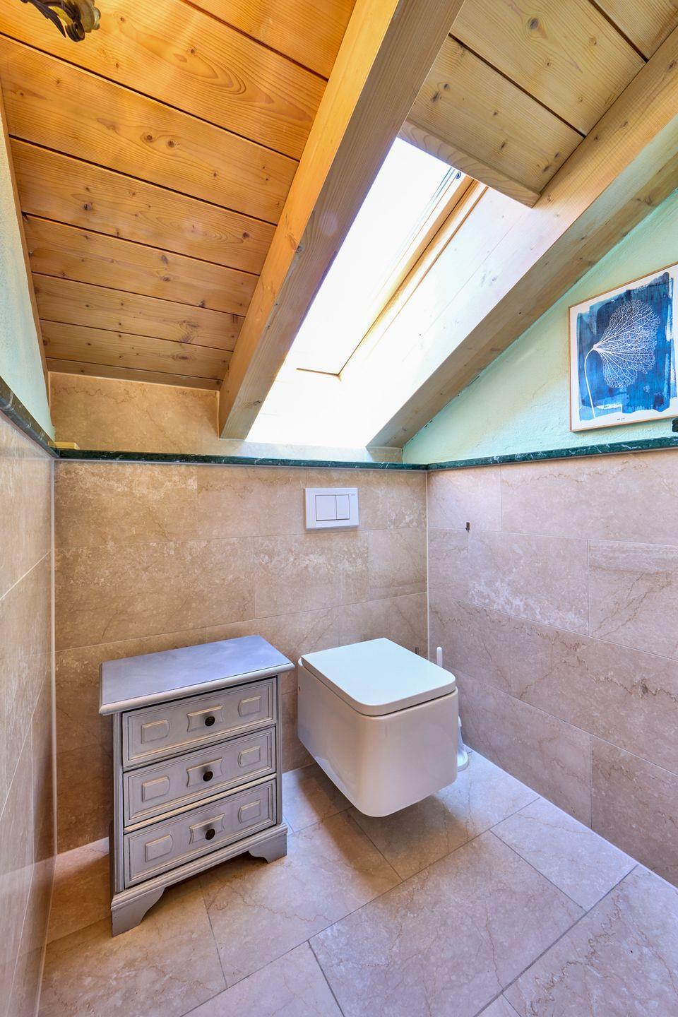 Der Luxus erstreckt sich auch auf das Badezimmer, welches eine ebenerdige Dusche mit Regenbrause, zwei elegante Waschtische und ein separates WC bereithalten. Dachfenster bringen natürliches Licht in den Raum. Materialien wie edles Holz und Marmor sorgen für einen Hauch von Eleganz. Eine Infrarot-Kabine bietet nach einem langen Tag in den Bergen oder der Erkundung der malerischen Stadt den idealen Weg, um sich zu entspannen.