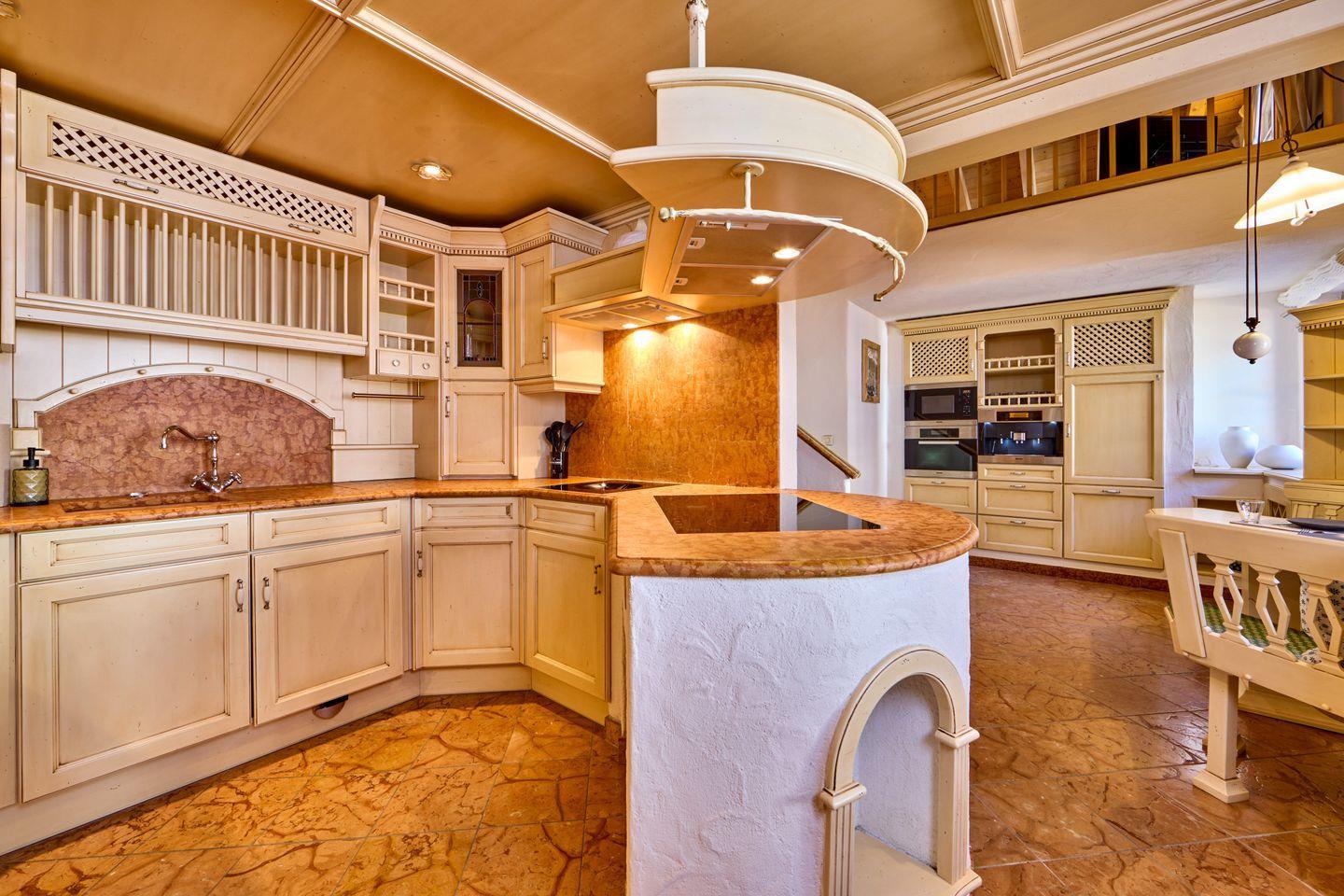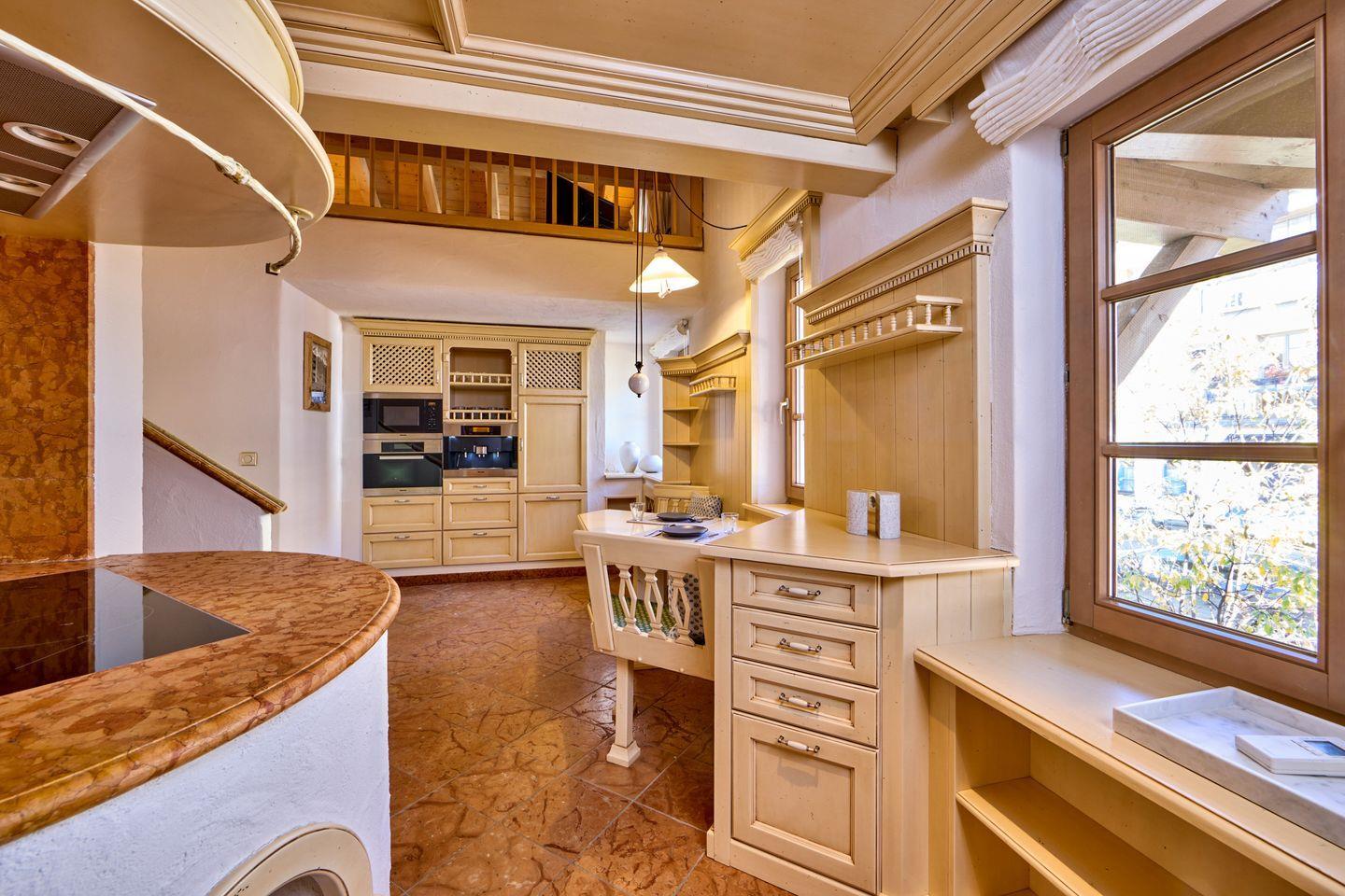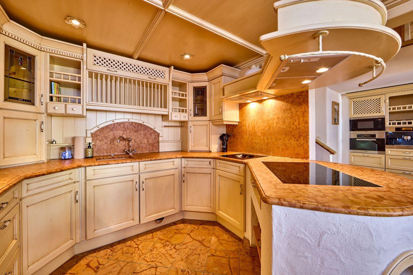 Die Küche besticht durch ihr einzigartiges, geschwungenes Design, das Funktionalität mit künstlerischem Flair verbindet und der Traum eines jeden Kochbegeisterten ist. Hochwertige Geräte sind nahtlos in die maßgefertigten Schränke integriert, und ein kleiner Esstisch bietet eine charmante Möglichkeit für Kaffee oder Frühstück zu zweit. Warme Holztöne und die innovative Aufteilung der Küche machen sie sowohl funktional als auch optisch ansprechend.