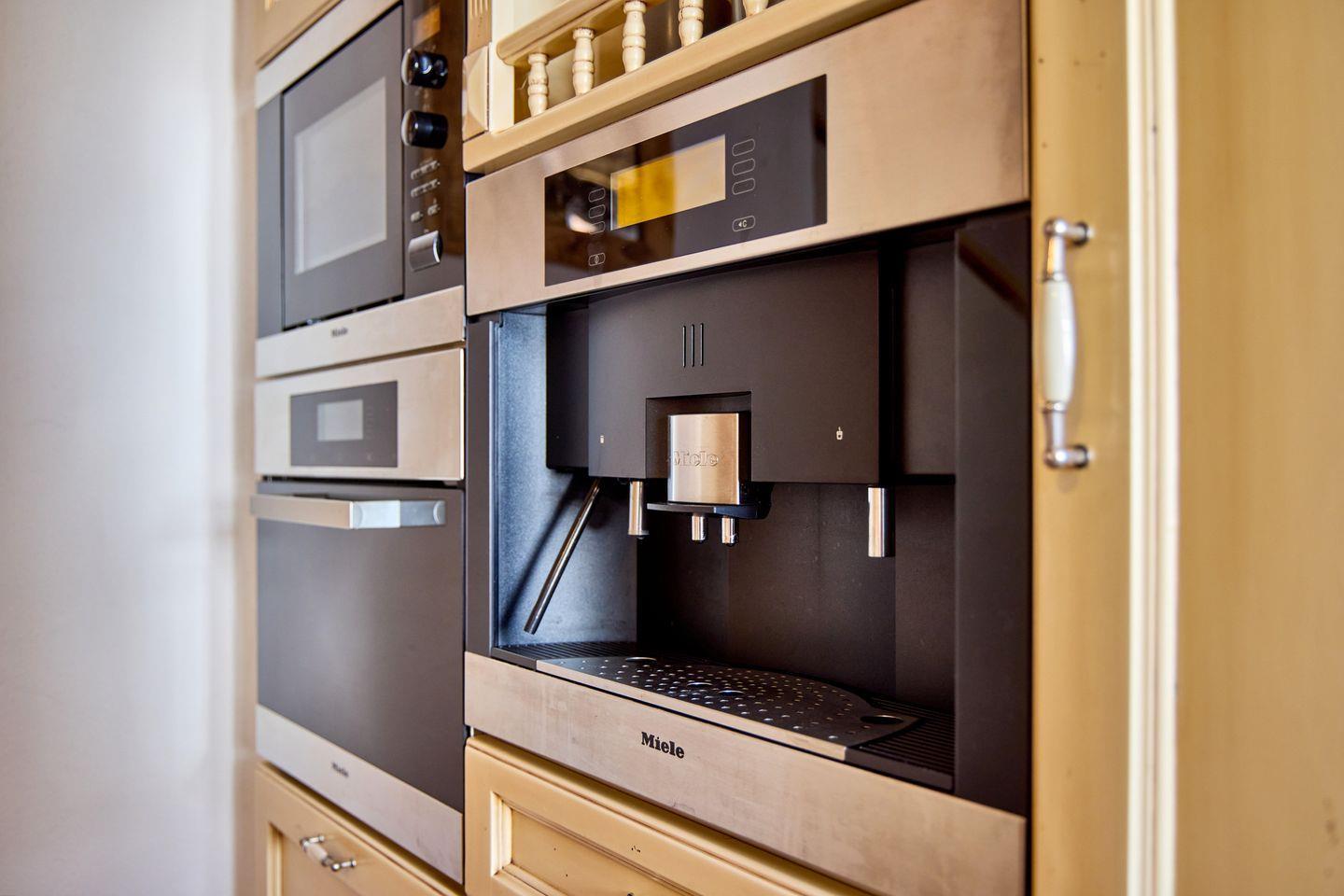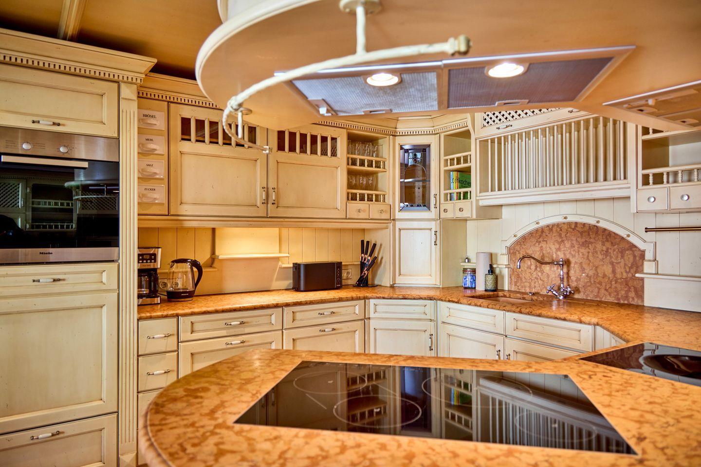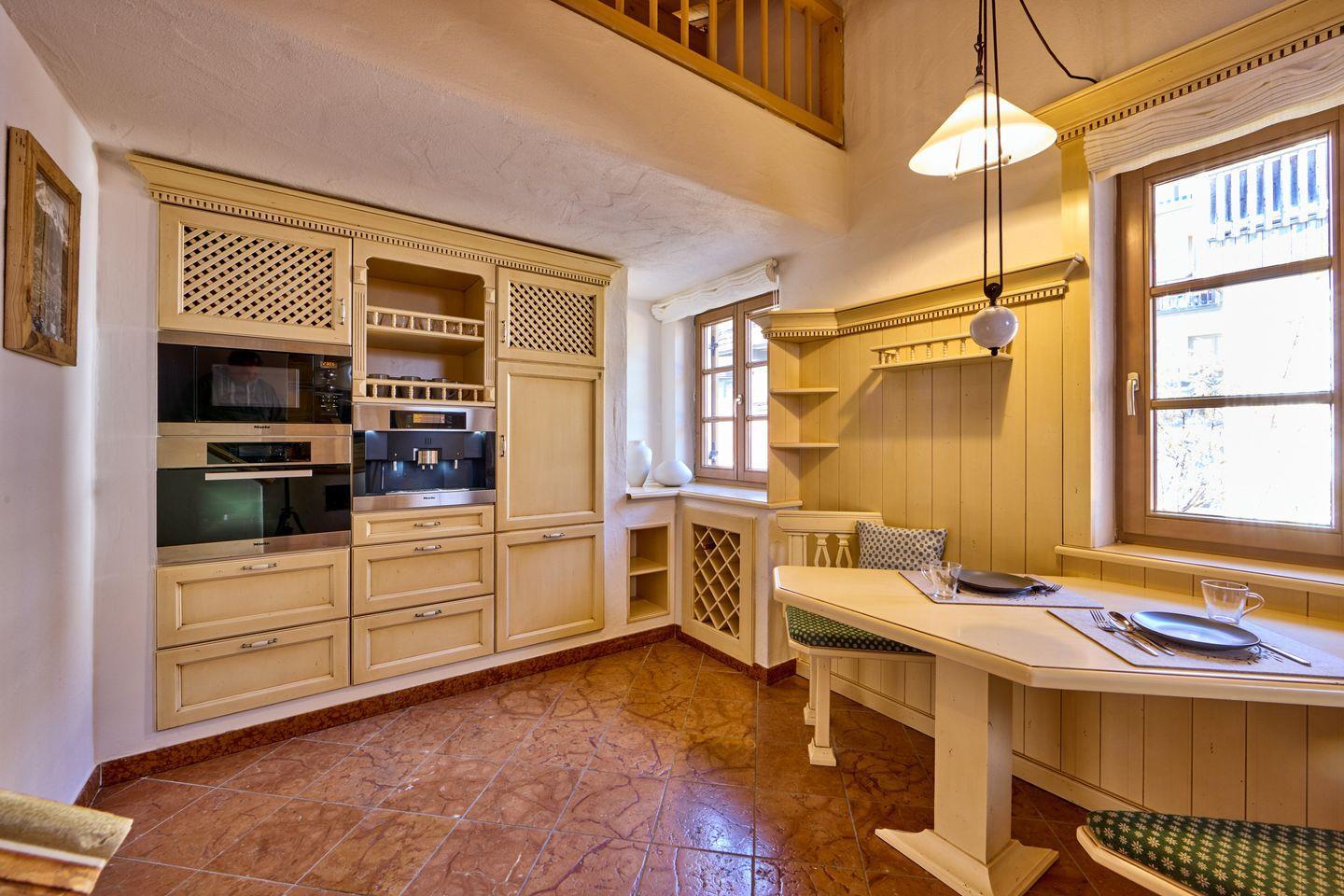 Die Küche besticht durch ihr einzigartiges, geschwungenes Design, das Funktionalität mit künstlerischem Flair verbindet und der Traum eines jeden Kochbegeisterten ist. Hochwertige Geräte sind nahtlos in die maßgefertigten Schränke integriert, und ein kleiner Esstisch bietet eine charmante Möglichkeit für Kaffee oder Frühstück zu zweit. Warme Holztöne und die innovative Aufteilung der Küche machen sie sowohl funktional als auch optisch ansprechend.
