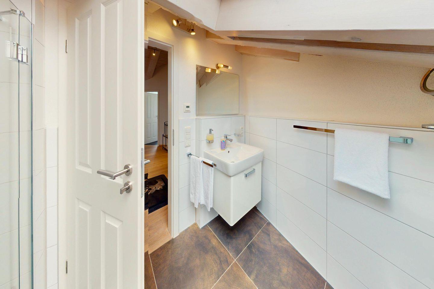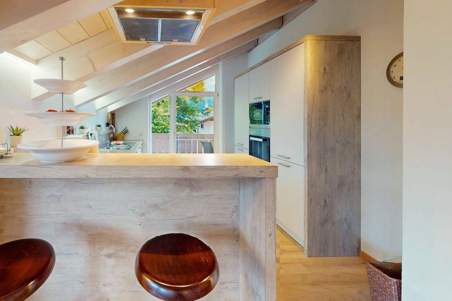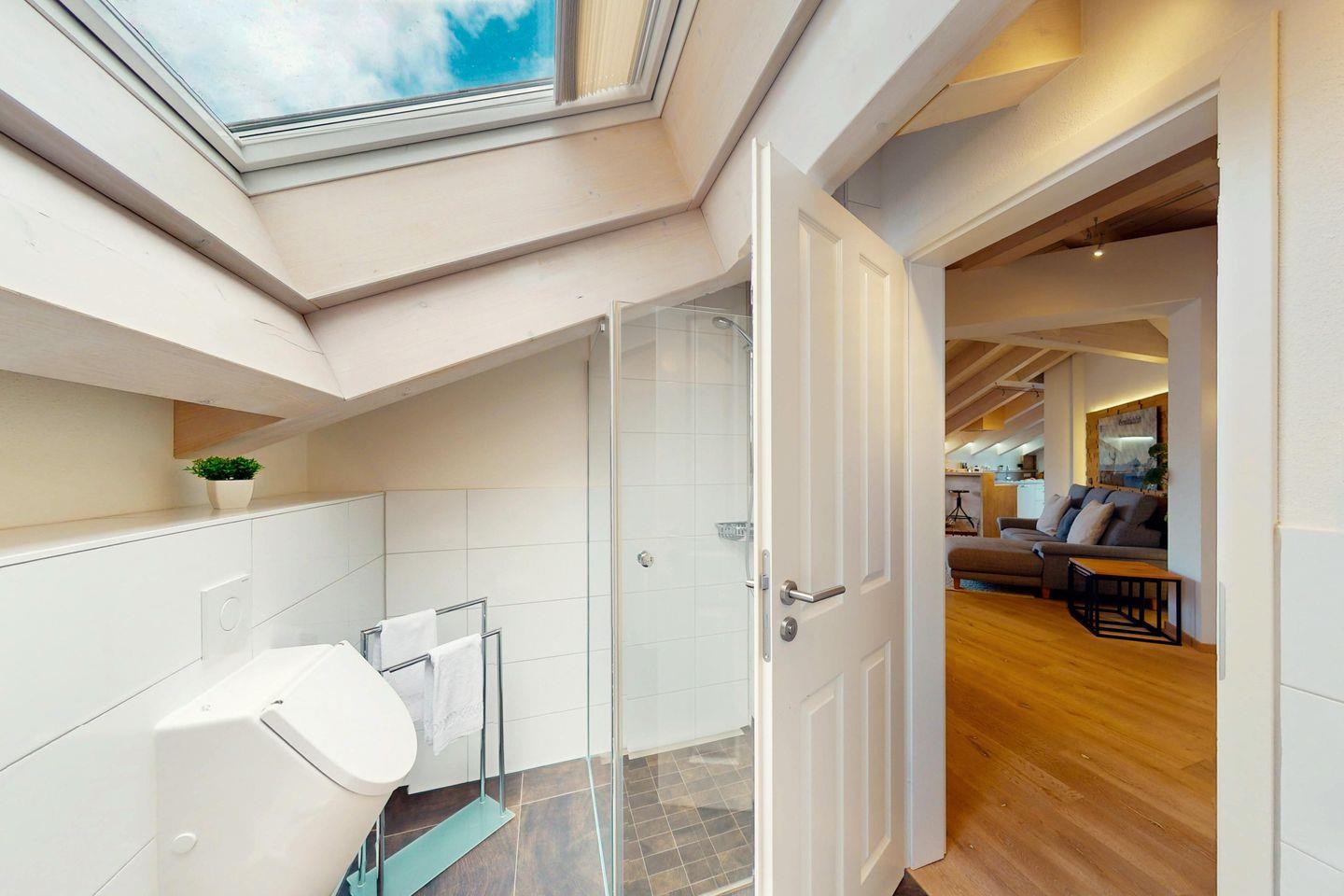 Das Apartment verfügt über zwei komfortable Schlafzimmer sowie zwei moderne Tageslichtbäder mit Dachfenstern. Herzstück der Wohnung ist der große Wohn-, Ess- und Küchenbereich mit hohen Decken, sichtbaren Balken und großen Fensterflächen, die für ein angenehm offenes und helles Raumgefühl sorgen.