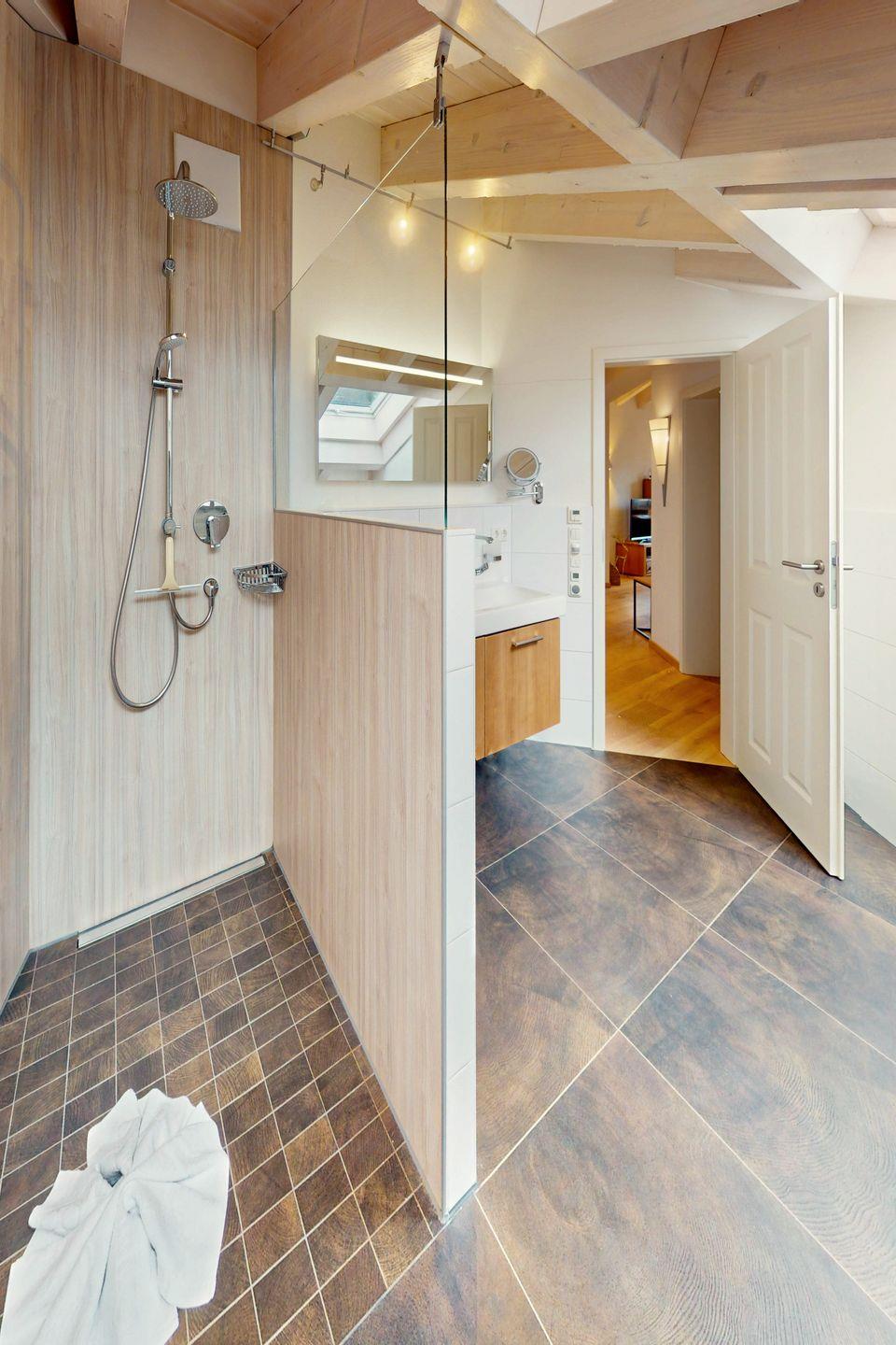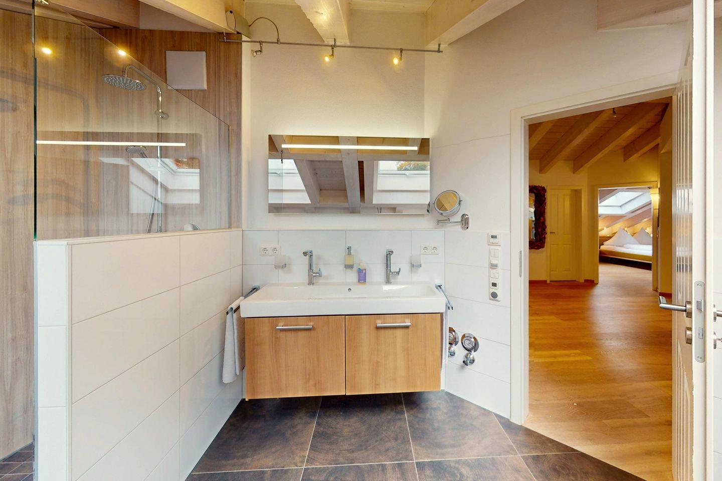 Die beiden Tageslichtbäder sind modern ausgestattet: eines mit Dusche, Waschbecken und WC, das größere mit Doppelwaschbecken, ebenerdiger Dusche, WC und Bidet.