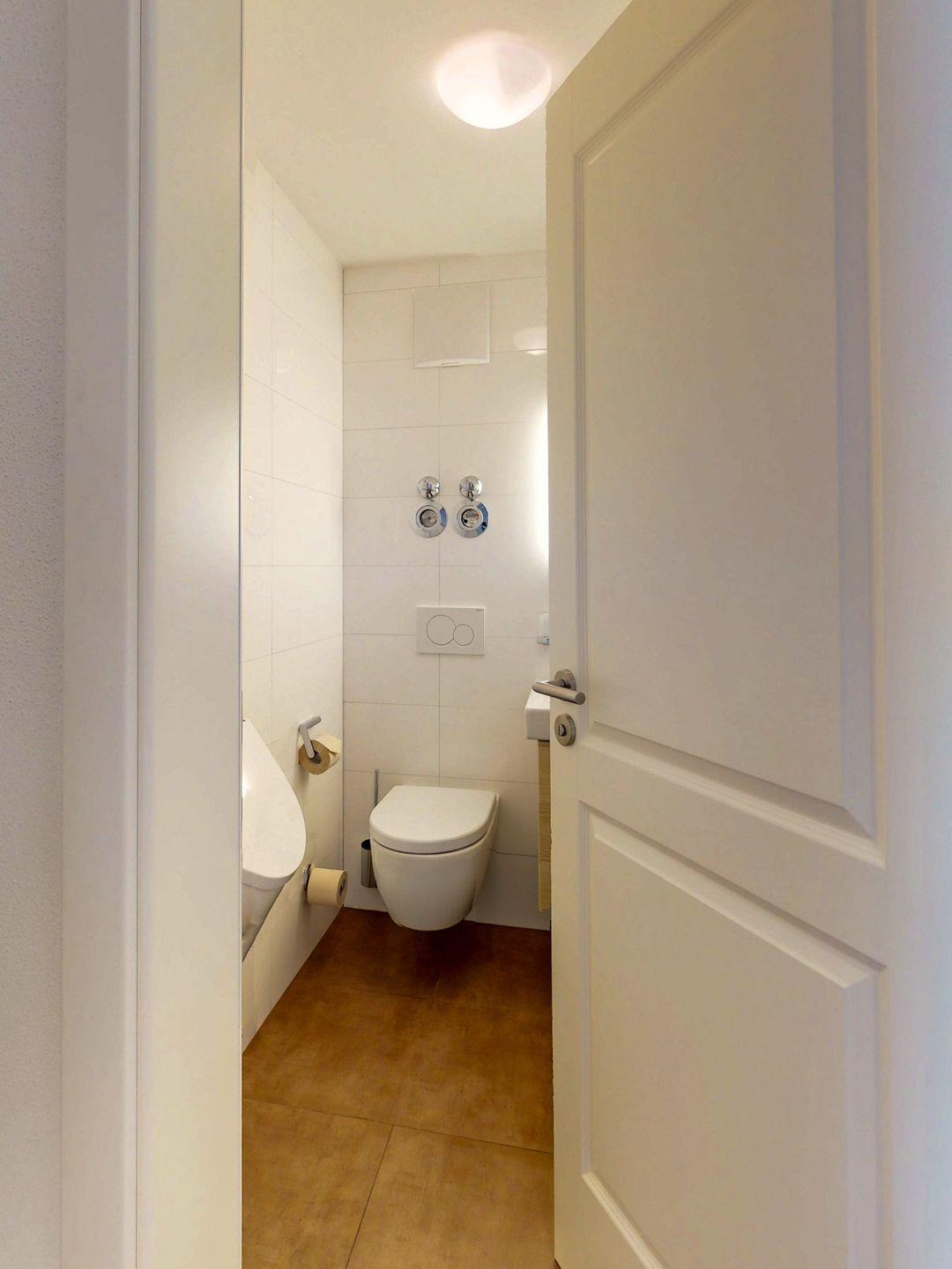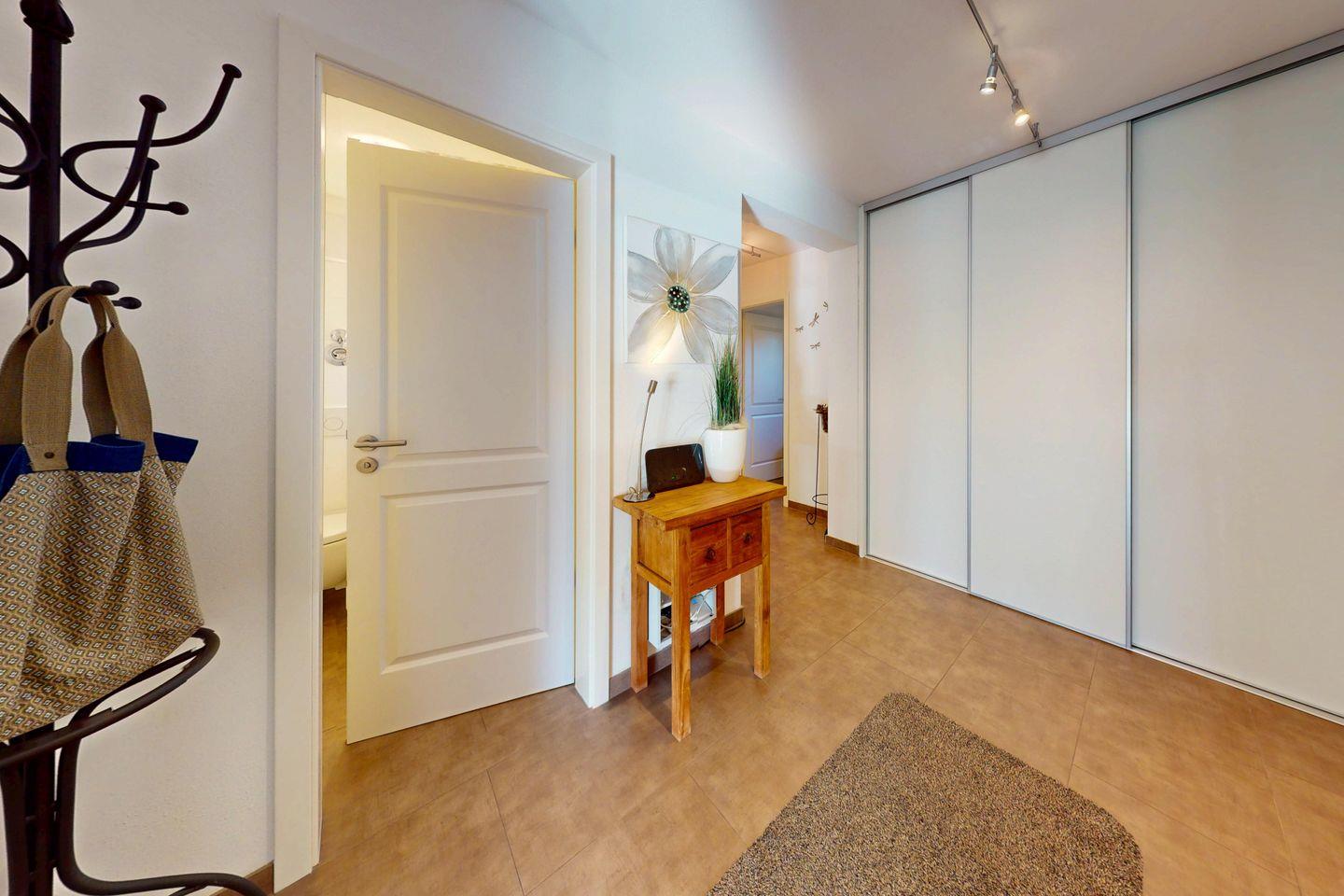 Die Wohnung befindet sich im 1. Obergeschoss und empfängt Sie mit einem großzügigen Eingangsbereich, in dem Garderobe und ein großer Kleiderschrank reichlich Platz für Jacken, Schuhe und Gepäck bieten. Ein praktisches Gäste-WC befindet sich direkt im Eingangsbereich, von dem aus sich der helle Wohn- und Essbereich, die beiden Schlafzimmer sowie das Bad erschließen.
