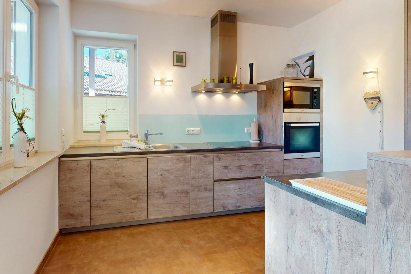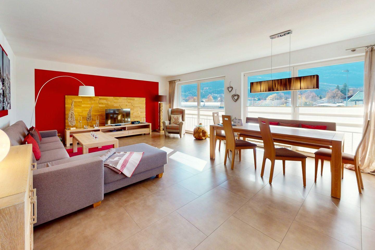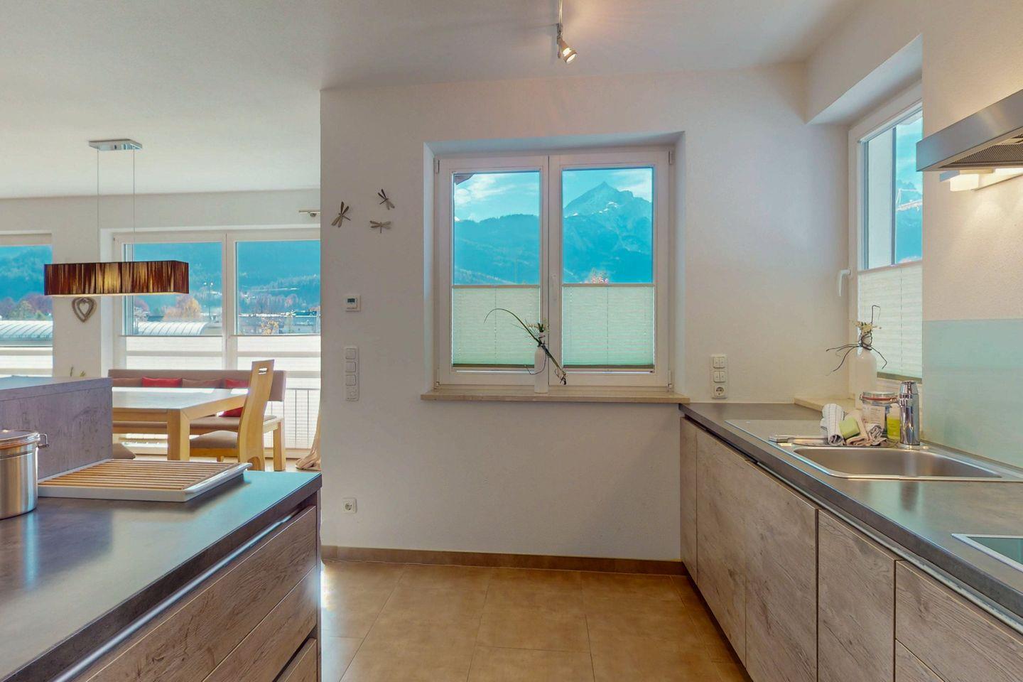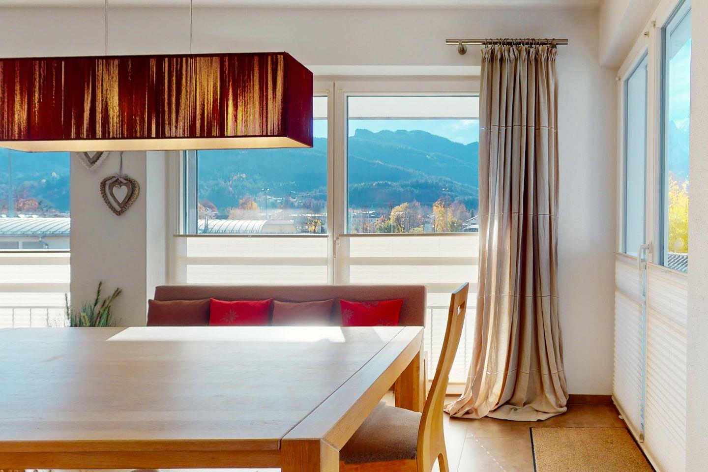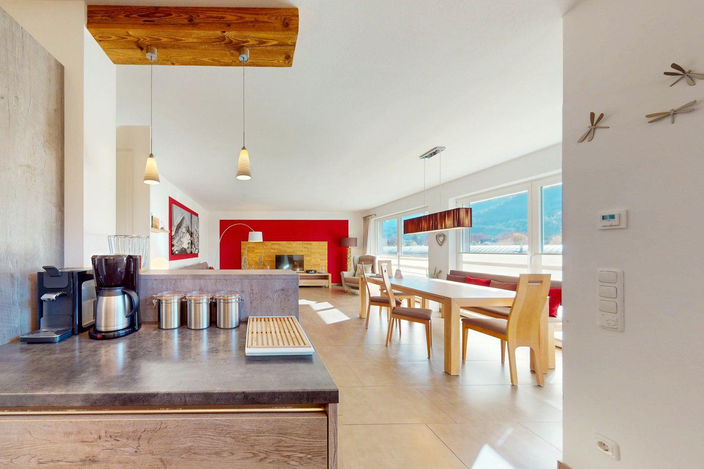 Der Wohn- und Essbereich ist großzügig gestaltet und dank breiter Fensterfront lichtdurchflutet – perfekt für entspannte Stunden nach einem aktiven Tag in den Bergen. Eine komfortable Couchlandschaft mit TV und Lesesessel lädt zum Ausruhen ein, während am Esstisch genügend Platz für gemeinsame Mahlzeiten oder Spieleabende ist. Die offen anschließende Küche ist voll ausgestattet – unter anderem mit Herd, Backofen, Mikrowelle, Spülmaschine und den wichtigsten Küchenutensilien – und wird durch eine kleine Theke mit Barhockern ergänzt, an der sich der Tag gemütlich bei einem Glas Wein ausklingen lässt.