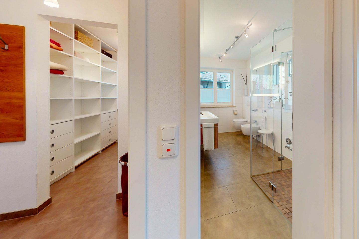 Das Bad mit Tageslicht rundet den Komfort ab. Es ist mit Doppelwaschbecken, ebenerdiger Dusche, WC und Bidet ausgestattet und bietet viel Platz für die tägliche Morgen- und Abendroutine – auch bei längeren Aufenthalten.