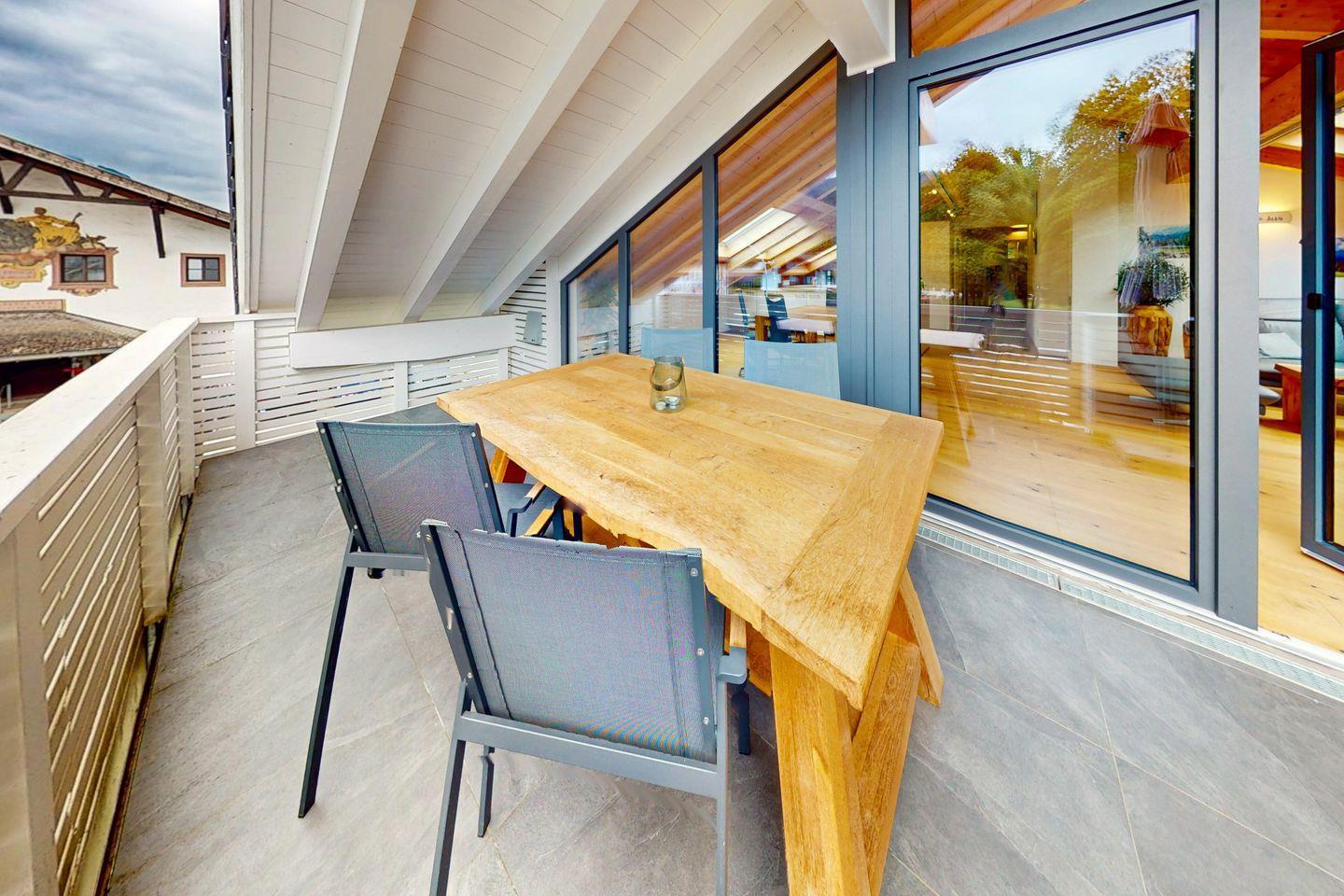 In der charmanten Dachgeschosswohnung „BergBlick“ erleben Sie naturnahen Komfort mit moderner Ausstattung und herrlichem Alpenpanorama. Die großzügige Wohnfläche lädt mit offenem Wohn- und Essbereich samt integrierter Küche zum gemeinsamen Verweilen ein. Große Dachfenster fluten den Raum mit Licht und schaffen eine freundliche, behagliche Atmosphäre. Vom Wohnzimmer gelangen Sie direkt auf den geräumigen Balkon, der mit Sonnenliegen und einem einladenden Esstisch ausgestattet ist – hier genießen Sie Ihren Kaffee mit Blick auf die Garmischer Bergwelt.