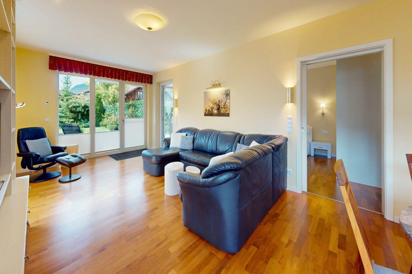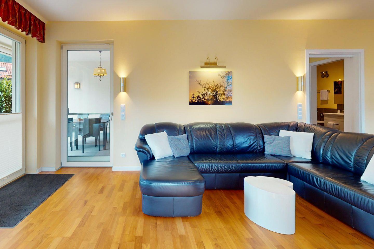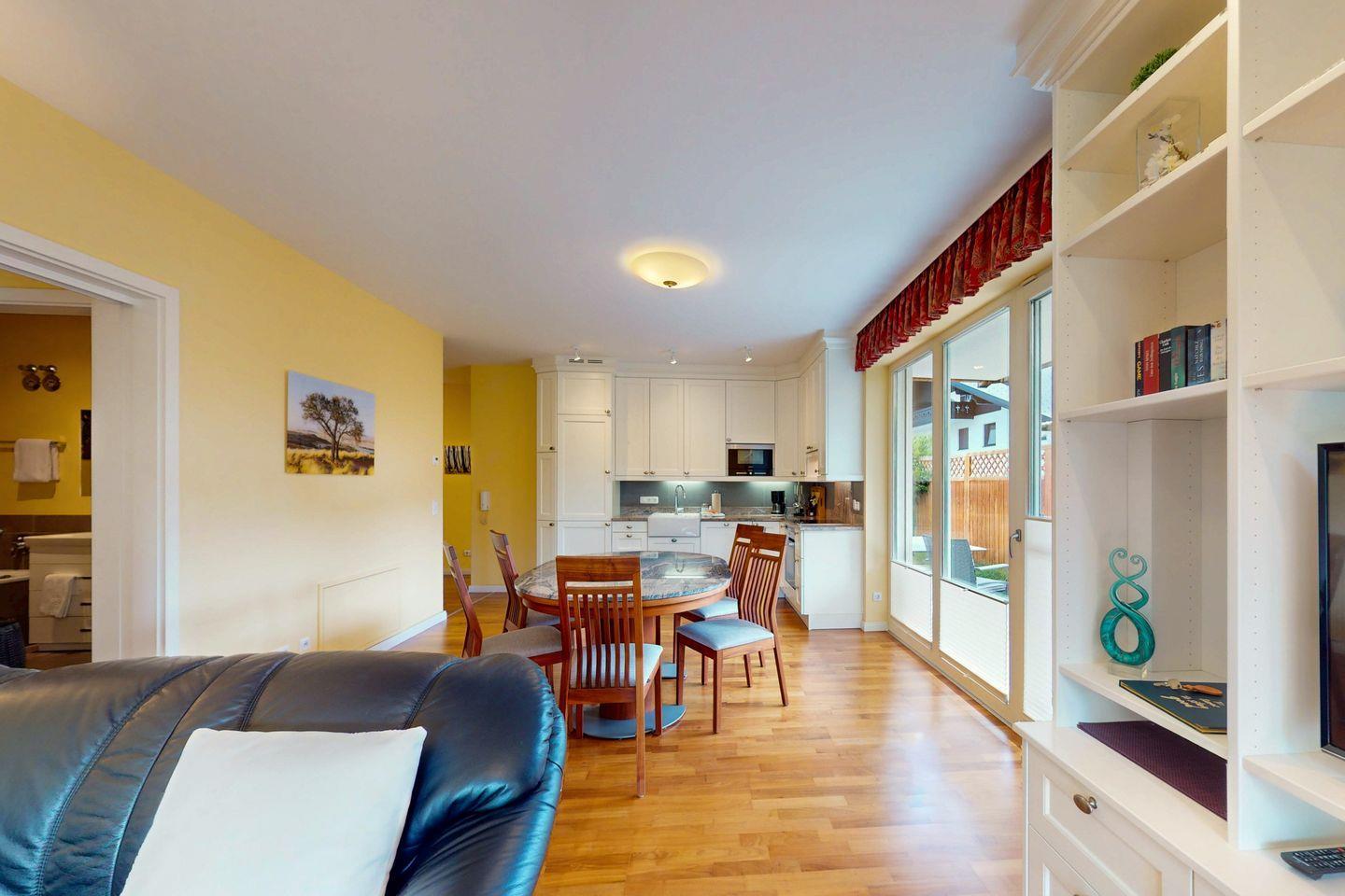 Der geräumige Wohn- und Essbereich bildet das Herzstück der Wohnung. Hier erwartet Sie eine bequeme Sitzlandschaft mit Fernseher und zusätzlichem Lesesessel – perfekt für gemütliche Abende. Das hochwertige Sofa lässt sich außerdem ausziehen und bietet einen bequemen Schlafplatz für 2 zusätzliche Personen. Der angrenzende Esstisch lädt zu gemeinsamen Mahlzeiten ein, während die offen gestaltete, voll ausgestattete Küche keine Wünsche offen lässt. Vom Wohnraum gelangen Sie direkt auf die sonnige Süd- und Westterrasse mit überdachtem Freisitz. Hier genießen Sie ganztägig Sonne und den Blick ins Grüne, während ein kleiner Bach am Garten vorbeifließt und für besondere Urlaubsatmosphäre sorgt.