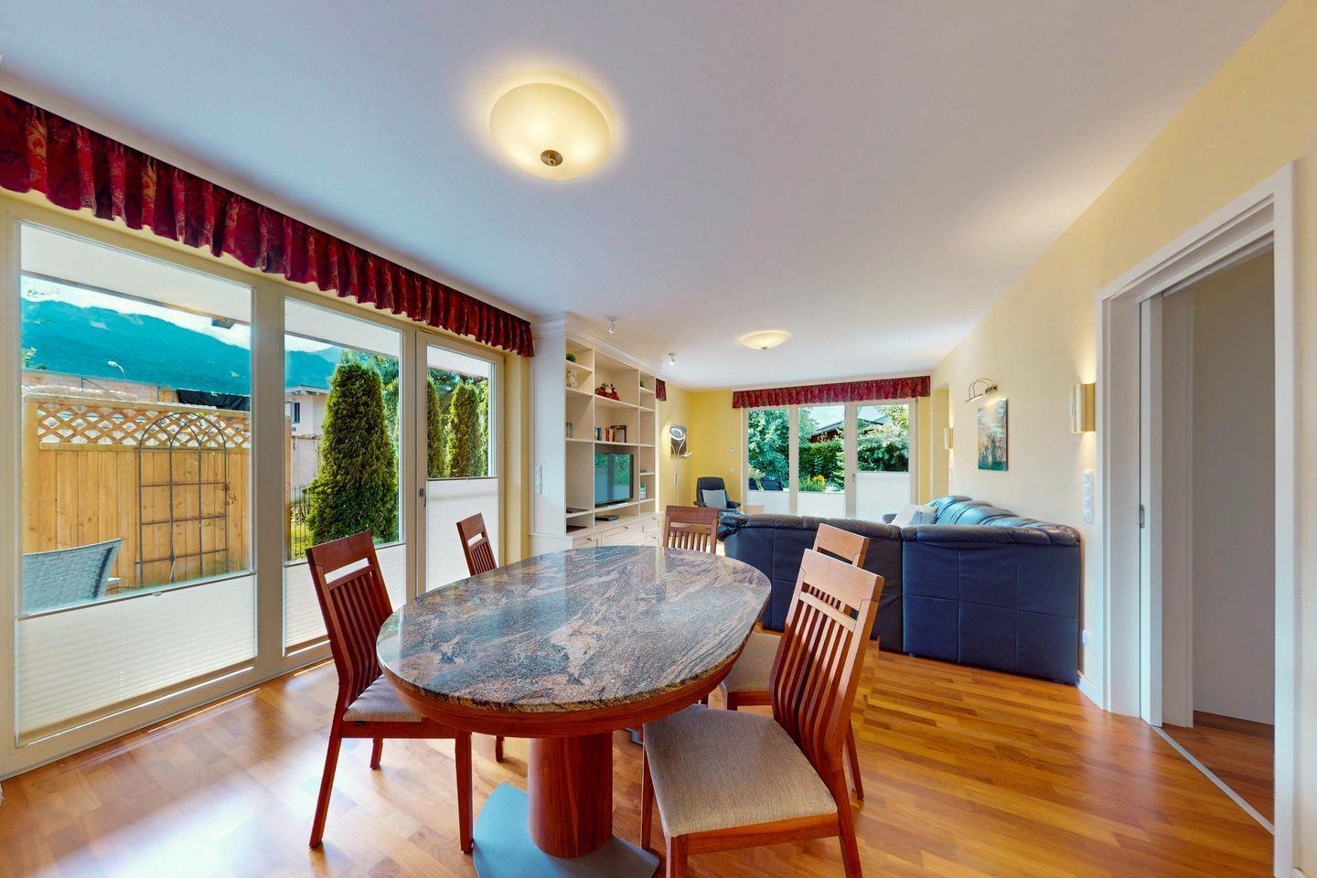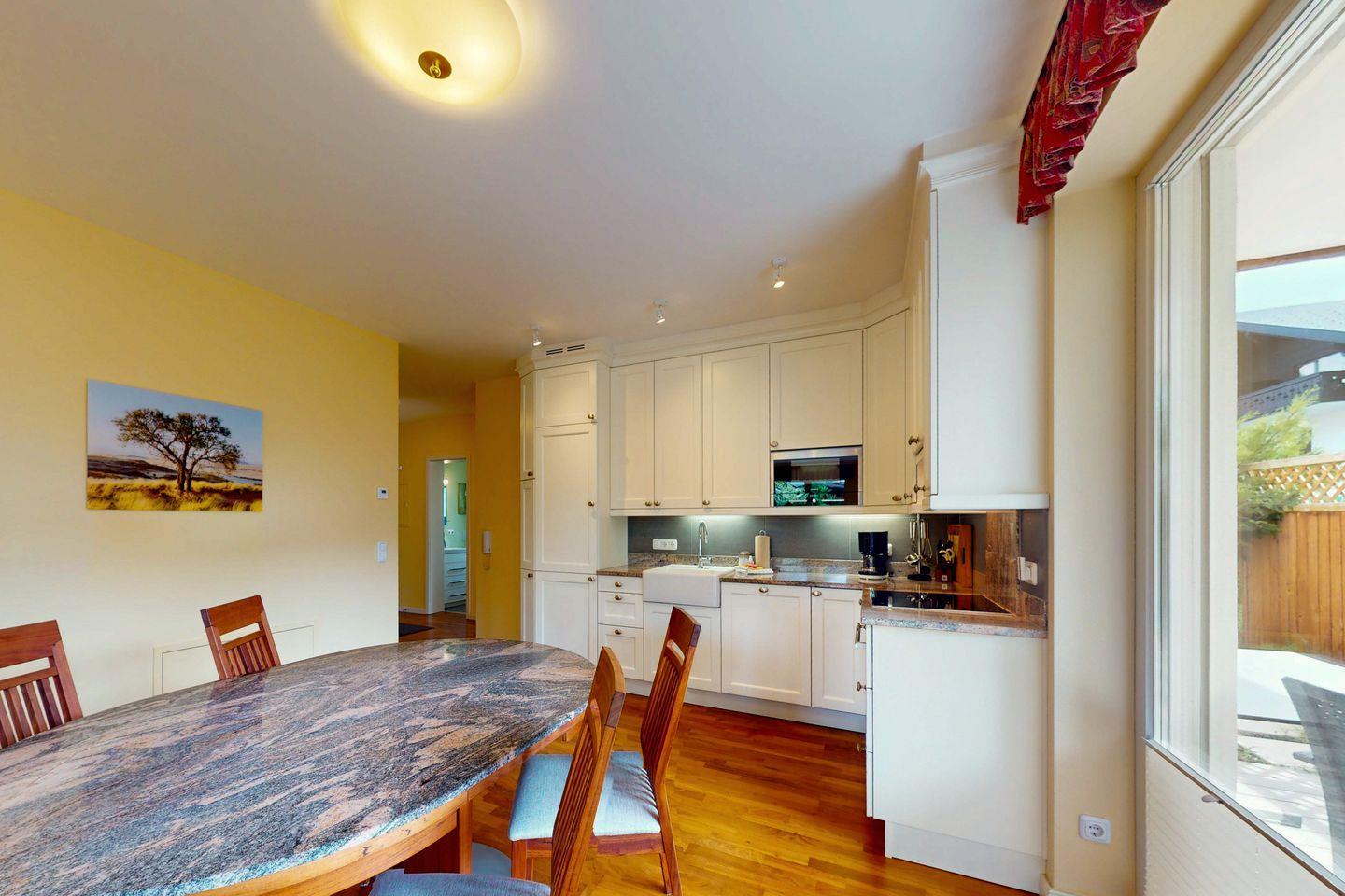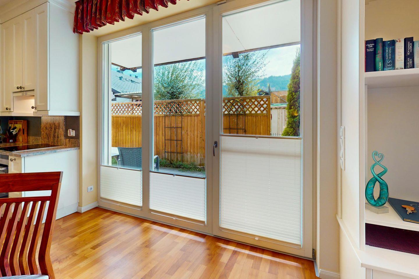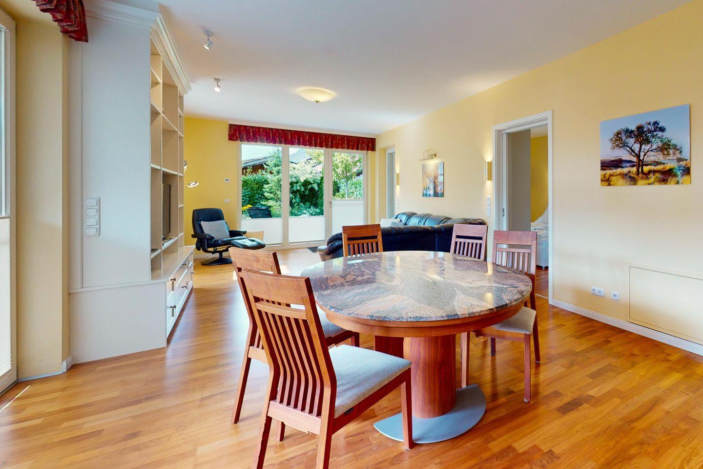 Der geräumige Wohn- und Essbereich bildet das Herzstück der Wohnung. Hier erwartet Sie eine bequeme Sitzlandschaft mit Fernseher und zusätzlichem Lesesessel – perfekt für gemütliche Abende. Das hochwertige Sofa lässt sich außerdem ausziehen und bietet einen bequemen Schlafplatz für 2 zusätzliche Personen. Der angrenzende Esstisch lädt zu gemeinsamen Mahlzeiten ein, während die offen gestaltete, voll ausgestattete Küche keine Wünsche offen lässt. Vom Wohnraum gelangen Sie direkt auf die sonnige Süd- und Westterrasse mit überdachtem Freisitz. Hier genießen Sie ganztägig Sonne und den Blick ins Grüne, während ein kleiner Bach am Garten vorbeifließt und für besondere Urlaubsatmosphäre sorgt.