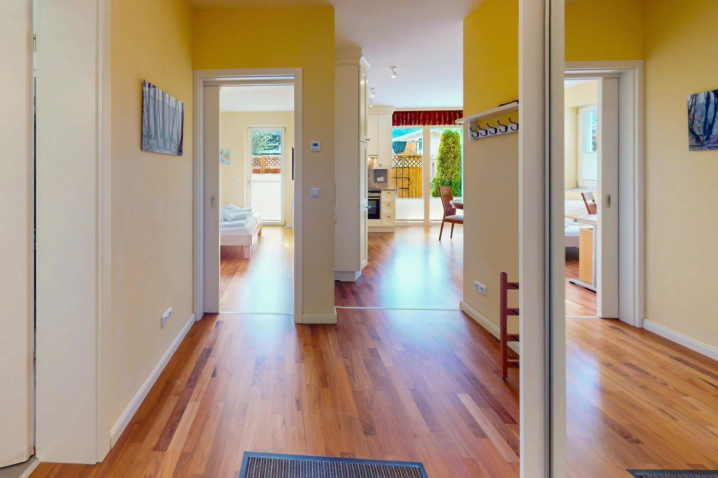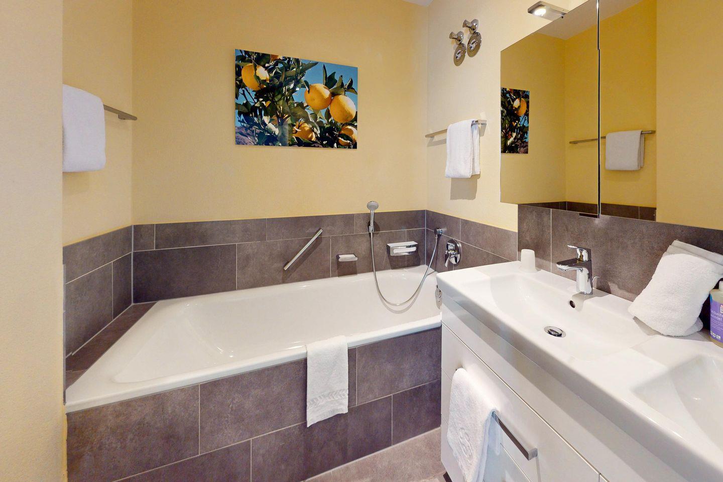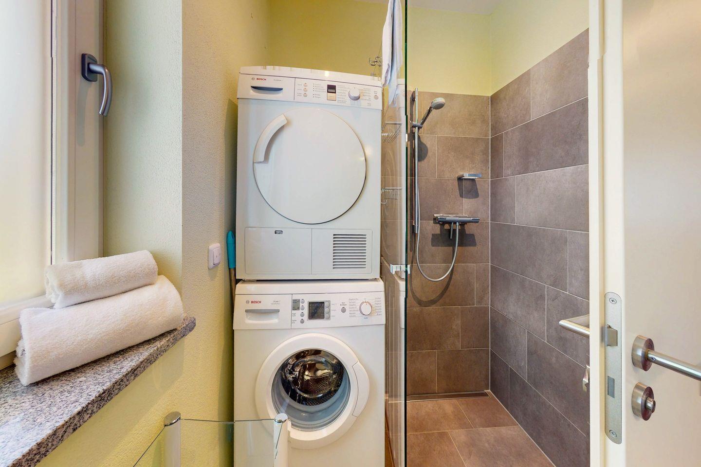 Insgesamt stehen zwei moderne Badezimmer zur Verfügung. Neben dem En-Suite-Bad sorgt ein weiteres Tageslichtbad mit ebenerdiger Dusche für Komfort. Hier befinden sich auch eine Waschmaschine und ein Trockner, sodass die Wohnung bestens für längere Aufenthalte geeignet ist. Ein großzügiger Eingangsbereich mit Kleiderschrank und Garderobe rundet das Raumangebot ab.