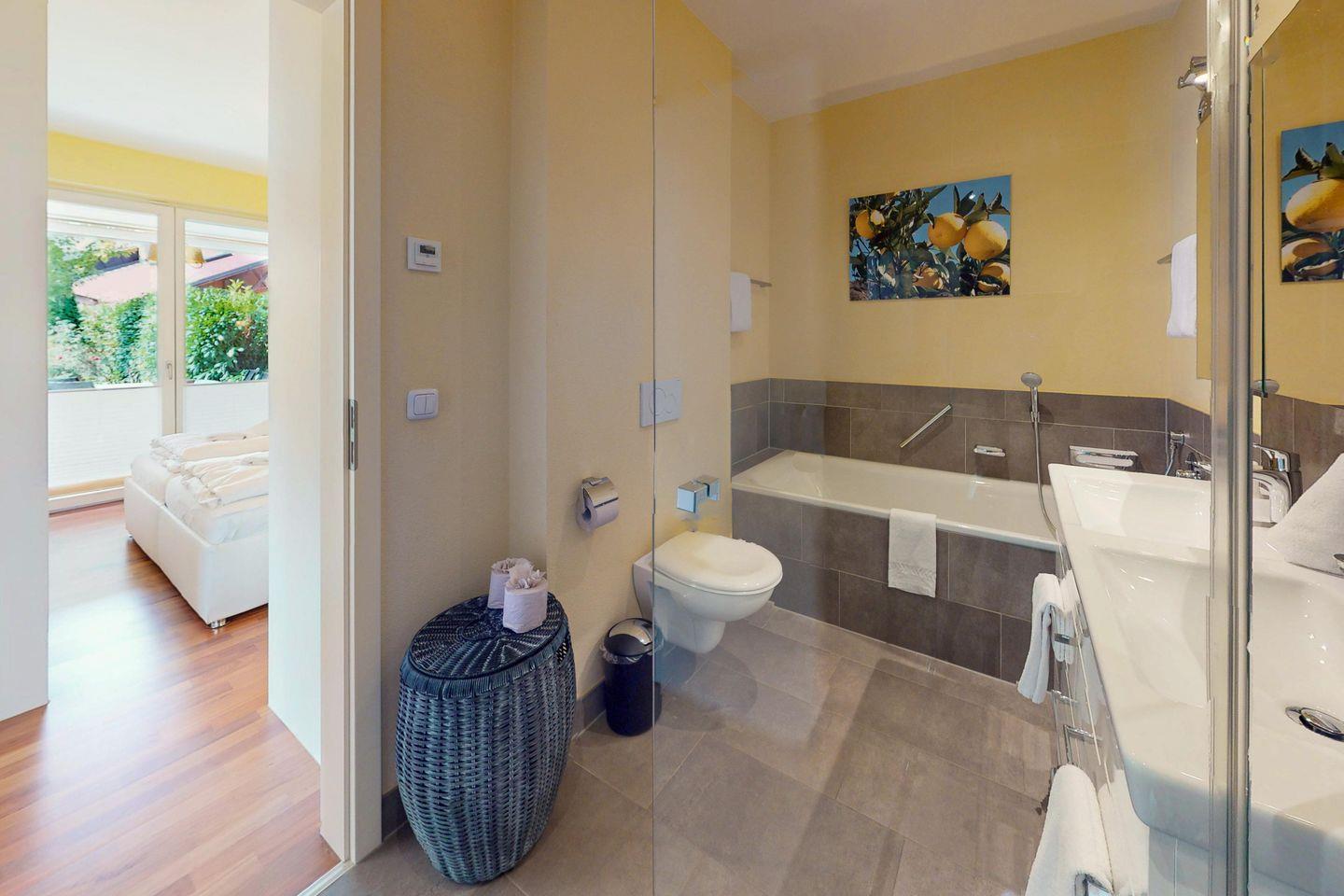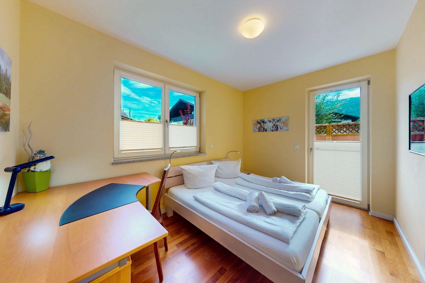 Die beiden Schlafzimmer sind komfortabel eingerichtet und bieten gemütliche Rückzugsmöglichkeiten. Das Hauptschlafzimmer verfügt über ein Doppelbett, großzügige Kleiderschränke, sowie Zugang zur Terrasse und einem eigenen Badezimmer mit ebenerdiger Dusche und Badewanne. Das zweite Schlafzimmer ist ebenfalls mit einem Doppelbett ausgestattet und bietet zusätzlich einen Schreibtisch sowie einen eigenen Fernseher – ideal für Gäste, die Arbeit und Erholung kombinieren möchten. Auch dieses Zimmer hat Zugang zur umlaufenden Terrasse.