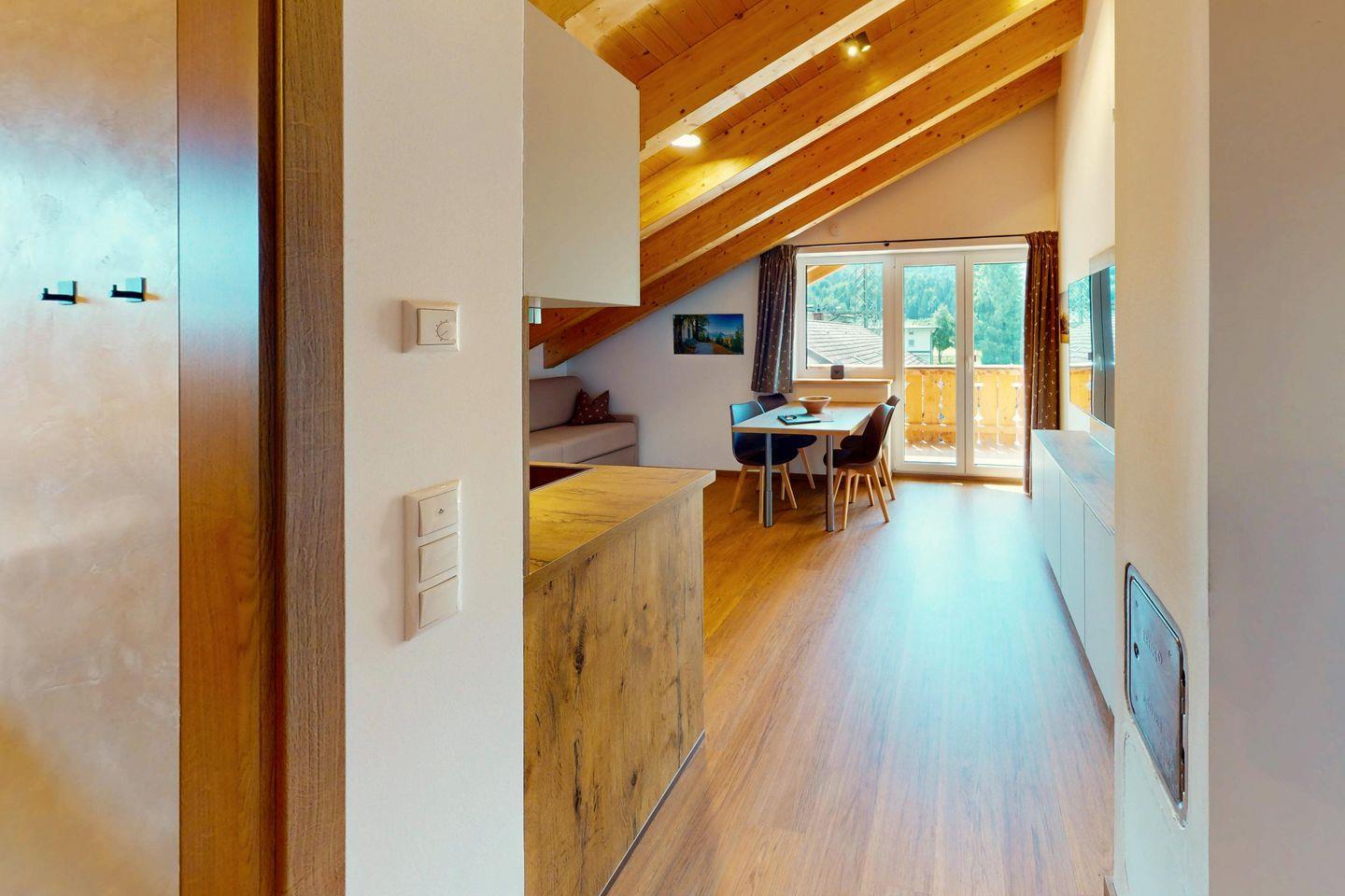 Die Wohnung überzeugt durch ihre gelungene Verbindung aus alpinem Stil und moderner Leichtigkeit. Dachschrägen, klare Linien und liebevoll gesetzte Akzente geben ihr eine besondere, wohltuende Atmosphäre.