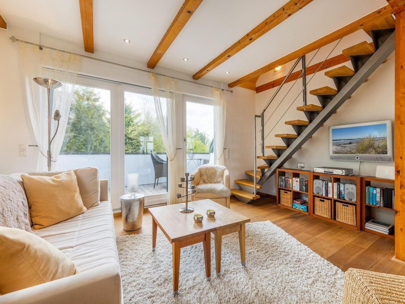Die stilvolle OG-Ferienwohnung im Ferienhaus Rügenbrise besticht durch ihre offene Architektur und lichtdurchflutete Räume. Herzstück ist die freistehende Stahltreppe mit edlen Eichenstufen, Die stilvolle OG-Ferienwohnung im Ferienhaus Rügenbrise besticht durch ihre offene Architektur und lichtdurchflutete Räume. Herzstück ist die freistehende Stahltreppe mit edlen Eichenstufen, die ins Obergeschoss führt. Der großzügige Wohn- und Essbereich mit Kamin bietet Zugang zu zwei Balkonen – einer davon überdacht – und lädt zum Entspannen mit Blick ins Grüne ein. Die moderne, voll ausgestattete Küche öffnet sich zur Panorama-Dachterrasse mit traumhaftem Sonnen- und Boddenblick – ein Highlight für jede Tageszeit.