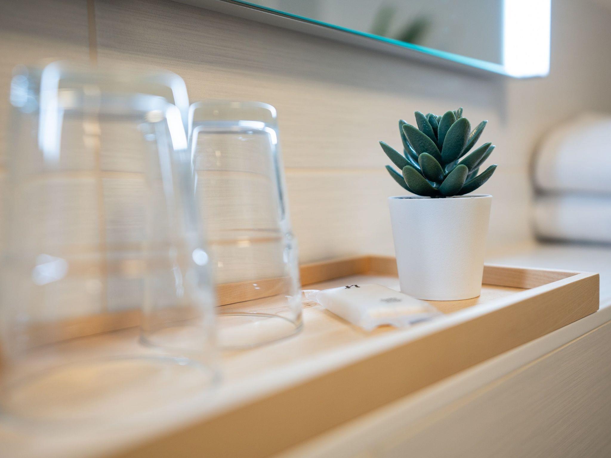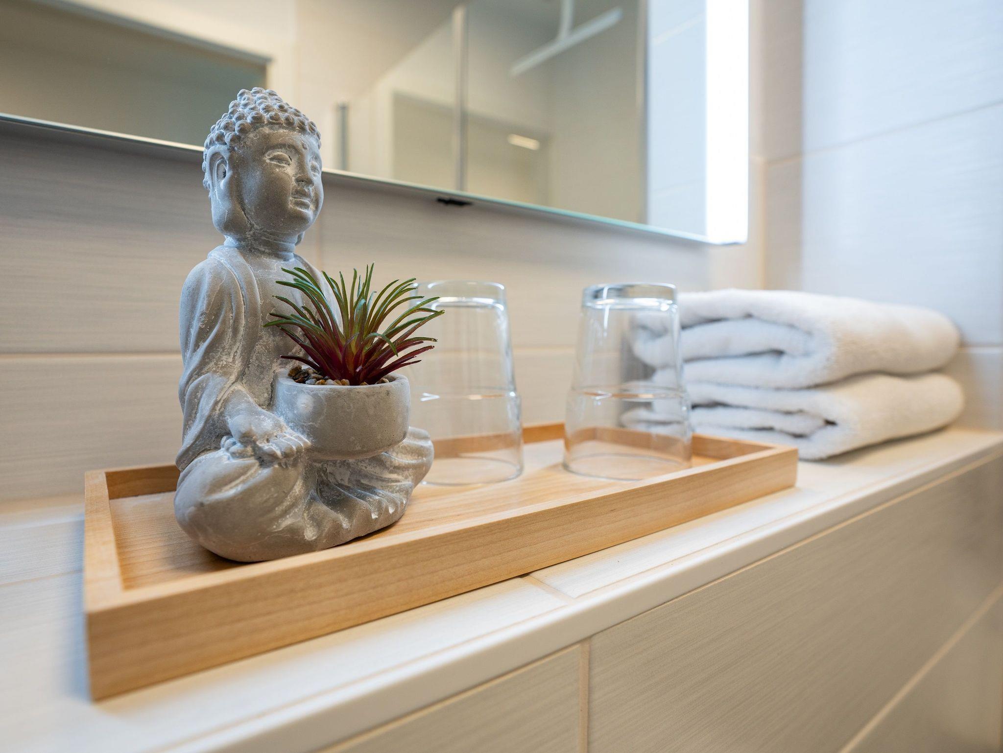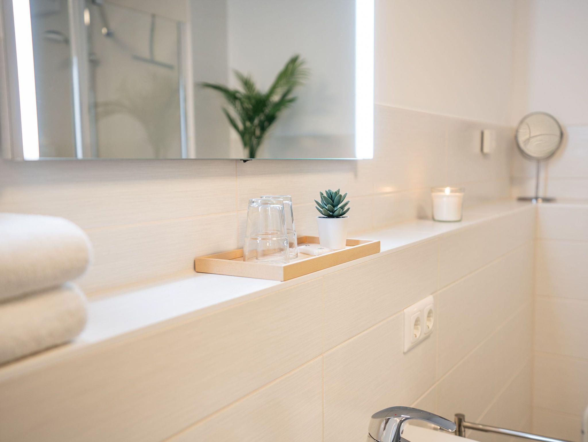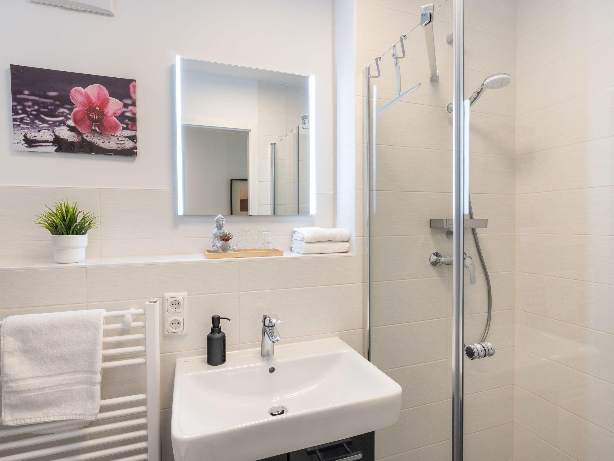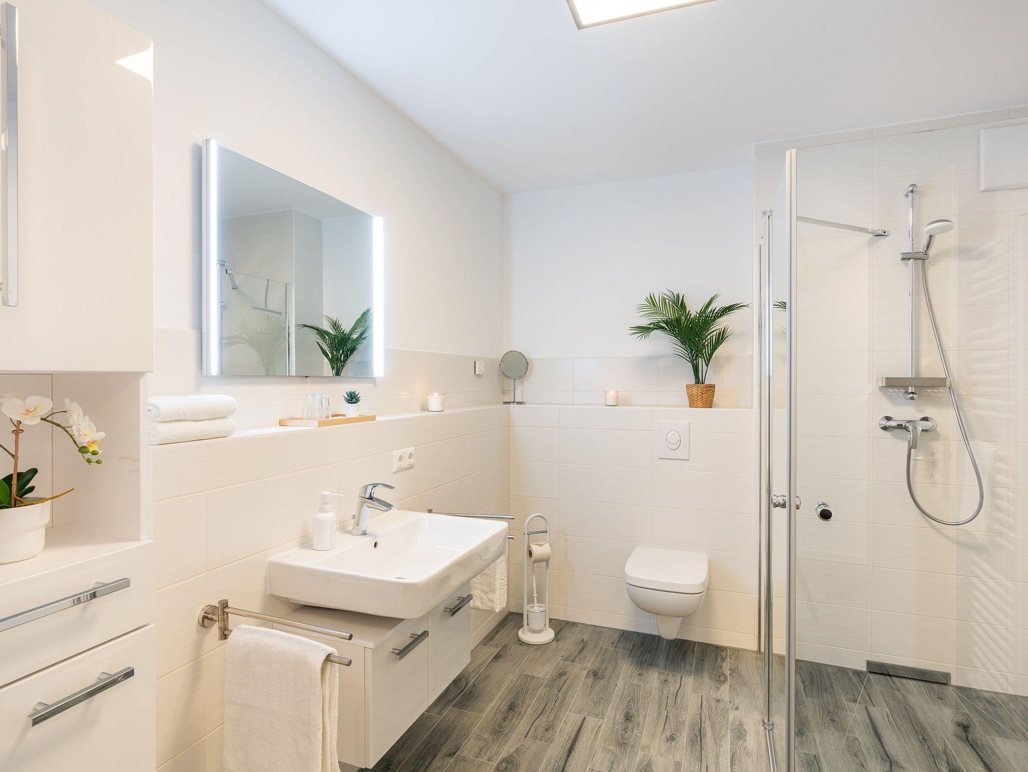 Die beiden vollausgestatteten Badezimmer verfügen jeweils über eine ebenerdige Dusche, WC, Waschtischanlage sowie Fön.