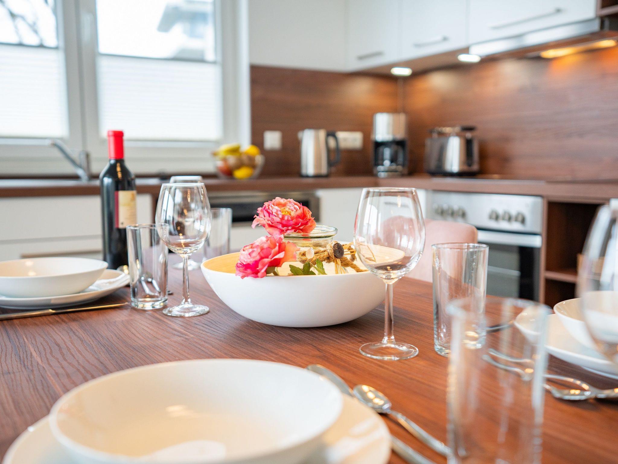 Die Küchenzeile verfügt über hochwertige Geräte wie Herd, Backofen, Kühl- und Gefrierschrank, Kaffeemaschine, Tassimo-Kapselmaschine sowie Spülmaschine. Ausreichend Geschirr, Besteck sowie Töpfe und Pfannen befinden sich in den Schränken. Am großen Esstisch finden Sie vor einem erholsamen Urlaubstag zu einem gemeinsamen Frühstück zusammen oder lassen den Tag bei einem guten Abendessen ausklingen.