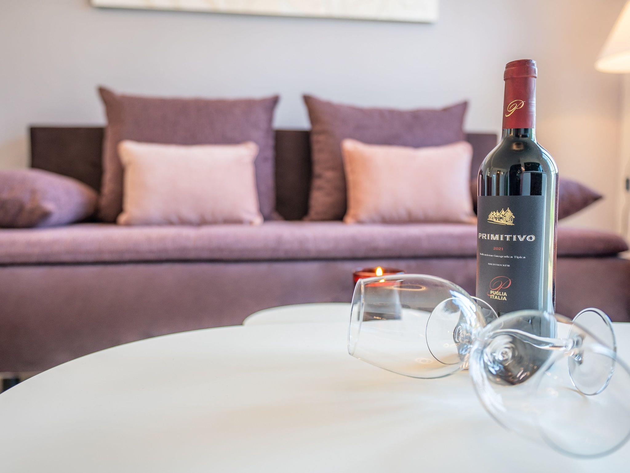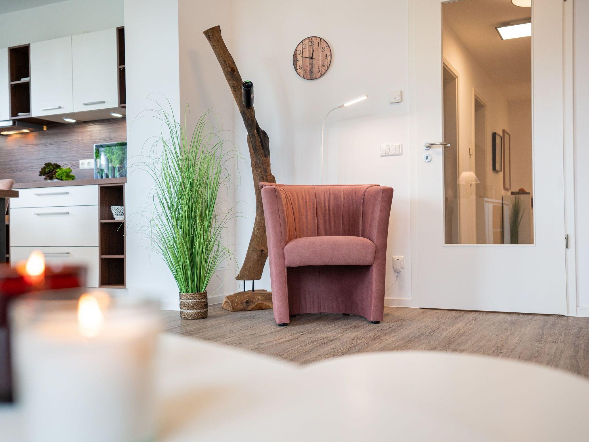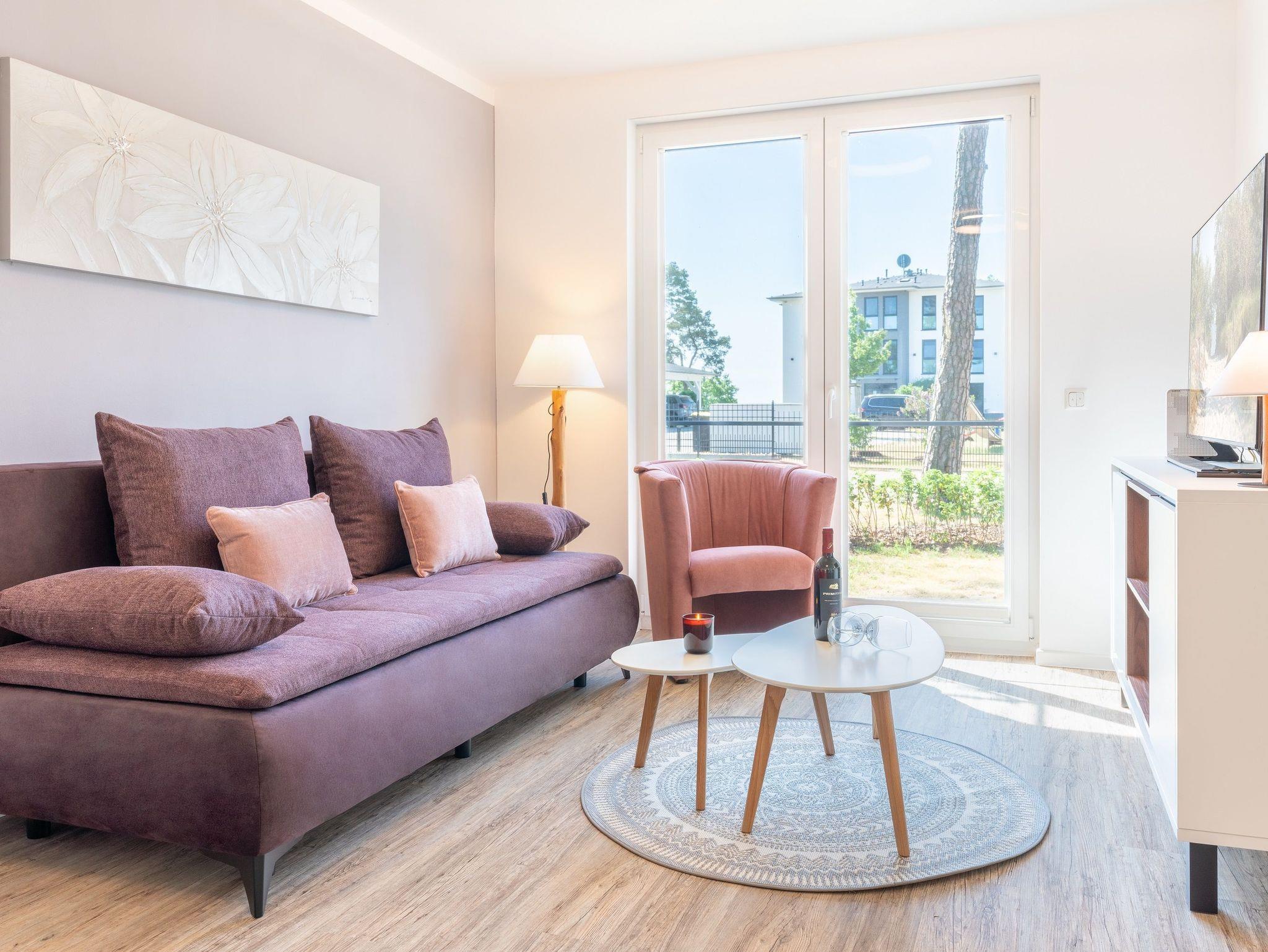 Der offen gestaltete Wohnbereich ist mit einem Sofa sowie zwei Sesseln und Smart-TV ausgestattet. Sie haben vom Wohnzimmer aus Zugang zur Südwest-Terrasse. Genießen Sie Ihre Speisen auf der möblierten Terrasse mit traumhaften Ausblicken in die Gartenanlage.