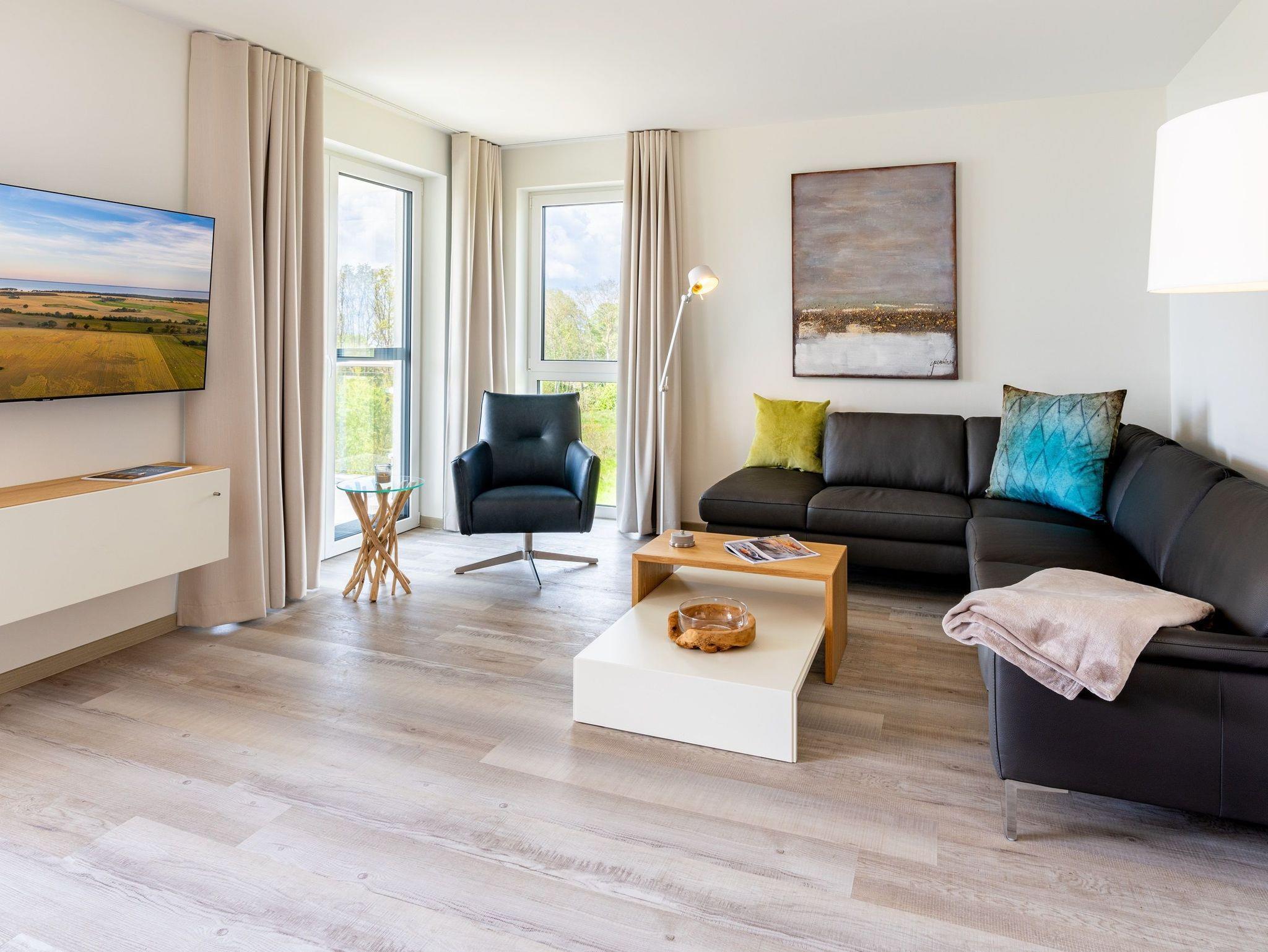 Diese im Jahr 2024 fertiggestellte Ferienwohnung verfügt über eine Wohnfläche von 115 m² und befindet sich im Haus 8, das etwa 400 Meter von den anderen „Oase am Haff“-Häusern entfernt auf einem separaten Grundstück in gleicher Südlage liegt.