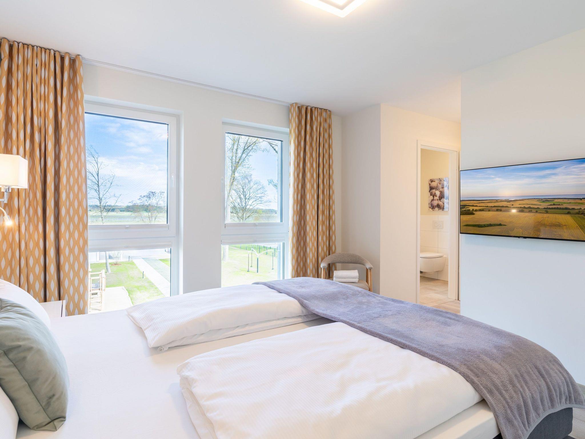 Das Hauptschlafzimmer bietet ein hochwertiges Boxspringbett (180 x 200 cm), einen Kleiderschrank sowie einen Smart-TV. Das en suite Badezimmer mit begehbarer Dusche rundet den Komfort ab.