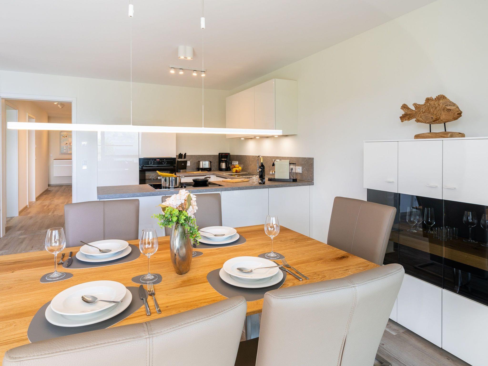 Eine Essgruppe mit Lederstühlen, ein bequemes Eckledersofa und ein Ledersessel vervollständigen die hochwertige und geschmackvolle Einrichtung.
