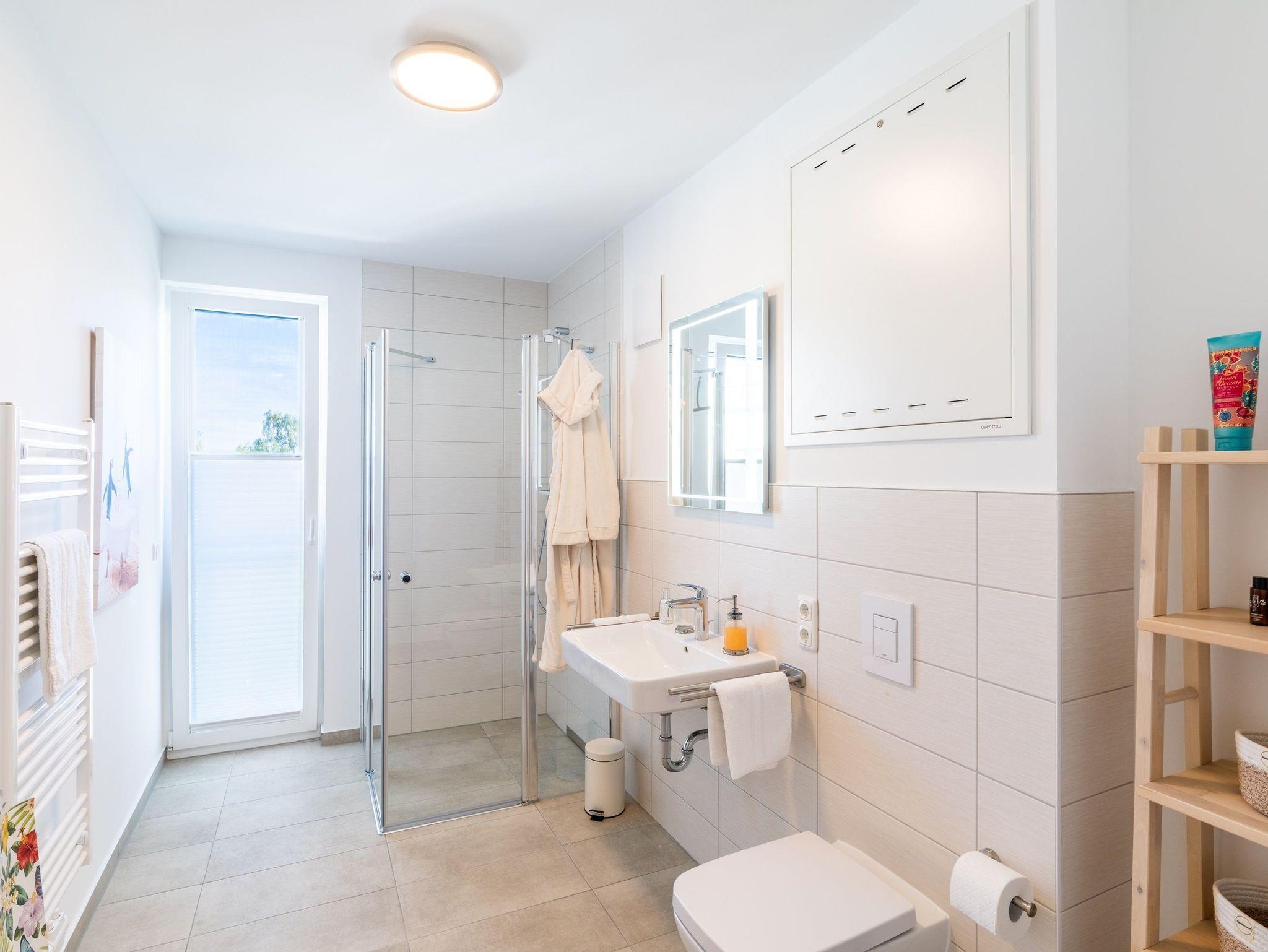 Das vollausgestattete Badezimmer verfügt über eine ebenerdige Dusche, WC, Waschtischanlage sowie Fön.