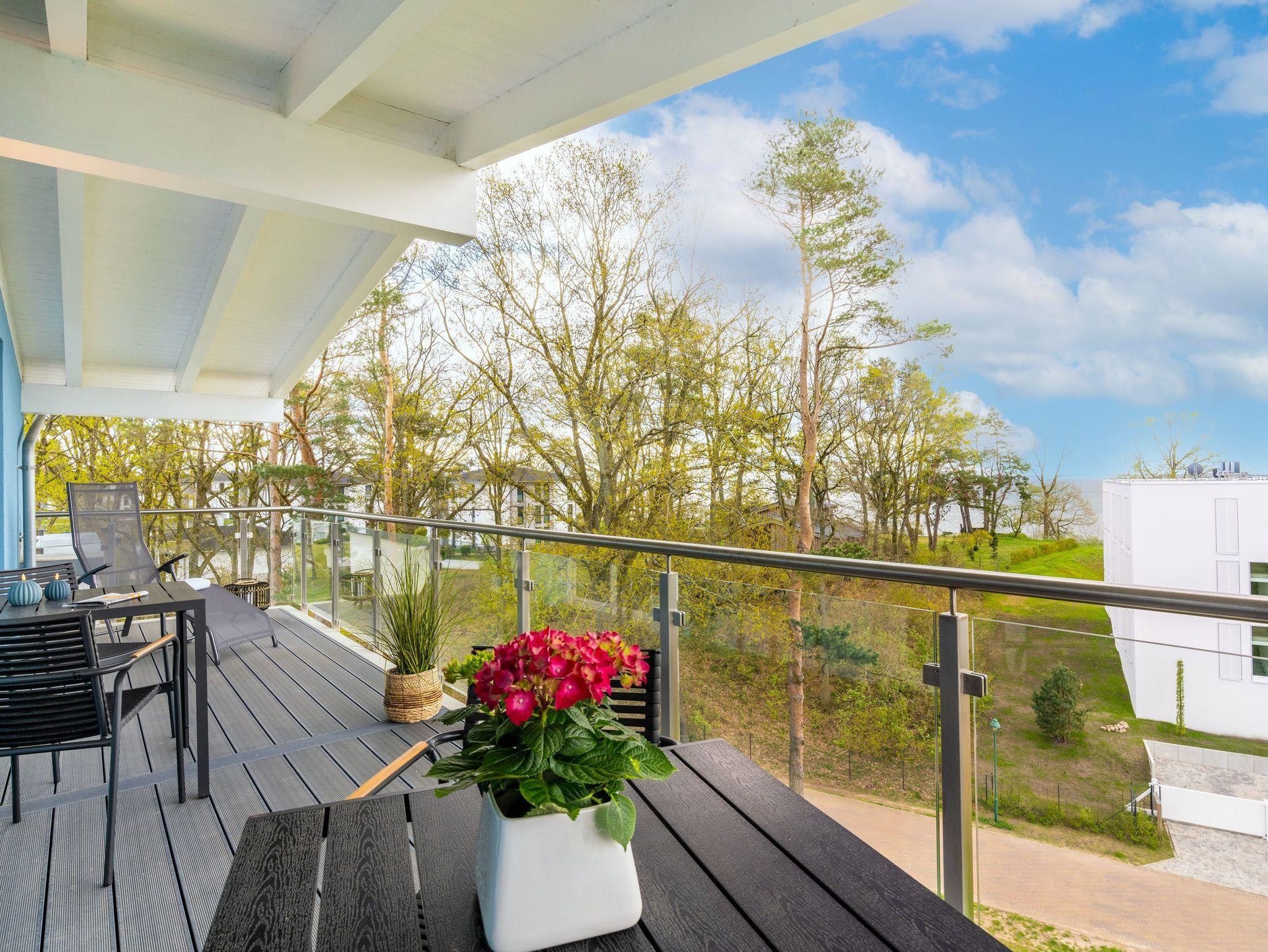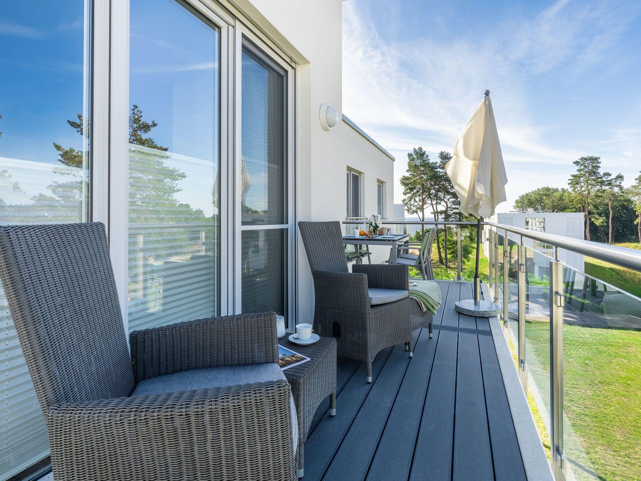 Der offen gestaltete Wohnbereich ist mit einem Sofa, Sessel und Smart-TV ausgestattet. Sie haben vom Wohnzimmer aus Zugang zum Südwest-Balkon. Der mit Sitzgelegenheiten und Relaxsesseln ausgestattete Balkon bietet mit traumhaften Ausblicken in die Parkanlage einen wunderschönen Ort, um Ihre Mahlzeiten zu genießen und die Aussicht zu bewundern.