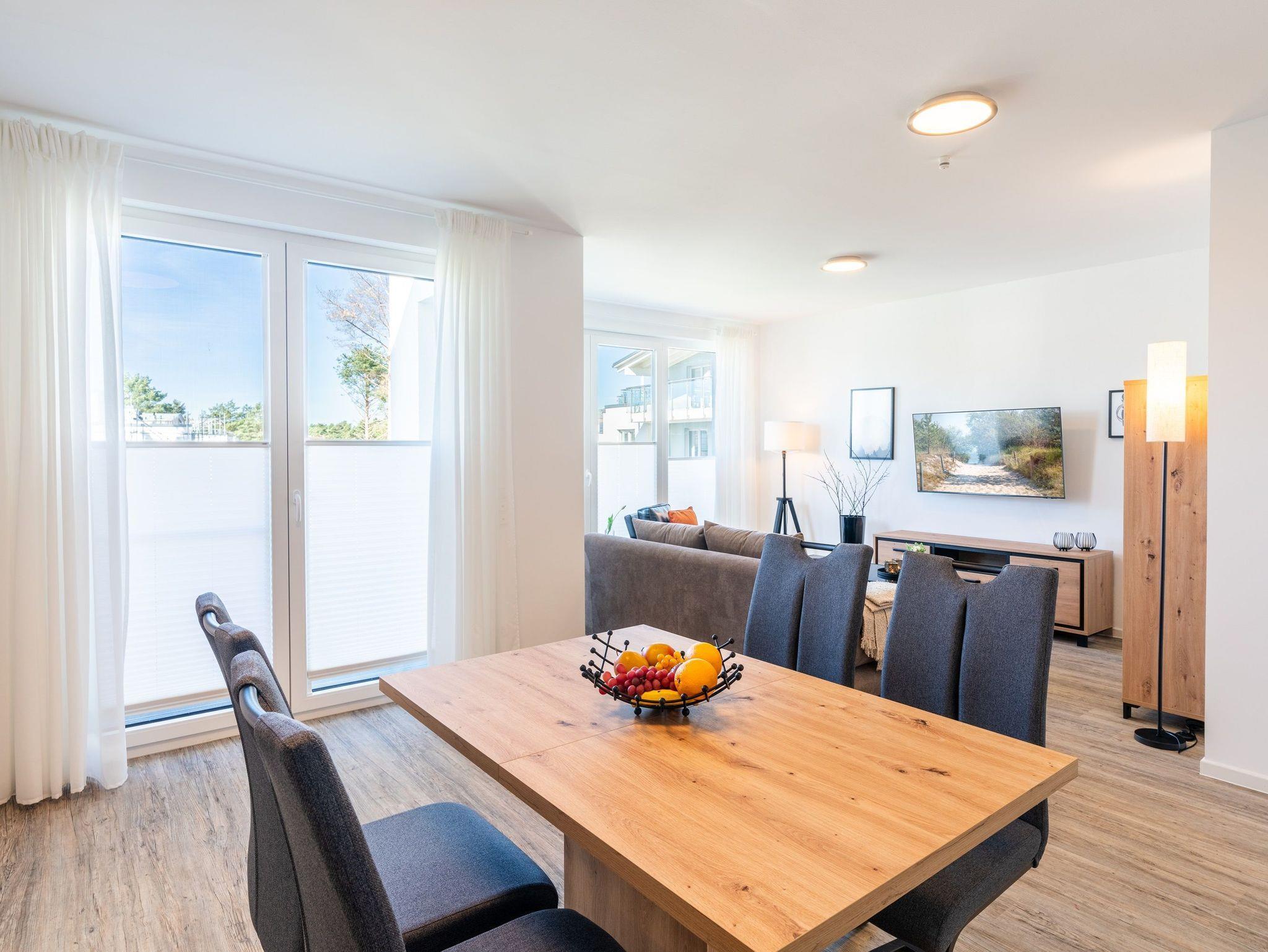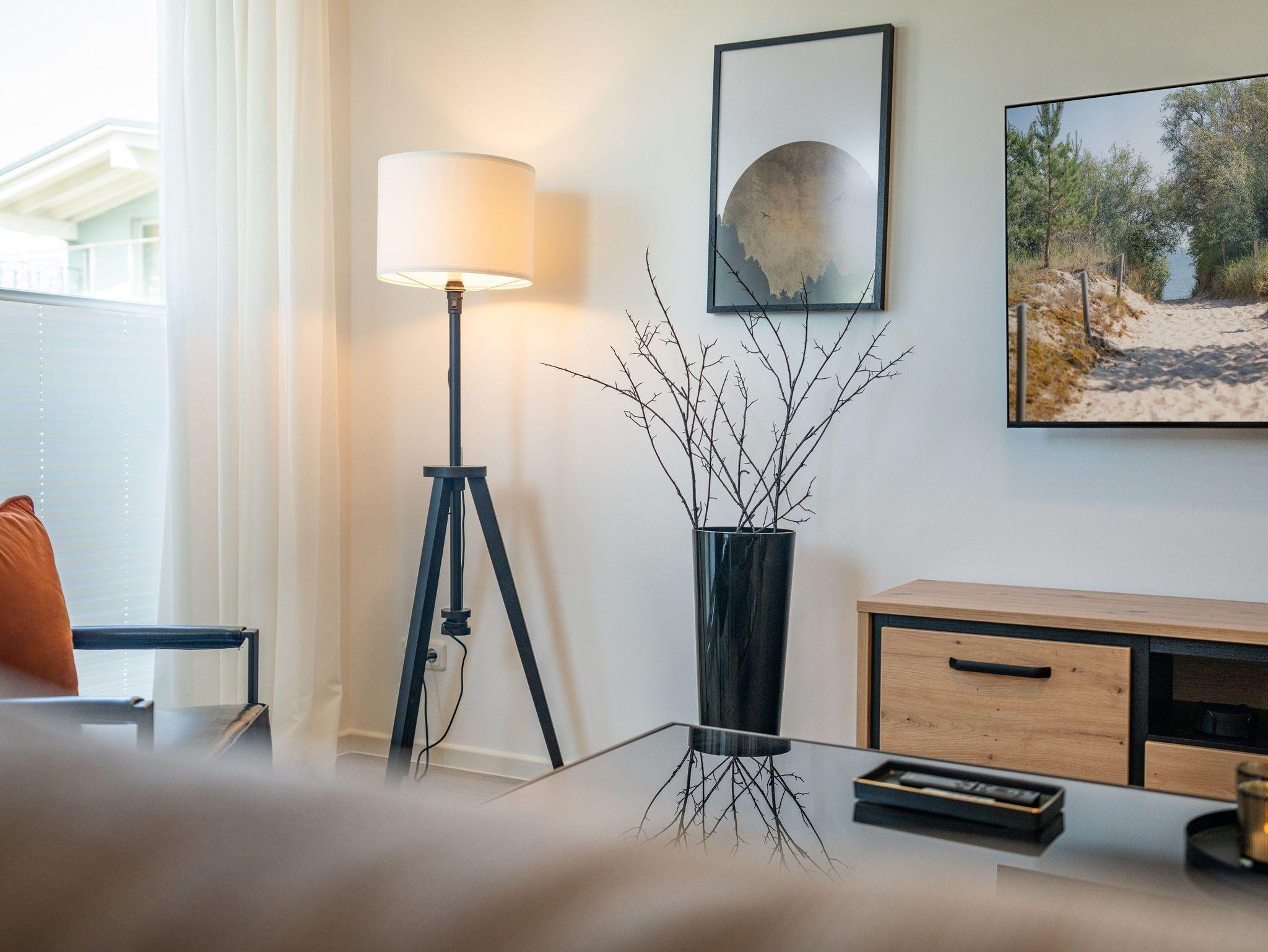 Auf einer Wohnfläche von 70 m² finden drei Erwachsene und ein Kleinkind bis zwei Jahre (im Babybett) in dieser modern eingerichteten Ferienwohnung ausreichend Platz für einen entspannten Urlaub am Stettiner Haff auf Usedom.