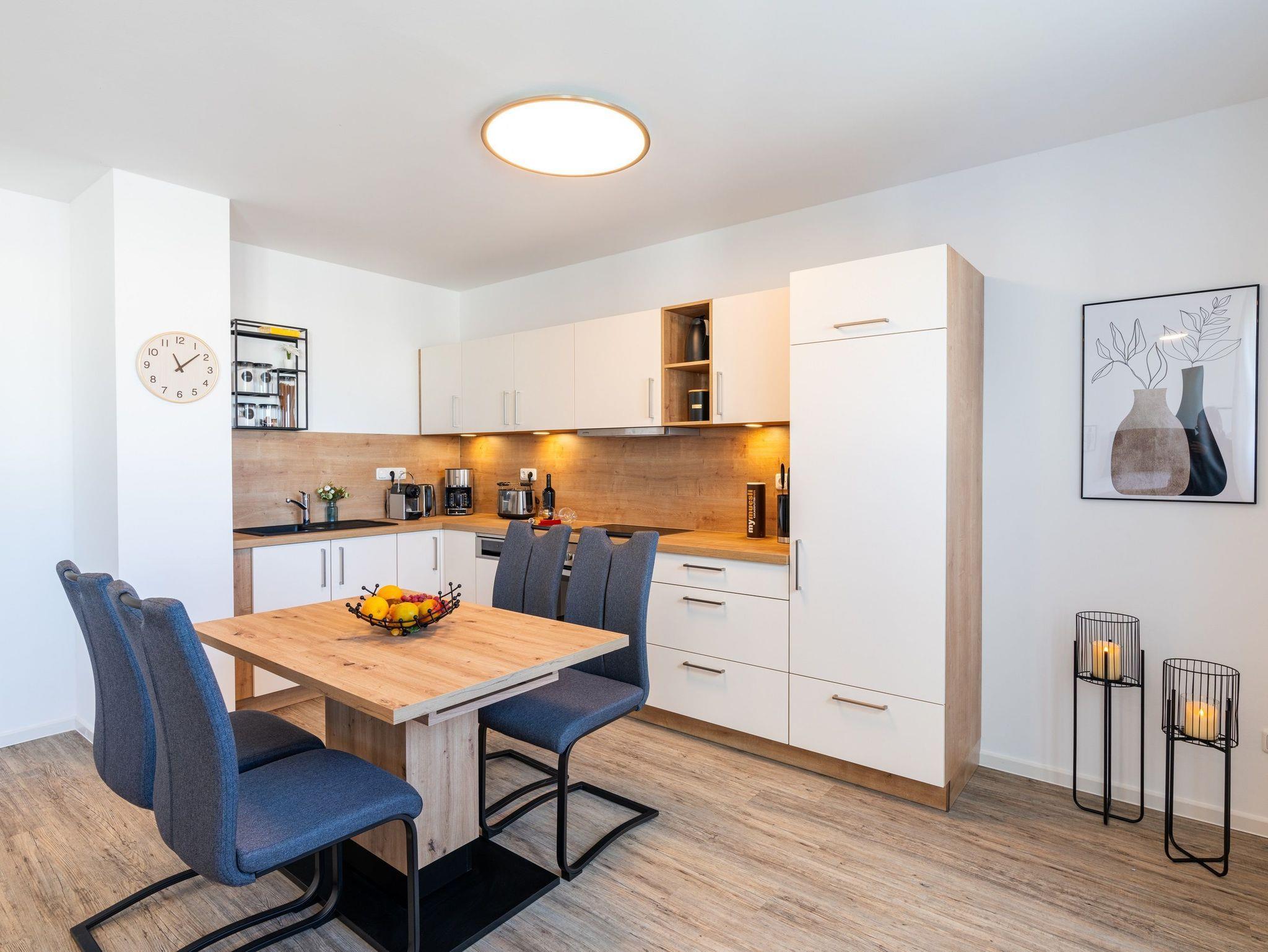 Die Küchenzeile verfügt über hochwertige Geräte wie Herd, Kaffeemaschine, Nespresso-Maschine, Backofen, Kühlschrank mit Gefrierfach sowie Spülmaschine. Ausreichend Geschirr, Besteck sowie Töpfe und Pfannen befinden sich in den Schränken. Am Esstisch finden Sie vor einem erholsamen Urlaubstag zu einem gemeinsamen Frühstück zusammen.