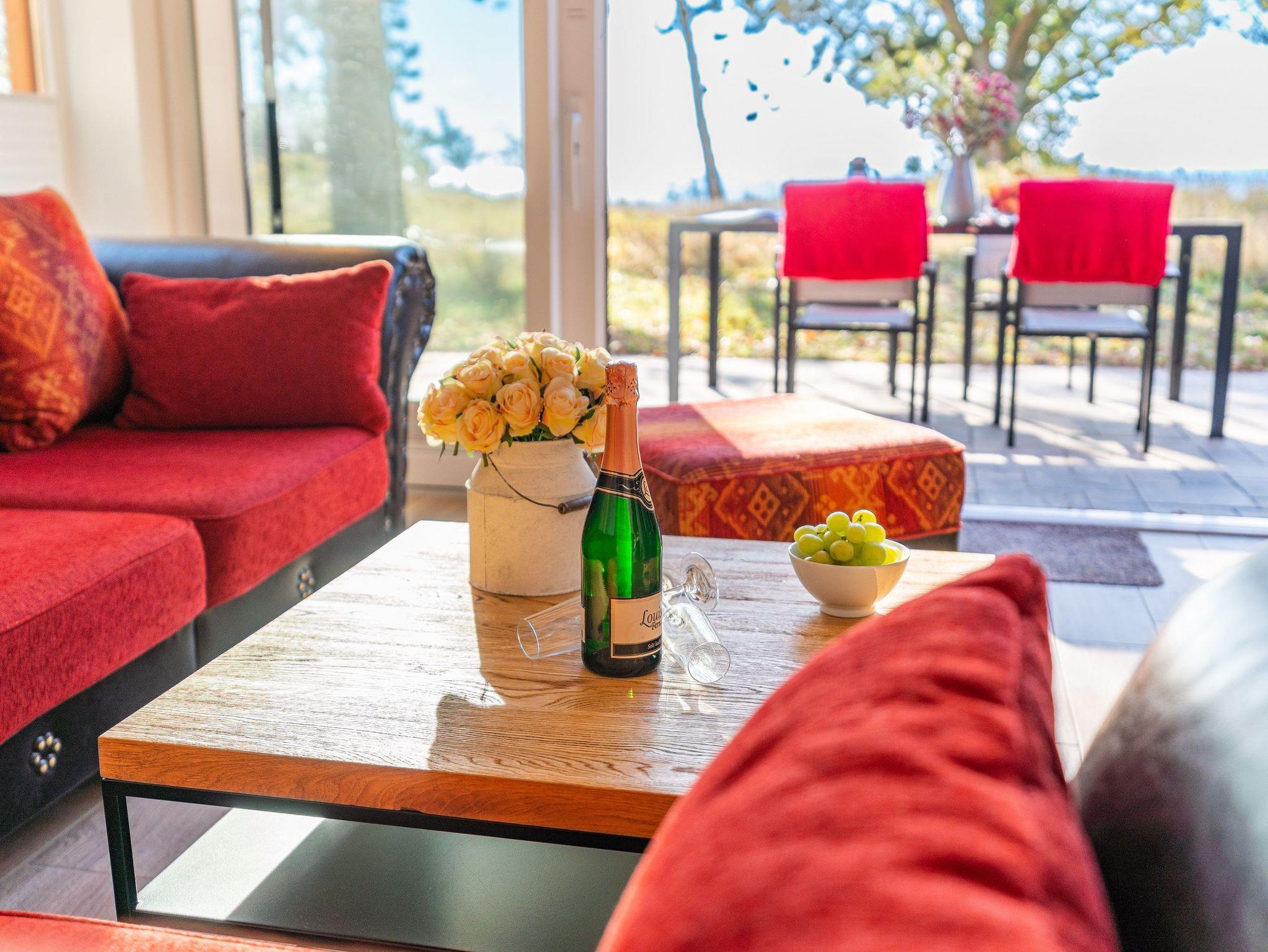 Über die schöne Holztreppe erreichen Sie das Obergeschoss. Hier steht Ihnen ein weiteres Wohnzimmer zur Verfügung. Der großartige Blick auf das Haff durch die bodentiefen Fenster wird Sie jeden Tag verzaubern. Im Obergeschoss befindet sich das zweite Schlafzimmer mit Doppelbett (1,80 x 2,00 m) sowie ein WC.