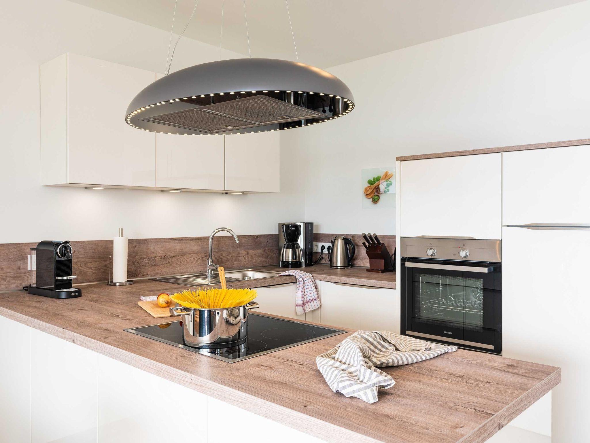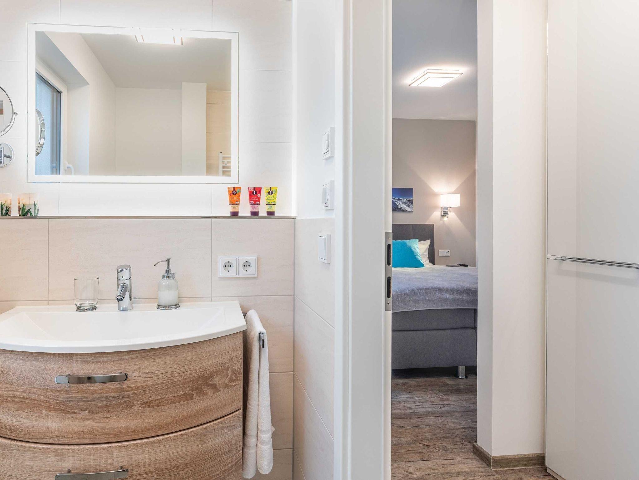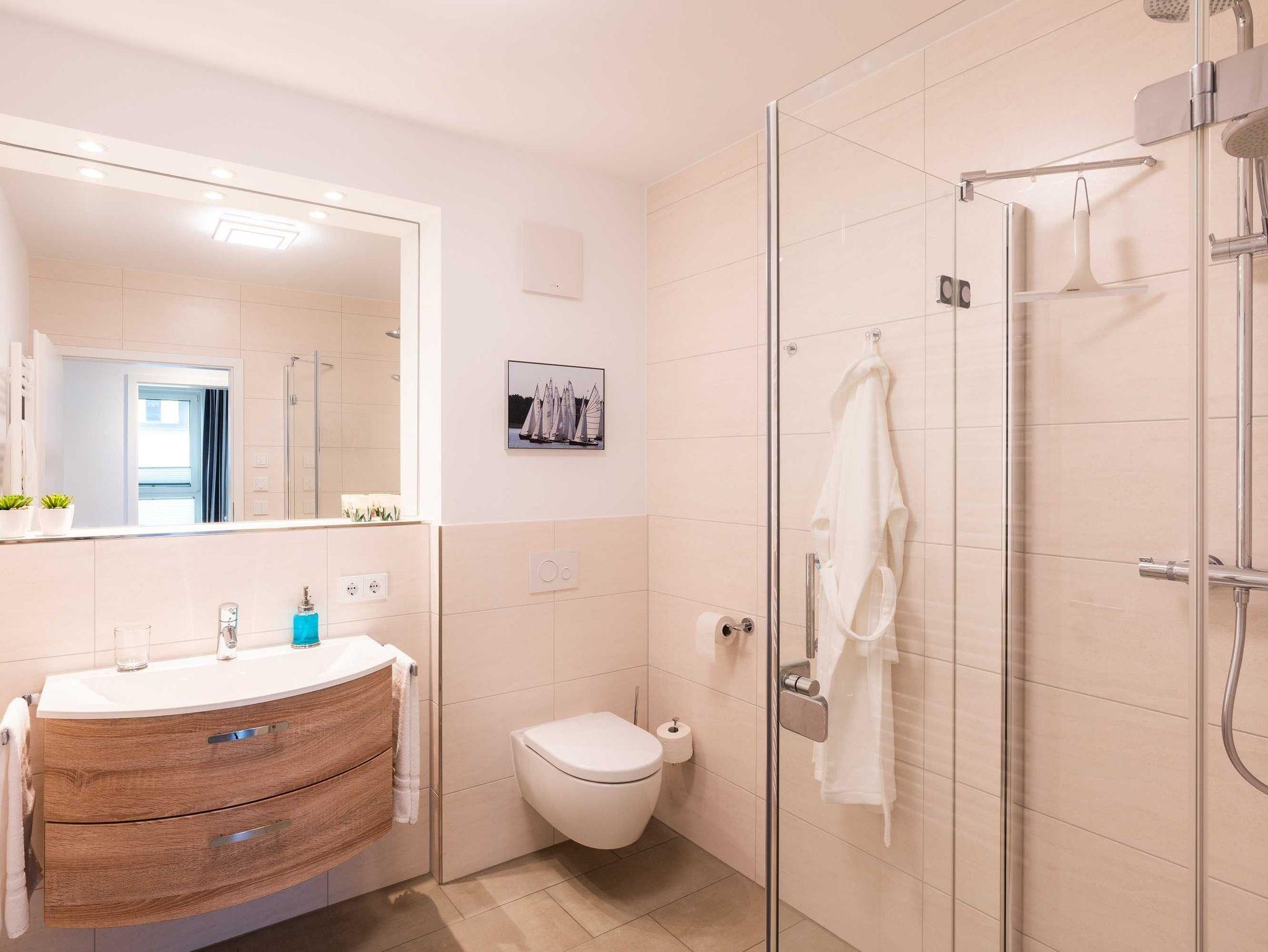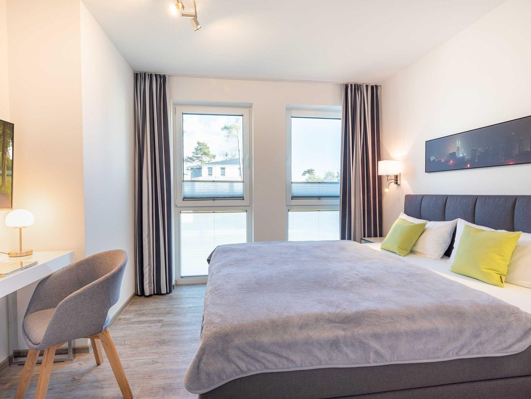Diese luxuriöse 4-Zimmer-Wohnung im ersten Obergeschoss von Haus 6 (Aufzug vorhanden) mit Platz für maximal 6 Personen verfügt über eine Wohnfläche von 100 m² und hat 3 Schlafzimmer sowie 2 voll ausgestattete Duschbäder. Die große Sonnenterrasse mit 17 m² liegt in idealer Süd-Ausrichtung. Die Wohnung ist modern eingerichtet mit offenem Wohn-Essbereich, großem Esstisch, Ledersofa sowie Smart-TV (inkl. Sky-Abo). Die hochwertig ausgestattete Küche, offen zum Wohnbereich, lässt keine Wünsche offen. Erholsamer Schlaf in den beiden Schlafzimmern mit Boxspringbetten und Smart-TV ist garantiert. Im dritten Schlafzimmer befindet sich ein bequemes Schlafsofa (Liegefläche: 1,60 x 2,00 m) und ein Smart-TV. Das Badezimmer en Suite ist mit einer begehbaren Dusche ausgestattet. Auf dem großen, überdachten Sonnenbalkon mit Essgruppe und zwei Relax-Sesseln, Fußhockern sowie einem Sonnenschirm können Sie die Seele baumeln lassen.