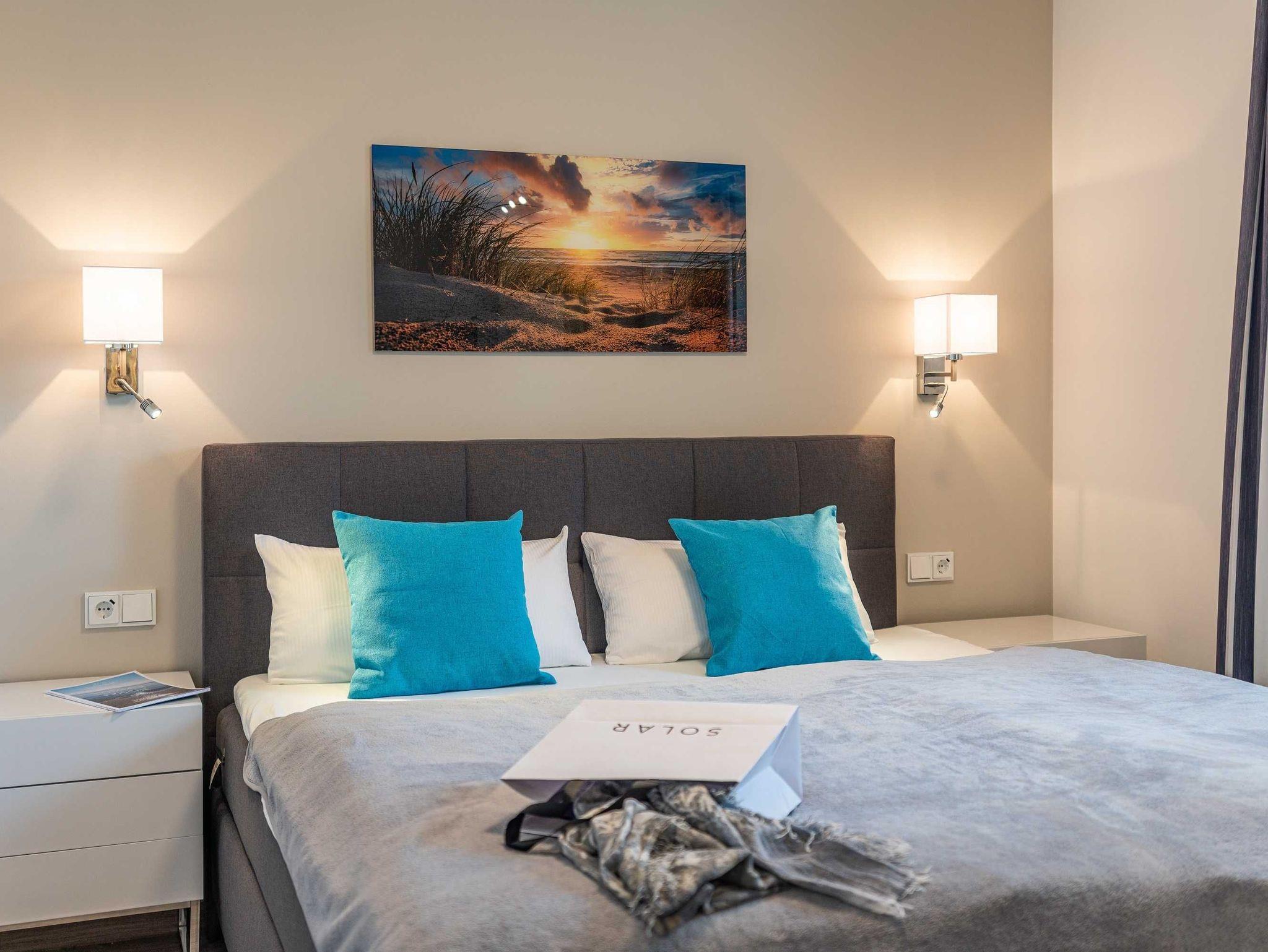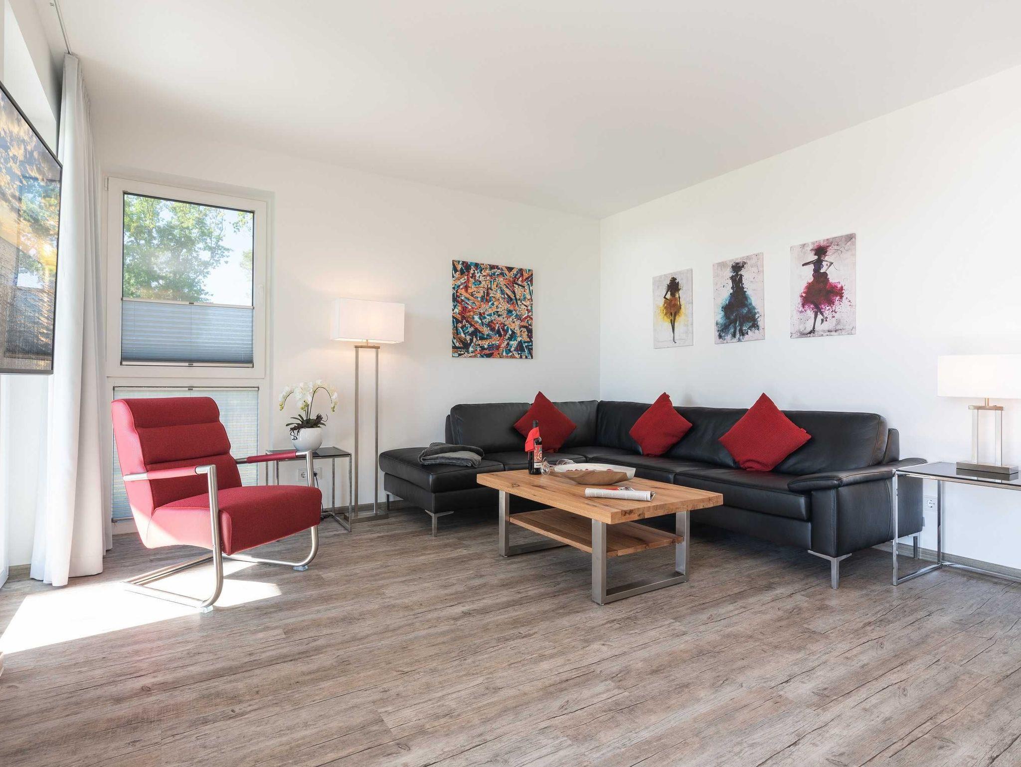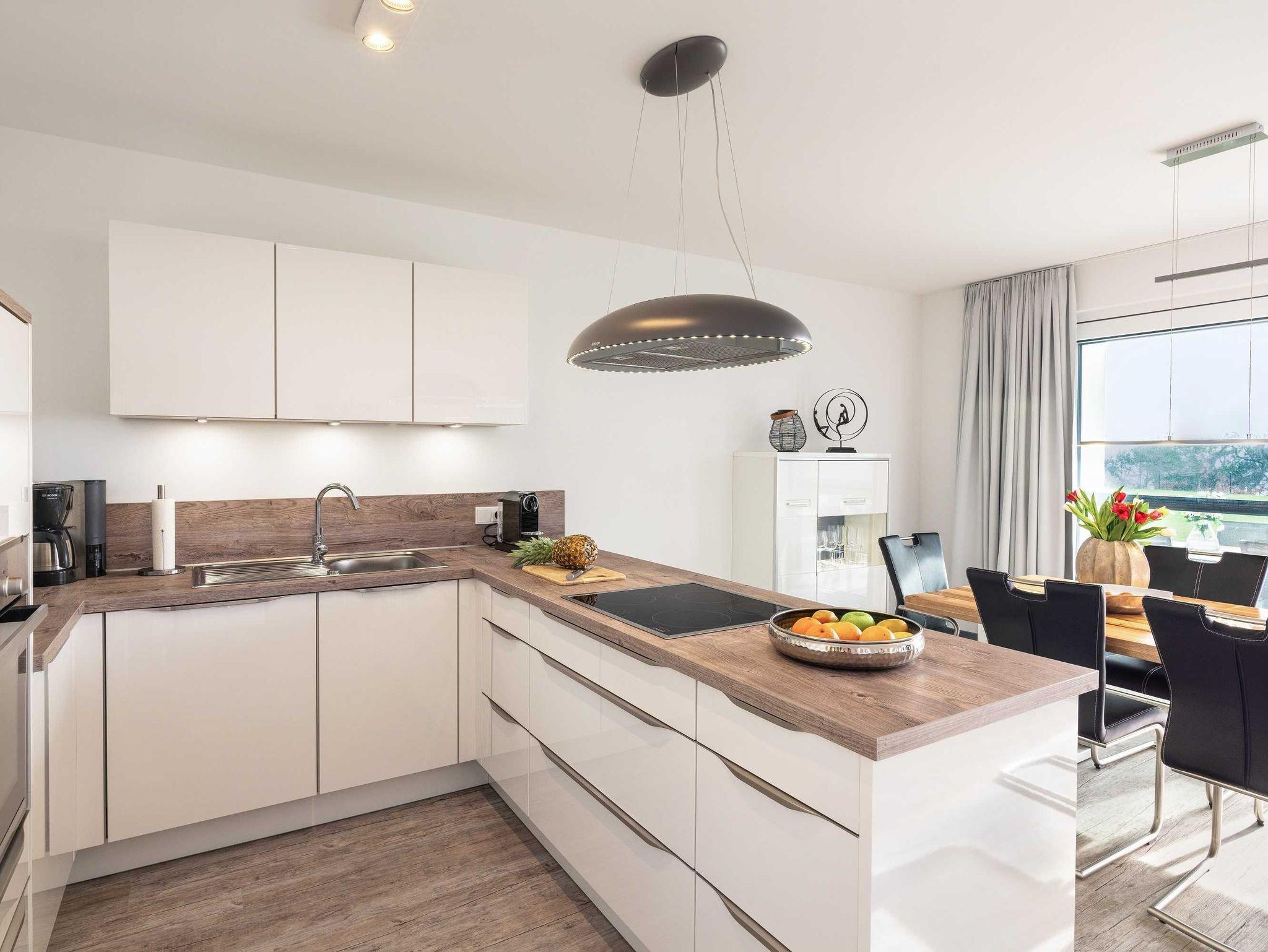 Diese luxuriöse 4-Zimmer-Wohnung im Erdgeschoss von Haus 7 mit Platz für maximal 6 Personen verfügt über eine Wohnfläche von 100 m² und hat 3 Schlafzimmer sowie 2 voll ausgestattete Duschbäder. Die große Sonnenterrasse mit 21 m² liegt in idealer Süd-Ausrichtung. Die Wohnung ist modern eingerichtet mit offenem Wohn-Essbereich, großem Esstisch, Ledersofa sowie Smart-TV (inkl. Sky-Abo). Die hochwertig ausgestattete Küche, offen zum Wohnbereich, lässt keine Wünsche offen. Erholsamer Schlaf in den beiden Schlafzimmern mit Boxspringbetten und Smart-TV ist garantiert. Im dritten Schlafzimmer befindet sich ein bequemes Schlafsofa (Liegefläche: 1,60 x 2,00 m) und ein Smart-TV. Das Badezimmer en Suite ist mit einer begehbaren Dusche ausgestattet. Auf der großen, überdachten Sonnenterrasse mit Essgruppe und jeweils zwei Relax-Sesseln, Fußhockern, Sonnenschirm und Sonnenliegen können Sie die Seele baumeln lassen.