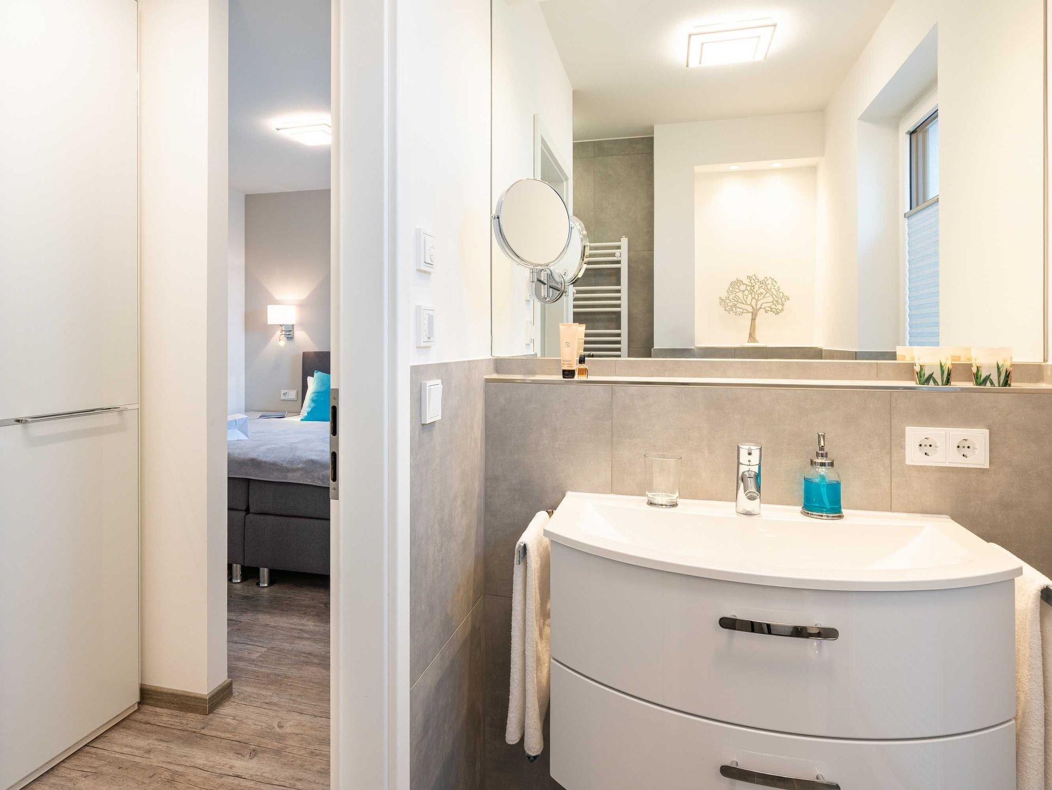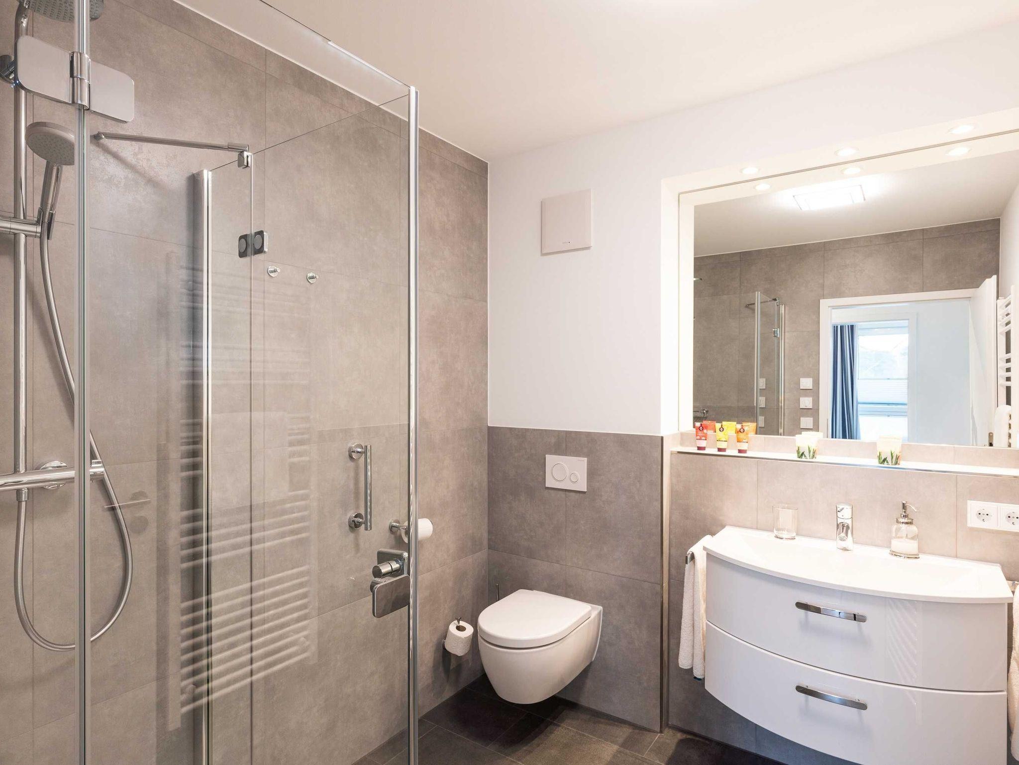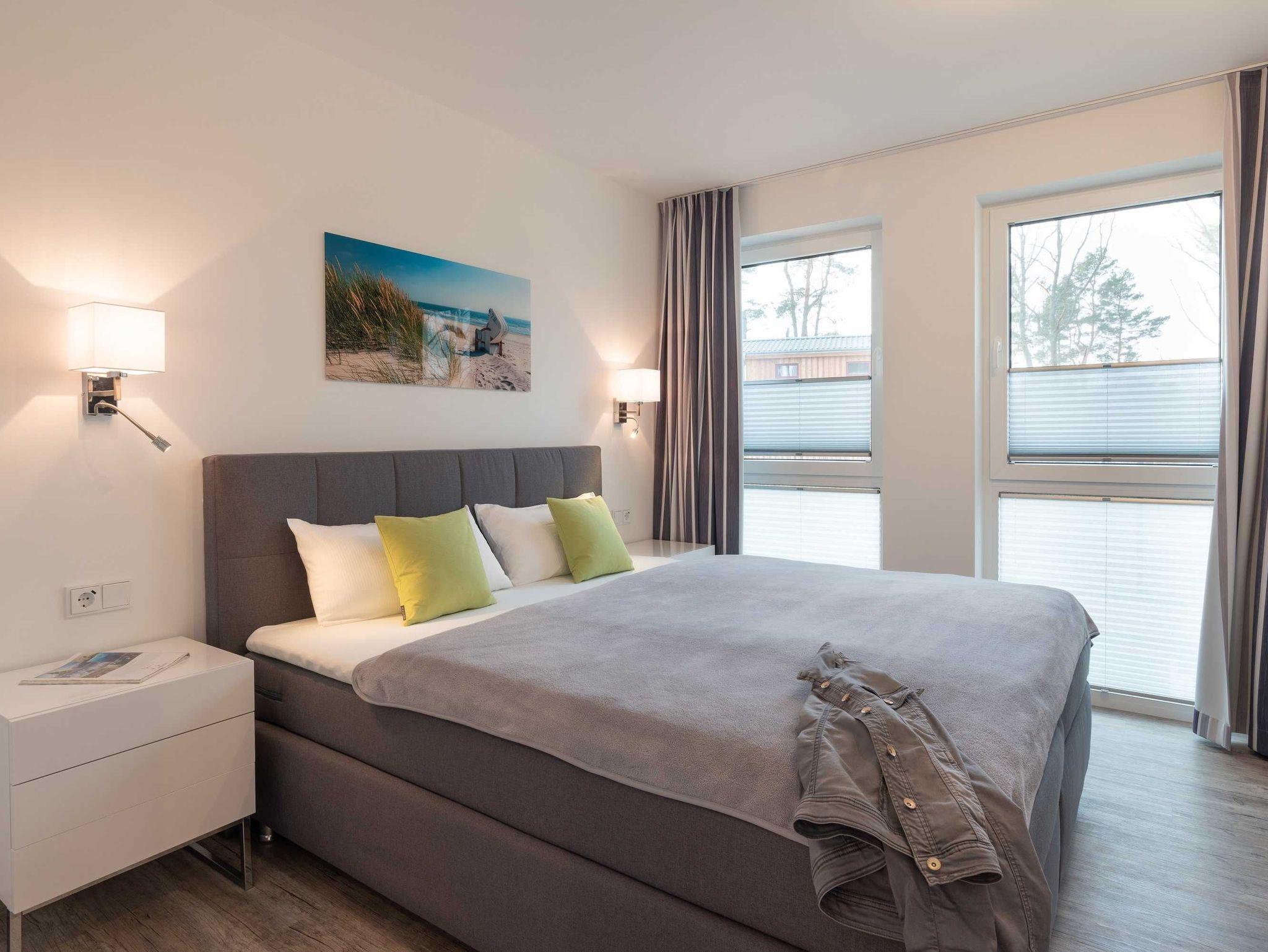 Diese luxuriöse 4-Zimmer-Wohnung im Erdgeschoss von Haus 7 mit Platz für maximal 6 Personen verfügt über eine Wohnfläche von 100 m² und hat 3 Schlafzimmer sowie 2 voll ausgestattete Duschbäder. Die große Sonnenterrasse mit 21 m² liegt in idealer Süd-Ausrichtung. Die Wohnung ist modern eingerichtet mit offenem Wohn-Essbereich, großem Esstisch, Ledersofa sowie Smart-TV (inkl. Sky-Abo). Die hochwertig ausgestattete Küche, offen zum Wohnbereich, lässt keine Wünsche offen. Erholsamer Schlaf in den beiden Schlafzimmern mit Boxspringbetten und Smart-TV ist garantiert. Im dritten Schlafzimmer befindet sich ein bequemes Schlafsofa (Liegefläche: 1,60 x 2,00 m) und ein Smart-TV. Das Badezimmer en Suite ist mit einer begehbaren Dusche ausgestattet. Auf der großen, überdachten Sonnenterrasse mit Essgruppe und jeweils zwei Relax-Sesseln, Fußhockern, Sonnenschirm und Sonnenliegen können Sie die Seele baumeln lassen.