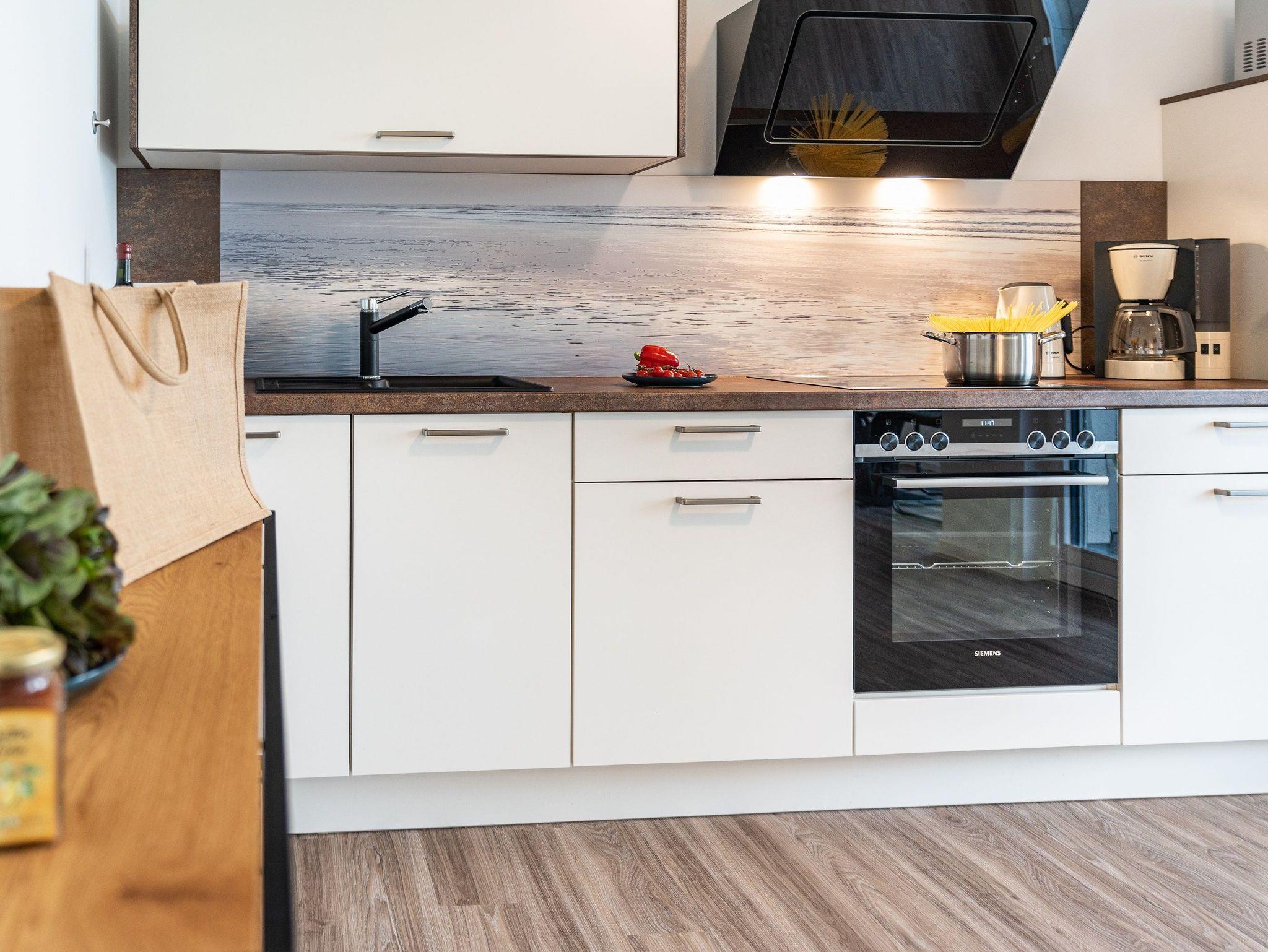 Die Küchenzeile verfügt über hochwertige Geräte wie Herd, Backofen, Mikrowelle, Kühl- und Gefrierschrank, Kaffeemaschine, Tassimo-Kapselmaschine sowie Spülmaschine. Ausreichend Geschirr, Besteck sowie Töpfe und Pfannen befinden sich in den Schränken. Am großen Esstisch finden Sie vor einem erholsamen Urlaubstag zu einem gemeinsamen Frühstück zusammen.