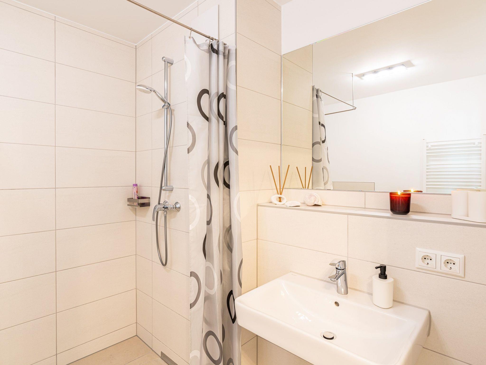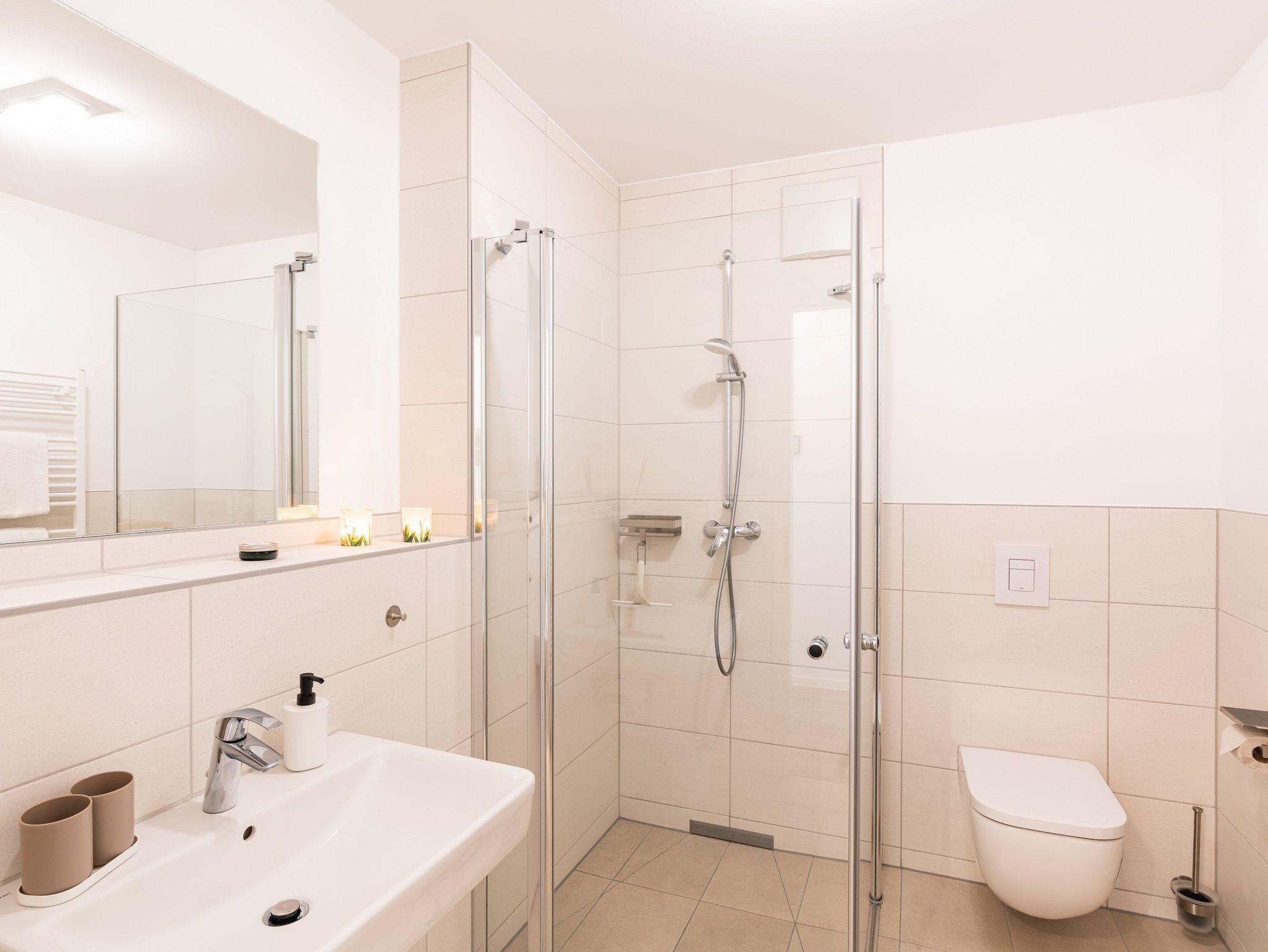 Die beiden vollausgestatteten Badezimmer verfügen jeweils über eine ebenerdige Dusche, WC, Waschtischanlage sowie Fön.