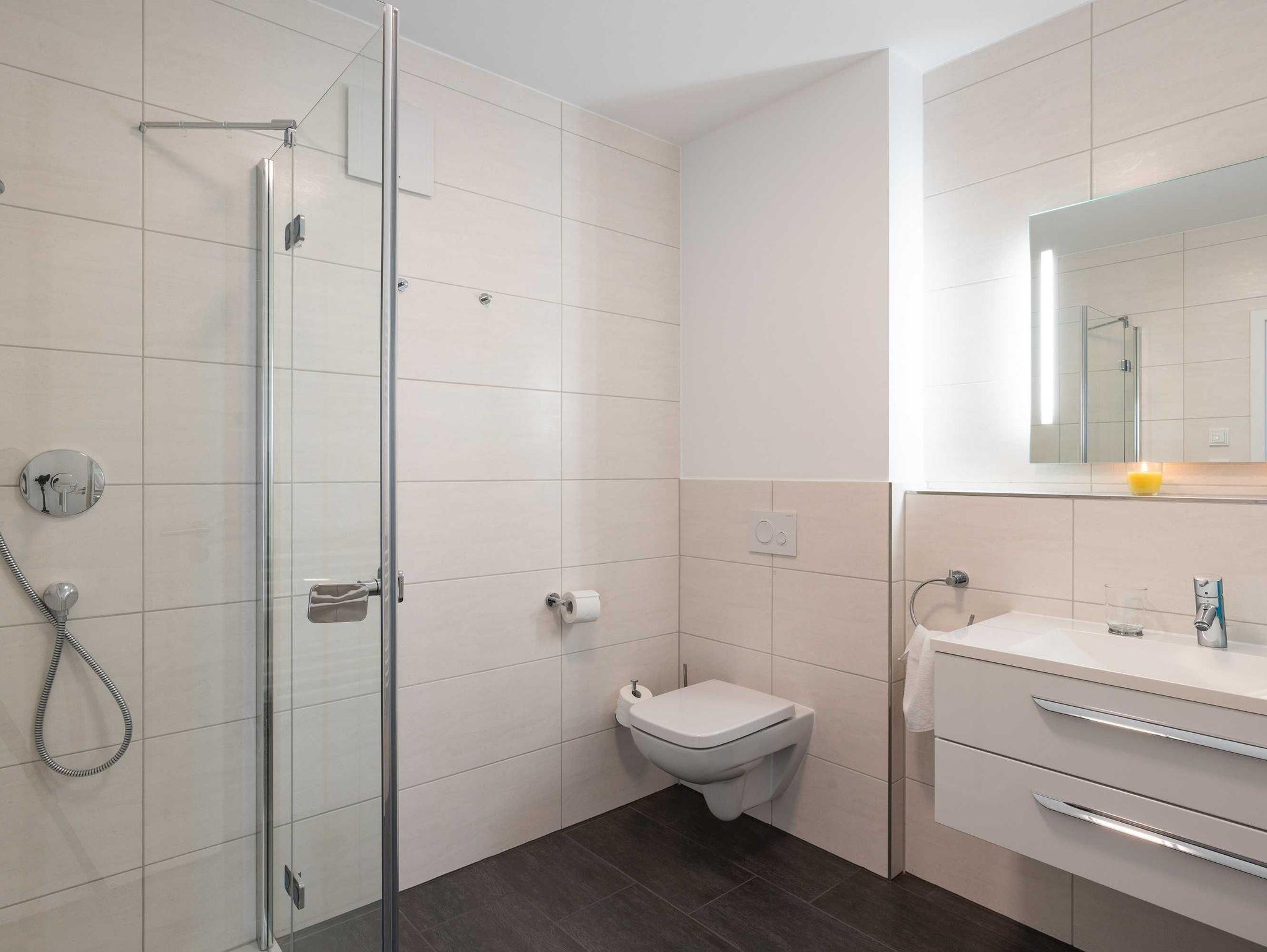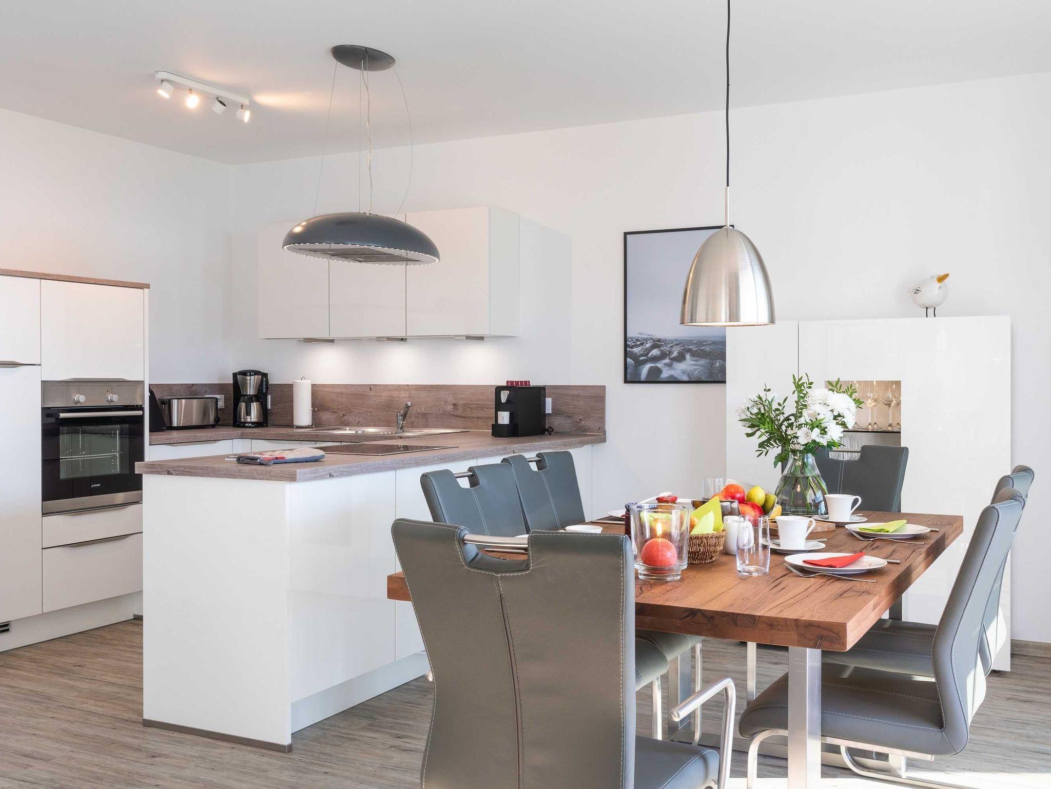 Diese luxuriöse 4-Zimmer-Wohnung im ersten Obergeschoss von Haus 3 (Aufzug vorhanden) mit Platz für maximal 6 Personen sowie einem Kleinkind bis 2 Jahre im Babybett verfügt über eine Wohnfläche von 119 m² und hat 3 Schlafzimmer sowie 2 voll ausgestattete Duschbäder. Die große Sonnenterrasse mit 17 m² liegt in idealer Süd-Ausrichtung. Die Wohnung ist modern eingerichtet mit offenem Wohn-Essbereich, großem Esstisch, Ledersofa sowie Smart-TV (inkl. Sky-Abo). Die hochwertig ausgestattete Küche, offen zum Wohnbereich, lässt keine Wünsche offen. Erholsamer Schlaf in den beiden Schlafzimmern mit Boxspringbetten und Smart-TV ist garantiert. Im dritten Schlafzimmer befindet sich ein bequemes Schlafsofa (Liegefläche: 1,80 x 2,00 m) und ein Smart-TV. Das Badezimmer en Suite ist mit einer begehbaren Dusche ausgestattet. Auf dem großen, überdachten Sonnenbalkon mit Essgruppe und zwei Relax-Sesseln, Fußhockern sowie einem Sonnenschirm können Sie die Seele baumeln lassen.